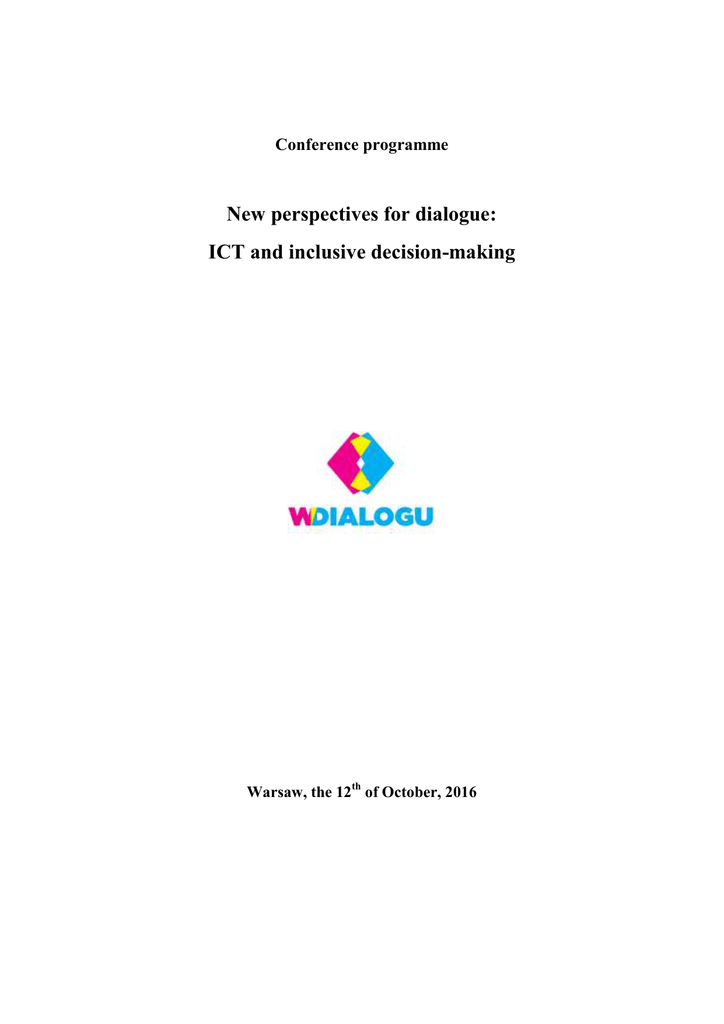Conference programme New perspectives for dialogue: ICT and inclusive decision-making Warsaw, the 12th of October, 2016 Opening of the conference (10:00am-10:10am) Opening address: Andrzej Waśkiewicz (University of Warsaw) Designing for deliberation – discussion panel (10:10am-11:30am) Moderator: Anna Przybylska (University of Warsaw) Participants: Todd Davies (Stanford University), Cyril Velikanov (Memorial Society, Moscow), Weiyu Zhang (National University of Singapore) Coffee break (11:30am-11:40am) “In Dialogue” for cities and citizens – presentations (11:40am-1:10pm) Moderator: Tomasz Potkański (Association of Polish Cities) Participants: Piotr Andruszkiewicz (Warsaw University of Technology), Izabela Mrochen (Polish Forum of Disabled Persons), Anna Przybylska (Warsaw University), Aneta Świercz (Warsaw University of Technology) Coffee break (1:10pm-1:50pm) ICT & participatory approach to public dilemmas – presentations (1:50pm-3:20pm) Moderator: Artur Krawczyk (“Cities on Internet” Association) Participants: Hanna Hasselqvist (KTH Royal Institute of Technology), Tatsuro Sakano (Tokyo Institute of Technology), Joanna Średnicka (Competence Game), Jakub Wygnański (Foundation “Stocznia”) Coffee break (3:20pm-3:30pm) Absorption of innovations – discussion panel (3:30pm-5:00pm) Moderator: Tomasz Kulisiewicz (Centre for Studies on Digital Government) Participants: Joanna Makocka (National Centre for Research and Development), Krzysztof Mączewski and Andrzej Perkowski (Office of the Marshal of the Mazowieckie Voivodeship), Tomasz Potkański (Association of Polish Cities), Krzysztof Suchowiecki (Forum for Development of Olsztyn), Aneta Szpaderska (City Hall of Olsztyn) ICT in applied projects – multimedia presentations, room 315 (9:30am-5:00pm) In Dialogue, Marta Kołodziejska (University of Warsaw) Online Deliberation Singapore (OD_SG), Weiyu Zhang (National University of Singapore) Collective energy management in Swedish housing cooperatives, Hanna Hasselqvist (KTH Royal Institute of Technology) Closing of the conference (5:00pm-5:10pm) Closing address: Anna Przybylska (University of Warsaw)