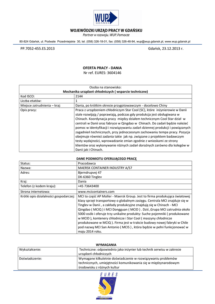 80-824 Gdańsk, ul. Podwale Przedmiejskie 30, tel. (058) 326-18-01, fax: (058) 326-48-94, [email protected], www.wup.gdansk.pl PP.7052-455.ES.2013 Gdańsk, 23.12.2013 r. OFERTA PRACY - DANIA Nr ref. EURES: 3604146 Osoba na stanowisko: Mechanika urządzeń chłodniczych ( wsparcie techniczne) Kod ISCO: 2144 Liczba etatów: 1 Miejsce zatrudnienia – kraj: Dania, po krótkim okresie przygotowawczym - docelowo Chiny Opis pracy: Praca z urządzeniem chłodniczym Star Cool (SC), które inżynierowie w Danii stale rozwijają / poprawiają, podczas gdy produkcja jest obsługiwana w Chinach. Koordynacja pracy między działem technicznym Cool Star dział w centrali w Danii oraz fabryce w Qingdao w Chinach. Do zadań będzie należeć pomoc w identyfikacji i rozwiązywaniu zadań dziennej produkcji i powiązanych zagadnień technicznych, przy jednoczesnym zachowaniu tempa pracy. Pozycja obejmuje również zadania takie jak np. związane z projektem badawczym testy wydajności, wprowadzanie zmian zgodnie z wnioskami ze strony klientów oraz wykonywanie różnych zadań doraźnych zarówno dla kolegów w Danii jak i Chinach. Status: Nazwa: Adres: Kraj: Telefon (z kodem kraju): DANE PODMIOTU OFERUJĄCEGO PRACĘ Pracodawca MAERSK CONTAINER INDUSTRY A/S7 Bjerndrupvej 47 DK-6360 Tinglev Dania +45 73643400 Strona internetowa: www.mcicontainers.com Krótki opis działalności gospodarczej: MCI to część AP Moller - Maersk Group. Jest to firma produkująca światowej klasy sprzęt transportowy o globalnym zasięgu. Centrala MCI znajduje się w Tinglev w Danii , a zakłady produkcyjne znajdują się w Chinach - MCI Qingdao ( MCIQ ) i MCI Dongguan ( MCID ) . Dziś ,Grupa MCI zatrudnia około 5000 osób i oferuje trzy unikalne produkty: Suche pojemniki ( produkowane w MCID ), kontenery chłodnicze i Star Cool ( maszyny chłodnicze produkowane w MCIQ ). Firma jest w trakcie budowy nowej fabryki w Chile pod nazwą MCI San Antonio ( MCIS ) , która będzie w pełni funkcjonować w maju 2014 roku. Wykształcenie: Doświadczenie: WYMAGANIA Techniczne: odpowiednio jako inżynier lub technik serwisu w zakresie urządzeń chłodniczych Wymagane kilkuletnie doświadczenie w rozwiązywaniu problemów technicznych, umiejętności komunikowania się w międzynarodowym środowisku z różnych kultur 80-824 Gdańsk, ul. Podwale Przedmiejskie 30, tel. (058) 326-18-01, fax: (058) 326-48-94, [email protected], www.wup.gdansk.pl Znajomość języków: Dodatkowe wymagania; Język Poziom Angielski Biegły Duński Nieokreślono Znajomość biegła j. angielskiego w mowie i piśmie. Znajomość języka jest warunkiem koniecznym i będzie weryfikowana podczas procesu rekrutacyjnego. Znajomość j. duńskiego będzie dodatkowym atutem. Stanowisko to wymaga stałej i niezależnej osoby o silnych umiejętnościach komunikacyjnych, zdolnościach mechanicznych. Poszukiwana jest osoba z dyplomatycznym podejściem i ukierunkowana na rozwiązanie zadań i problemów a jednocześnie koncentrująca się na osiągnięciu określonych celów , umiejąca utrzymać wysokie tempo pracy oraz wysoką jakość. WYNAGRODZENIE I WARUNKI ZATRUDNIENIA Od 4300 euro miesięcznie. Wysokość wynagrodzenia może być negocjowana indywidualnie w zależności od doświadczenia i kwalifikacji Waluta, w jakiej wypłacana jest pensja: Euro Rodzaj stawki wynagrodzenia: Miesięczna Nazwa firmy, z którą zostanie podpisana MAERSK CONTAINER INDUSTRY A/S7 umowa: Rodzaj umowy: Umowa o pracę Wymiar czasu pracy Pełen etat, 37 godzin tygodniowo Czas trwania umowy: nieokreślony Data rozpoczęcia: Do uzgodnienia z pracodawcą. Rozpoczęcie pracy okresem 2-3 miesięcy wprowadzania w centrali w Tinglev, gdzie koledzy ze Star Cool Engineering wprowadzą kandydata do pracy firmy, produktów firmy oraz metod pracy. Po okresie wprowadzającym pracownik będzie delegowany do pracy w Chinach na okres ok. 2-3 lat. Wysokość pensji brutto: SPOSÓB SKŁADANIA WNIOSKU Wymagane dokumenty Aplikacja on-line w języku angielskim. Język, w którym muszą być sporządzone przedkładane dokumenty: Do kogo należy wysłać dokumenty: Angielski Gdzie należy wysłać dokumenty: https://jobsearch.maersk.com/vacancies/publication?pinst=005056A30929 1EE398FFFB5FE535CB47 Do pracodawcy DODATKOWE INFORMACJE Więcej informacji udziela HR Consultant, Pani Maria Smits Hansen, Tel: +45 7364 3431. Wnioski kandydatów będą rozpatrywane na bieżąco, aż do wyłonienia odpowiedniego kandydata. Data publikacji: WAŻNOŚĆ 23.12.2013 80-824 Gdańsk, ul. Podwale Przedmiejskie 30, tel. (058) 326-18-01, fax: (058) 326-48-94, [email protected], www.wup.gdansk.pl Termin przedkładania podań o pracę / zakończenia ważności oferty: 21.01.2014 Uprzejmie informujemy, że skontaktujemy się wyłącznie z wybranymi kandydatami. UWAGA: 1. 2. 3. Umowa z zagranicznym pracodawcą zostanie zawarta zgodnie z prawem kraju zatrudnienia. Oznacza to, że wszystkie roszczenia odnośnie do warunków, które obejmuje umowa, można kierować wyłącznie do odpowiedniego sądu w kraju zatrudnienia. Publiczne służby zatrudnienia (EURES) nie mogą pośredniczyć ani reprezentować pracownika w sądzie kraju zatrudnienia w przypadku sporu z pracodawcą. Publiczne służby zatrudnienia (EURES) dokładają wszelkich starań, aby zapewnić rzetelność i wiarygodność ofert pracy zgłoszonych w lokalnym urzędzie pracy. Należy wyjaśnić, że oferta pracy została zgłoszona przez stronę trzecią i EURES nie odpowiada za ewentualne rozbieżności między warunkami pracy określonymi w ofercie pracy i warunkami oferowanymi przez potencjalnego pracodawcę. Publiczne służby zatrudnienia (EURES) informują, że będą zbierać, przetwarzać i przekazywać potencjalnym pracodawcom zgodnie z przepisami dotyczącymi ochrony danych osobowych wszystkie dane osobowe dostarczone przez osoby poszukujące pracy.