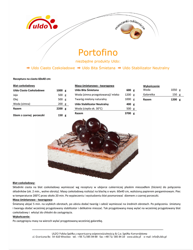 Portofino niezbędne produkty Uldo: Uldo Ciasto Czekoladowe Uldo Bita Śmietana Uldo Stabilizator Neutralny Receptura na ciasto 60x40 cm: Masa śmietanowo - twarogowa Blat czekoladowy Uldo Ciasto Czekoladowe Jaja Olej Woda (zimna) Razem Dżem z czarnej porzeczki 1000 g Uldo Bita Śmietana 600 g Wykończenie Woda 500 g 500 g Woda (zimna przegotowana)/ mleko 1200 g Galaretka Twaróg mielony naturalny 1000 g Razem 200 g Uldo Stabilizator Neutralny 400 g Woda (ciepła ok. 30°C) 500 g 2200 g 150 g Razem 1050 g 150 g 1200 g 3700 g Blat czekoladowy: Składniki ciasta na blat czekoladowy wymieszać wg receptury w ubijarce cukierniczej płaskim mieszadłem (liściem) do połączenia składników (ok. 2 min., wolne obroty). Masę czekoladową rozłożyć na blachę o wym. 60x40 cm, wyłożoną papierem pergaminowym. Piec w temperaturze 200°C przez około 20 min. Po wypieczeniu i wystudzeniu blat posmarować dżemem z czarnej porzeczki. Masa śmietanowo - twarogowa: Śmietanę ubijać 5 min. na szybkich obrotach, po ubiciu dodać twaróg i całość wymieszać na średnich obrotach. Po połączeniu śmietany i twarogu dodać wcześniej przygotowany stabilizator i delikatnie mieszać. Tak przygotowaną masę wylać na wcześniej przygotowany blat czekoladowy i włożyć do chłodni do zastygnięcia. Wykończenie: Po zastygnięciu masy na wierzch wylać przygotowaną wcześniej galaretkę.