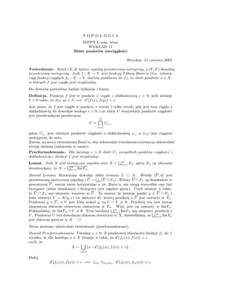 Twierdzenie. Niech (X, d) bȩdzie zupeÃlna̧ przestrzenia̧ metryczna̧, a (Y, d0 ) dowolna̧