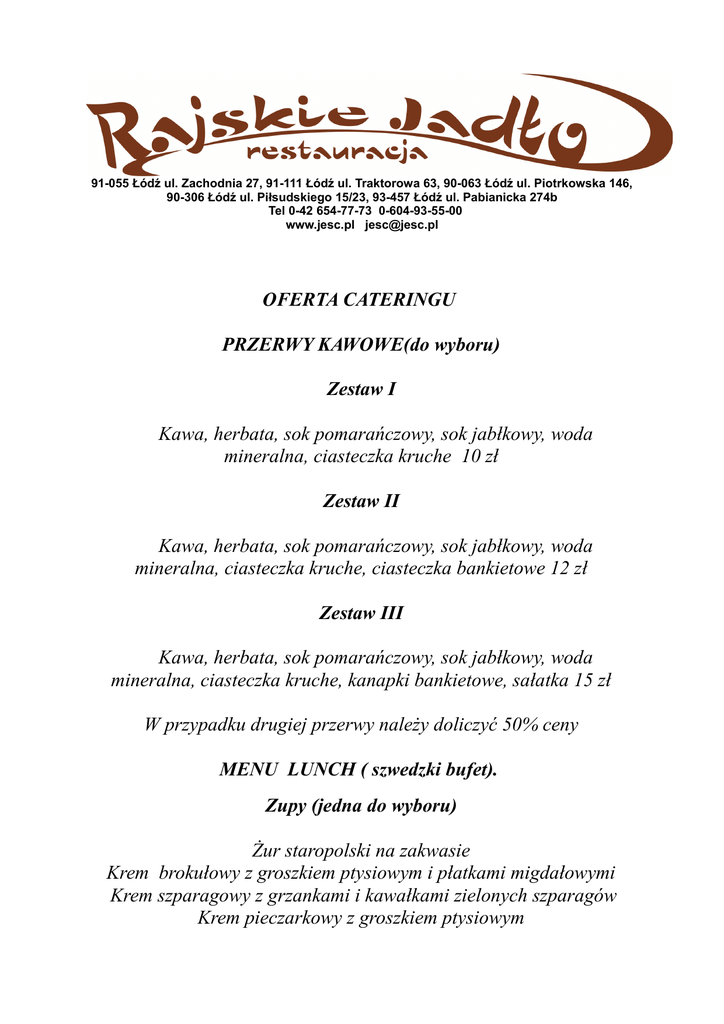 91-055 Łódź ul. Zachodnia 27, 91-111 Łódź ul. Traktorowa 63, 90-063 Łódź ul. Piotrkowska 146, 90-306 Łódź ul. Piłsudskiego 15/23, 93-457 Łódź ul. Pabianicka 274b Tel 0-42 654-77-73 0-604-93-55-00 www.jesc.pl [email protected] OFERTA CATERINGU PRZERWY KAWOWE(do wyboru) Zestaw I Kawa, herbata, sok pomarańczowy, sok jabłkowy, woda mineralna, ciasteczka kruche 10 zł Zestaw II Kawa, herbata, sok pomarańczowy, sok jabłkowy, woda mineralna, ciasteczka kruche, ciasteczka bankietowe 12 zł Zestaw III Kawa, herbata, sok pomarańczowy, sok jabłkowy, woda mineralna, ciasteczka kruche, kanapki bankietowe, sałatka 15 zł W przypadku drugiej przerwy należy doliczyć 50% ceny MENU LUNCH ( szwedzki bufet). Zupy (jedna do wyboru) Żur staropolski na zakwasie Krem brokułowy z groszkiem ptysiowym i płatkami migdałowymi Krem szparagowy z grzankami i kawałkami zielonych szparagów Krem pieczarkowy z groszkiem ptysiowym Krem pomidorowy z profitrolą i aromatem bazylii Rosół z makaronem gotowanymi warzywami i mięsem z kurczaka Krem grzybowy z ziołowymi grzankami Lekka warzywna zupa ( weg.) Danie główne do wyboru (dwie pozycje) Pieczeń wieprzowa w sosie pieczeniowym Kotlet schabowy Medalion z piersi drobiowej De volaylle Opiekana sola w sosie krewetkowym Polędwiczki drobiowe w sosie cztery sery Medaliony z indyczki w chrupkiej orzechowej panierce z sosem z pomarańczy Polędwiczki wieprzowe na sosie ze złocistych kurek + Opiekane ziemniaki z aromatycznymi przyprawami i ziołami, Ryż jaśminowy z ziołami i masłem. Bukiet witamin Warzywa blanszowane Deser Szarlotka Sernik Napoje Kawa Herbata Sok pomarańczowy Sok jabłkowy Woda mineralna Koszt 45 zł od osoby W cenie zawarto: zastawę porcelanową, wystrój stołów, obsługę, transport oraz wszystkie elementy potrzebne do wykonania usługi. Podane ceny są cenami brutto za jedną osobę. Z poważaniem Konrad Podkówka 0-604-93-55-00