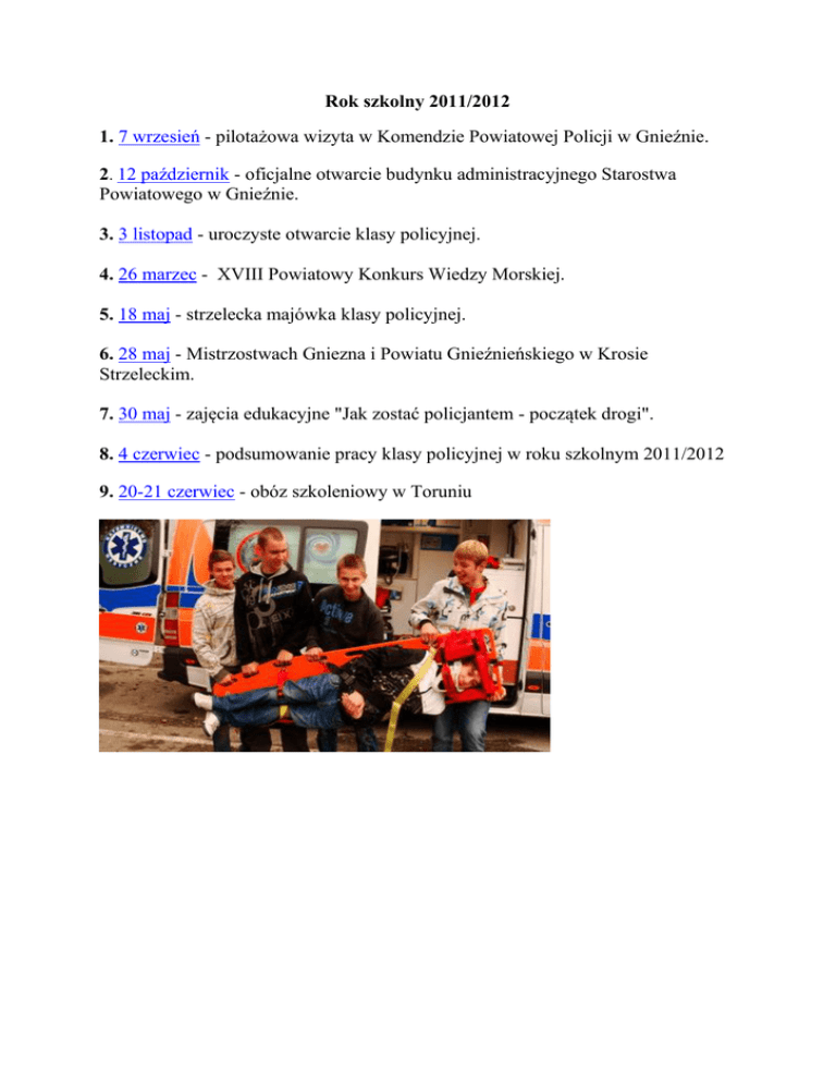 Rok szkolny 2011/2012 1. 7 wrzesień - pilotażowa wizyta w Komendzie Powiatowej Policji w Gnieźnie. 2. 12 październik - oficjalne otwarcie budynku administracyjnego Starostwa Powiatowego w Gnieźnie. 3. 3 listopad - uroczyste otwarcie klasy policyjnej. 4. 26 marzec - XVIII Powiatowy Konkurs Wiedzy Morskiej. 5. 18 maj - strzelecka majówka klasy policyjnej. 6. 28 maj - Mistrzostwach Gniezna i Powiatu Gnieźnieńskiego w Krosie Strzeleckim. 7. 30 maj - zajęcia edukacyjne "Jak zostać policjantem - początek drogi". 8. 4 czerwiec - podsumowanie pracy klasy policyjnej w roku szkolnym 2011/2012 9. 20-21 czerwiec - obóz szkoleniowy w Toruniu