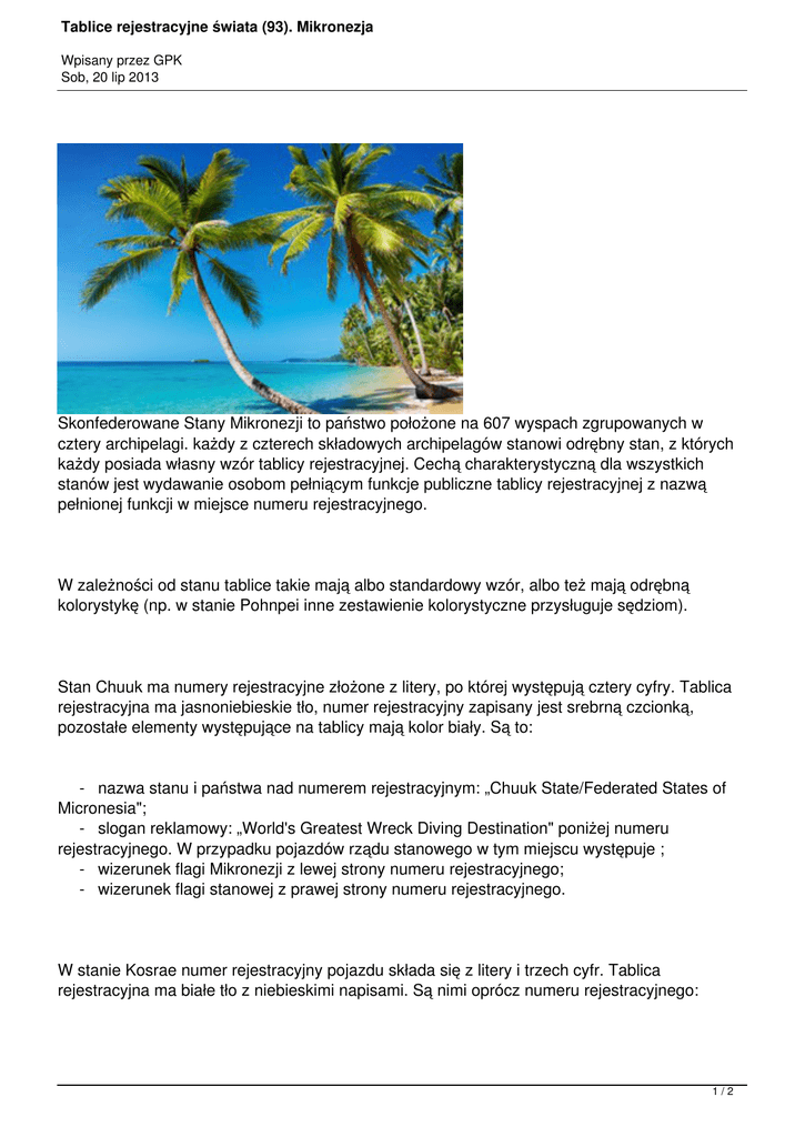 Tablice rejestracyjne świata (93). Mikronezja Wpisany przez GPK Sob, 20 lip 2013 Skonfederowane Stany Mikronezji to państwo położone na 607 wyspach zgrupowanych w cztery archipelagi. każdy z czterech składowych archipelagów stanowi odrębny stan, z których każdy posiada własny wzór tablicy rejestracyjnej. Cechą charakterystyczną dla wszystkich stanów jest wydawanie osobom pełniącym funkcje publiczne tablicy rejestracyjnej z nazwą pełnionej funkcji w miejsce numeru rejestracyjnego. W zależności od stanu tablice takie mają albo standardowy wzór, albo też mają odrębną kolorystykę (np. w stanie Pohnpei inne zestawienie kolorystyczne przysługuje sędziom). Stan Chuuk ma numery rejestracyjne złożone z litery, po której występują cztery cyfry. Tablica rejestracyjna ma jasnoniebieskie tło, numer rejestracyjny zapisany jest srebrną czcionką, pozostałe elementy występujące na tablicy mają kolor biały. Są to: - nazwa stanu i państwa nad numerem rejestracyjnym: „Chuuk State/Federated States of Micronesia"; - slogan reklamowy: „World's Greatest Wreck Diving Destination" poniżej numeru rejestracyjnego. W przypadku pojazdów rządu stanowego w tym miejscu występuje ; - wizerunek flagi Mikronezji z lewej strony numeru rejestracyjnego; - wizerunek flagi stanowej z prawej strony numeru rejestracyjnego. W stanie Kosrae numer rejestracyjny pojazdu składa się z litery i trzech cyfr. Tablica rejestracyjna ma białe tło z niebieskimi napisami. Są nimi oprócz numeru rejestracyjnego: 1/2 Tablice rejestracyjne świata (93). Mikronezja Wpisany przez GPK Sob, 20 lip 2013 - nazwa stanu wraz ze sloganem: „KOSRAE Island of the Sleeping Lady" nad numerem rejestracyjnym; - nazwa państwa poniżej numeru rejestracyjnego („Federated States od Micronesia"); - rysunku fafa – tradycyjnego środka płatniczego stosowanego do uiszczania trybutu. Odrębny wzór tablicy obowiązuje dla pojazdów rządowych (białe znaki, niebieskie tło, inne hasła). W stanie Pohnpei nowy wzór tablicy rejestracyjnej został wprowadzony w 2013 roku. Numer rejestracyjny składa się z nie więcej niż czterech cyfr poprzedzonych mniejszą literą. Podaje się, że litera ta oznacza inicjał nazwiska właściciela i jednocześnie wskazuje na termin obowiązkowego odnowienia rejestracji pojazdu (wg Europlate). Tablica utrzymana jest w tonacji niebieskiej. W tle znajduje się przedstawienie krajobrazu wyspy. Nad numerem rejestracyjnym zamieszczane jest miejsce rejestracji, pod numerem rejestracyjnym – nazwa stanu. W prawym dolnym rogu znajduje się oznaczenie statusu pojazdu: PV oznacza pojazd prywatny, CV – pojazd służbowy. W stanie Yap numer rejestracyjny składa się wyłącznie z cyfr. Tablica rejestracyjna na białe tło z czarnymi znakami. Poniżej numeru rejestracyjnego widnieje nazwa stanu „Yap State", powyżej slogan „Island of Stone Money". Z lewej strony numeru rejestracyjnego widnieje rysunek kamiennej „monety" z wyspy. W Mikronezji wydawane są również tablice federalne. Standardowo mają one niebieskie znaki na białym tle. Numer rejestracyjny składa się z liter FSM i cyfr. Na tablicy widnieje nazwa państwa („Federated States of Micronesia", u góy) i odnotowanie charakteru pojazdu („Government Vehicle", u dołu). Z prawej strony numeru rejestracyjnego widnieje wizerunek flagi. Pojazdy Kongresu mają numer rejestracyjny zaczynający się od „CFSM", czarne znaki brązowe tło. Z prawej strony numeru zamiast flagi widnieje pieczęć państwowa. 2/2