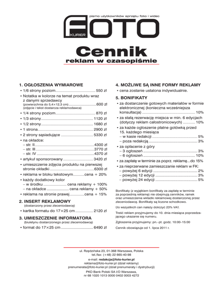 Cennik reklam w czasopiśmie 1. OGŁOSZENIA WYMIAROWE 4. MOŻLIWE SĄ INNE FORMY REKLAMY 1/6 strony poziom .................................... 550 zł cena zostanie ustalona indywidualnie. Notatka w kolorze na temat produktu wraz z danymi sprzedawcy (powierzchnia do 5,4×12,3 cm) .........................600 zł 5. BONIFIKATY (zdjęcie i tekst dostarcza reklamodawca) 1/4 strony poziom .................................... 870 zł 1/3 strony ............................................... 1120 zł 1/2 strony ............................................... 1680 zł 1 strona .................................................. 2900 zł 2 strony sąsiadujące ............................. 5330 zł na okładce: – str. II......................................................4300 zł – str. lll .....................................................3770 zł – str. IV ....................................................4370 zł artykuł sponsorowany ........................... 3420 zł umieszczenie zdjęcia produktu na pierwszej stronie okładki ........................................6300 zł reklama w bloku tekstowym ..........cena + 20% każdy dodatkowy kolor – w środku ..................... cena reklamy + 100% – na okładce .................... cena reklamy + 50% reklama na stronie prawej .............cena + 15% 2. INSERT REKLAMOWY (dostarczony przez zleceniodawcę) kartka formatu do 17×25 cm ................ 2120 zł 3. UMIESZCZENIE INFORMATORA (biuletynu dostarczonego przez zleceniodawcę) format do 17×25 cm ............................. 6490 zł za dostarczenie gotowych materiałów w formie elektronicznej (konieczna wcześniejsza konsultacja) ................................................ 10% za stałą rezerwację miejsca w min. 6 edycjach (dotyczy reklam całostronicowych) ........... 10% za każde ogłoszenie płatne gotówką przed 15. każdego miesiąca – w kasie redakcji ......................................... 5% – poza redakcją ............................................ 3% za opłacenie z góry – 3 ogłoszeń ................................................. 3% – 6 ogłoszeń ............................................... 10% za zapłatę w terminie za poprz. reklamę...do 15% za nieprzerwane zamieszczanie reklam w FK: – powyżej 6 edycji ........................................ 2% – powyżej 12 edycji ...................................... 3% – powyżej 24 edycji ...................................... 5% Bonifikaty (z wyjątkiem bonifikaty za zapłatę w terminie za poprzednią reklamę) nie obejmują cenników, ramek oraz umieszczenia wkładki reklamowej dostarczonej przez zleceniodawcę. Bonifikaty są liczone schodkowo. Do wszystkich cen należy doliczyć 23% VAT. Treść reklam przyjmujemy do 10. dnia miesiąca poprzedzającego ukazanie się numeru. Zgłoszenia przyjmujemy: pn.–pt. godz. 10:00–15:00 Cennik obowiązuje od 1. lipca 2011 r. ul. Rzędzińska 23, 01-368 Warszawa, Polska tel./fax: (+48) 22 665-40-98 e-mail: [email protected] [email protected] (dział reklamy) [email protected] (dział prenumeraty i dystrybucji) PKO Bank Polski SA I/O Warszawa, nr 68 1020 1013 0000 0402 0003 4272