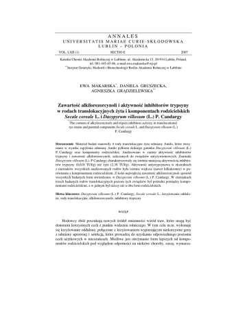 ANNALES UNIVERSITATIS MARIAE CURIE-SKŁODOWSKA LUBLIN – POLONIA VOL. LXII (1) SECTIO E 2007 Katedra Chemii Akademii Rolniczej w Lublinie, ul. Akademicka 15, 20-934 Lublin, Poland, tel. 081-445-65-86, e-mail:[email protected] ** Instytut Genetyki, Hodowli i Biotechnologii Ro lin Akademii Rolniczej w Lublinie EWA MAKARSKA*, DANIELA GRUSZECKA, AGNIESZKA GR DZIELEWSKA** Zawarto alkilorezorcynoli i aktywno inhibitorów trypsyny w rodach translokacyjnych yta i komponentach rodzicielskich Secale cereale L. i Dasypyrum villosum (L.) P. Candargy The content of alkylresorcinols and tripsin inhibitors activity in translocational rye strains and parental components Secale cereale L. and Dasypyrum villosum (L.) P. Candargy Streszczenie. Materiał bada stanowiły 4 rody translokacyjne yta odmiany Amilo, które otrzymano w wyniku zapylenia odmiany Amilo pyłkiem dzikiego gatunku Dasypyrum villosum (L.) P. Candargy oraz komponenty rodzicielskie. Analizowano w ziarnie aktywno inhibitorów trypsyny i zawarto alkilorezorcynoli, zaliczanych do zwi zków anty ywieniowych. Ziarniaki Dasypyrum villosum (L). P Candargy charakteryzowały si istotnie mniejsz aktywno ci inhibitorów trypsyny (0,618 TUI/g) ni yto (2,38 TUI/g). Aktywno antytrypsynowa w ekstraktach z ziarniaków wszystkich analizowanych rodów była istotnie wi ksza (nawet kilkakrotnie) w porównaniu z komponentami rodzicielskimi. Z kolei najwi ksz zawarto alkilorezorcynoli spo ród wszystkich badanych form stwierdzono, w Dasypyrum villosum (L.) P. Candargy. W ziarniakach trzech badanych rodów translokacyjnych poziom tych zwi zków był po redni pomi dzy komponentami rodzicielskimi, a w jednym był ni szy ni u obu form rodzicielskich. Słowa kluczowe: Dasypyrum villosum (L.) P. Candargy, Secale cereale L., krzy owanie oddalone, rody translokacyjne, alkilorezorcynole, inhibitory trypsyny WST P Hodowcy zbó poszukuj nowych ródeł zmienno ci w ród traw, które mog by donorami korzystnych cech z punktu widzenia rolniczego. W tym celu m.in. wykonuje si krzy owanie oddalone, poł czone z krzy owaniem wypieraj cym niekorzystne geny z odmiany uprawnej i selekcj , które prowadz do uzyskania odpowiedniego poziomu cech u ytkowych w miesza cach. Mo liwe jest otrzymanie form lepszych od komponentów rodzicielskich pod wzgl dem odporno ci na niektóre choroby, susz , wymarza- 118 E. Makarska, D. Gruszecka, A. Gr dzielewska nie, a tak e o lepszej jako ci ziarna [Gruszecka i in. 2001, Gruszecka i Pietrusiak 2003, Gruszecka i in. 2004]. Niezb dne jest wi c poznanie charakterystyki biochemicznej oraz aktywno ci biologicznej ziarna translokacyjnych form yta, determinuj cych ich dalsze wykorzystanie gospodarcze. Na dost pno i metabolizm składników pokarmowych w organizmach zwierz t maj wpływ m.in. inhibitory trypsyny i alkilorezorcynole, które s fizjologicznie aktywnymi metabolitami wtórnymi wyst puj cymi tak e w ziarnie yta. Obie grupy zwi zków, ze wzgl du na mo liwe skutki ich negatywnego oddziaływania zaliczamy do zwi zków anty ywieniowych, st d ich aktywno i poziom s istotne ze wzgl du na przydatno gospodarcz ziarna yta. Celem prezentowanej pracy była analiza aktywno ci inhibitorów trypsyny i zawarto ci alkilorezrcynoli w ziarnie 4 rodów translokacyjnych yta odmiany Amilo, które otrzymano w wyniku zapylenia odmiany Amilo pyłkiem dzikiego gatunku Dasypyrum villosum (L.) P. Candargy oraz u komponentów rodzicielskich. MATERIAŁ I METODY Materiał bada stanowiły 4 rody translokacyjne yta odmiany Amilo, które otrzymano w wyniku zapylenia odmiany Amilo pyłkiem dzikiego gatunku Dasypyrum villosum (L.) P. Candargy oraz komponenty rodzicielskie. Ród 1 – CZR 1010 charakteryzował si wy szym plonowaniem w porównaniu z odmian Amilo, ród 2 – CZR 1012 odznaczał si omszonym dokłosiem i wysok zawarto ci białka w ziarnie, ród 3 – CZR 1013 charakterystyczn „ ółt wstawk ” pod kłosem, a ród 4 – CZR 916 karłowato ci i wysok zawarto ci białka w ziarnie. Wymienione rody wyselekcjonowano na podstawie korzystnych warto ci pod wzgl dem elementów plonowania oraz analizy molekularnej [Gruszecka i Mi c 2002, Gruszecka i Pietrusiak 2003, Mi c 2004]. Zawarto alkilorezorcynoli badano w ekstraktach acetonowych po utworzeniu barwnego kompleksu z dwuazowan p-nitroanilin ( = 435 nm). Do sporz dzenia krzywej standardowej stosowano orcynol (5-metylo-1,3-dihydroksobenzen) firmy Sigma. Aktywno antytrypsynow oznaczono metod Kakade i in. [1974] wg modyfikacji Polanowskiego [1976], stosuj c jako substrat kazein w buforze fosforanowym (pH 7,6). Do sporz dzenia krzywej standardowej stosowano trypsyn firmy Sigma. Aktywno antytrypsynow okre lono w ekstraktach, które uzyskano przez wymieszanie 2 g m ki i 20 cm3 buforu octanowego (pH 4,5–4,7), przy u yciu mieszadła magnetycznego przez 1 godzin , a nast pnie odwirowanie. Do oznaczenia aktywno ci pobierano 0,2 cm3 przygotowanego ekstraktu. Wyniki opracowano statystycznie, a weryfikacje ró nic mi dzy rednimi dla rodów i form rodzicielskich uzyskano metod analizy wariancji i wielokrotnych przedziałów ufno ci T –Tukeya. WYNIKI I DYSKUSJA Lipidy rezorcynolowe zlokalizowane s w okrywie owocowo-nasiennej ziarna zbó . W ziarnie yta wyst puj w wi kszych ilo ciach w porównaniu z pszenic i pszen ytem i s to głównie homologi o C17 i C19 [Kaczmarek i Tłu cik 1984, Makarska 1994]. ZAWARTO ALKILOREZORCYNOLI I AKTYWNO INHIBITORÓW TRYPSYNY... 119 Dla ziarna yta odmiany Amilo poziom tych zwi zków wynosił rednio 654 mg kg-1 (tab. 1). Spo ród badanych form, dziki gatunek Dasypyrum villosum (L.) P. Candargy charakteryzował si najwy sz zawarto ci alkilorezorcynoli, która wynosiła rednio 812 mg kg-1. Ma to zapewne zwi zek z rozmieszczeniem tych zwi zków w ziarniaku i proporcji kuticule zewn trznej do całej jego masy. W ziarnie rodów translokacyjnych poziom tych zwi zków był istotnie ni szy od Dasypyrum villosum (L.) P. Candargy, jednego z komponentówi rodzicielskich. W translokacyjnym rodzie 3 ni szy poziom alki