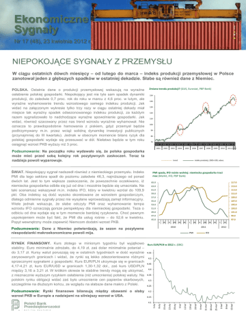 Ekonomiczne Sygnały Nr 17 (48), 23 kwietnia 2012 r. NIEPOKOJĄCE SYGNAŁY Z PRZEMYSŁU W ciągu ostatnich dówch miesięcy – od lutego do marca – indeks produkcji przemysłowej w Polsce zanotował jeden z głębszych spadków w ostatniej dekadzie. Słabe są również dane z Niemiec. Zmiana trendu produkcji? (GUS, Eurostat, PBP Bank) 154 144 134 124 114 104 94 84 74 I V IX I V IX I V IX I V IX I V IX I V IX I V IX I V IX I V IX I V IX I V IX I 2001 Podsumowanie: Na początku roku wydawało się, że polska gospodarka może mieć przed sobą kolejny rok pozytywnych zaskoczeń. Teraz ta nadzieja powoli wyparowuje. 2005 2006 2007 2008 2009 2010 2011 2012 indeks produkcji, 2005=100, odsez. PMI spada, IFO rośnie wolniej: niemiecka gospodarka traci moc (Markit, IFO, PBP Bank) 65.0 117.0 63.0 115.0 61.0 113.0 59.0 111.0 57.0 109.0 55.0 107.0 53.0 105.0 51.0 103.0 49.0 101.0 47.0 99.0 45.0 97.0 I III V VII IX XI I III 2010 V VII IX XI 2011 PMI I III 2012 IFO Kurs EUR/PLN w 2012 r. (EBC) 4.55 4.5 4.45 4.4 4.35 4.3 4.25 4.2 4.15 8-kwi 15-kwi 1-kwi 25-mar 18-mar 11-mar 26-lut 4-mar 19-lut 5-lut 12-lut 15-sty 8-sty 4.1 1-sty Podsumowanie: Rynki finansowe bilansują między obawami o słaby wzrost PKB w Europie a nadziejami na silniejszy wzrost w USA. 2004 trend Podsumowanie: Dane z Niemiec potwierdzają, że sezon na pozytywne niespodzianki makroekonomiczne powoli mija. RYNEK FINANSOWY. Kurs złotego w minionym tygodniu był wyjątkowo stabilny. Euro minimalnie zdrożało, do 4,19 zł, zaś dolar minimalnie potaniał – do 3,17 zł. Kursy walut poruszają się w ostatnich tygodniach w dość wyraźnie zarysowanych granicach i widać, że rynki są lekko zdezorientowane różnymi sprzecznymi sygnałami z gospodarki. Kurs EUR/PLN utrzymuje się w granicach 4,17-4,21 zł, kurs EUR/USD w granicach 1,30-1,32 dol., zaś kurs USD/PLN między 3,16 a 3,21 zł. W krótkim okresie te stabilne trendy mogą się utrzymać, z nieznacznie wyższym ryzykiem osłabienia (niż umocnienia) polskiej waluty. Na polskim rynku obligacji widać zaś było umocnienie cen papierów skarbowych, szczególnie na dłuższym końcu, ze względu na słabsze dane makro z Polski. 2003 29-sty ŚWIAT. Niepokojący sygnał nadszedł również z niemieckiego przemysłu. Indeks PMI dla tego sektora spadł do poziomu zaledwie 46,3, najniższego od ponad dwóch lat. Jest to tym większe zaskoczenie, że powszechnie oczekiwano, iż . niemiecka gospodarka odbiła się już od dna i mozolnie będzie się umacniała. Na taki scenariusz wskazywał m.in. indeks IFO, który w kwietniu wzrósł do 109,9 pkt. Oba indeksy są dość wysoko skorelowane ze wzrostem gospodarczym, dlatego odmienne sygnały przez nie wysyłane wprowadzają zamęt informacyjny. Wiele jednak wskazuje, że słabe odczyty PMI oraz wyhamowanie tempa wzrostu IFO oznaczają gorsze perspektywy dla niemieckiej gospodarki. Teza o odbiciu od dna wydaje się w tym momencie bardziej ryzykowna. Choć pewnym uspokojeniem może być fakt, że PMI dla usług rośnie – do 52,6 w kwietniu. Popyt wewnętrzny może zapewnić Niemcom dodatni wzrost PKB. 2002 22-sty POLSKA. Ostatnie dane o produkcji przemysłowej wskazują na wyraźne osłabienie polskiej gospodarki. Niepokojący jest nie tyle sam spadek dynamiki produkcji, do zaledwie 0,7 proc. rok do roku w marcu z 4,6 proc. w lutym, ale wyraźne wyhamowanie trendu wzrostowego samego indeksu produkcji. Jak widać na załączonym wykresie tylko trzy razy w ciągu ostatniej dekady miał miejsce tak wyraźny spadek odsezonowanego indeksu produkcji, za każdym razem sygnalizowało to nadchodzące wyraźne spowolnienie gospodarki. Jak widać, również szacowany przez nas trend wzrostu wyraźnie wyhamował. Nie oznacza to prawdopodobnie hamowania z piskiem, gdyż przemysł będzie podtrzymywany m.in. przez wciąż solidną dynamikę inwestycji publicznych (przynajmniej do III kwartału). Jednak w obecnym momencie bilans ryzyk dla polskiej gospodarki wydaje się przesuwać w dół. Niełatwo będzie w tym roku osiągnąć wzrost PKB wyższy niż 3 proc. Ekonomiczne Sygnały Nr 17 (48), 23 kwietnia 2012 r. Prognozy Nadchodzący tydzień pełny będzie ważnych publikacji i wydarzeń. Na środę zaplanowana jest decyzja Fed w sprawie stóp procentowych, kwartalne prognozy banku oraz konferencja Bena Bernanke. Szczególnie interesująca będzie ocena przez Bernanke ostatniego osłabienia aktywności gospodarczej w USA i szans na kolejny program luzowania ilościowego. W USA ważna będzie również publikacja indeksu Michigan oraz wstępne dane o PKB za I kwartał 2012 r. (piątek). W Polsce poznamy dane o sprzedaży detalicznej i bezrobociu za marzec (środa), które mogą mieć wpływ na decyzje o stopach procentowych. MAKRO I kwartał 2012 II kwartał 2012 III kwartał 2012 IV kwartał 2012 średnio w 2013 Komentarz PKB, w % rok do roku 3,5 3,1 2,6 2,2 2,2 Nasza prognoza pokazuje ścieżkę dość wyraźnego, acz nie gwałtownego spowolnienia polskiej gospodarki, które będzie trwało do pierwszej połowy 2013 r. Inflacja CPI, w% 4,1 3,5 3,0 2,7 2,8 Inflacja powinna stopniowo obniżać się, choć tempo tego procesu będzie ograniczane m.in. przez wysokie ceny paliw. 4,5 4,5 4,5 4,25 4,00 Wciąż oczekujemy, że RPP utrzyma stopy procentowe bez zmian do jesieni, a później je obniży. Ale jest duże ryzyko, że scenariusz okaże się zupełnie inny. Główna stopa NBP, w % (koniec okresu) RYNKI FINANSOWE 13 kwietnia 2012 r. 30 czerwca 2012 r. 31 grudnia 2012 r. 31 grudnia 2013 r. WIBOR 3M, w % 4,94 4,95 4,75 4,25 Obligacje skarbowe 2Y, w% 4,68 4,60 4,45 4,30 Obligacje skarbowe 5Y, w% 4,94 4,90 4,80 4,80 Obligacje skarbowe 10Y, w% 5,46 5,45 5,35 5,50 Kurs EUR/PLN 4,19 4,05 4,00 3,85 Kurs USD/PLN 3,17 3,10 3,00 2,85 Oczekujemy nieznacznego spadku WIBOR-u w drugiej połowie roku, ale istnieje duże ryzyko, że ostrzejsza polityka NBP zablokuje spadek kosztu pieniądza. W obliczu ostrej retoryki banku centralnego trudno liczyć w najbliższ