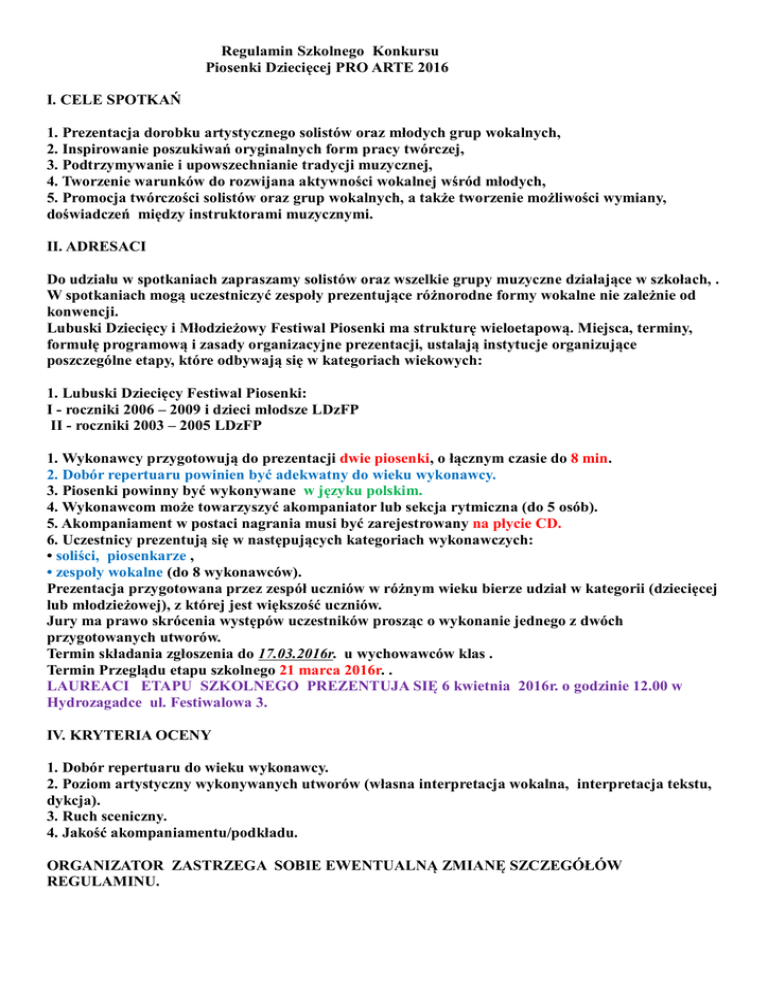 Regulamin Szkolnego Konkursu Piosenki Dziecięcej PRO ARTE 2016 I. CELE SPOTKAŃ 1. Prezentacja dorobku artystycznego solistów oraz młodych grup wokalnych, 2. Inspirowanie poszukiwań oryginalnych form pracy twórczej, 3. Podtrzymywanie i upowszechnianie tradycji muzycznej, 4. Tworzenie warunków do rozwijana aktywności wokalnej wśród młodych, 5. Promocja twórczości solistów oraz grup wokalnych, a także tworzenie możliwości wymiany, doświadczeń między instruktorami muzycznymi. II. ADRESACI Do udziału w spotkaniach zapraszamy solistów oraz wszelkie grupy muzyczne działające w szkołach, . W spotkaniach mogą uczestniczyć zespoły prezentujące różnorodne formy wokalne nie zależnie od konwencji. Lubuski Dziecięcy i Młodzieżowy Festiwal Piosenki ma strukturę wieloetapową. Miejsca, terminy, formułę programową i zasady organizacyjne prezentacji, ustalają instytucje organizujące poszczególne etapy, które odbywają się w kategoriach wiekowych: 1. Lubuski Dziecięcy Festiwal Piosenki: I - roczniki 2006 – 2009 i dzieci młodsze LDzFP II - roczniki 2003 – 2005 LDzFP 1. Wykonawcy przygotowują do prezentacji dwie piosenki, o łącznym czasie do 8 min. 2. Dobór repertuaru powinien być adekwatny do wieku wykonawcy. 3. Piosenki powinny być wykonywane w języku polskim. 4. Wykonawcom może towarzyszyć akompaniator lub sekcja rytmiczna (do 5 osób). 5. Akompaniament w postaci nagrania musi być zarejestrowany na płycie CD. 6. Uczestnicy prezentują się w następujących kategoriach wykonawczych: • soliści, piosenkarze , • zespoły wokalne (do 8 wykonawców). Prezentacja przygotowana przez zespół uczniów w różnym wieku bierze udział w kategorii (dziecięcej lub młodzieżowej), z której jest większość uczniów. Jury ma prawo skrócenia występów uczestników prosząc o wykonanie jednego z dwóch przygotowanych utworów. Termin składania zgłoszenia do 17.03.2016r. u wychowawców klas . Termin Przeglądu etapu szkolnego 21 marca 2016r. . LAUREACI ETAPU SZKOLNEGO PREZENTUJA SIĘ 6 kwietnia 2016r. o godzinie 12.00 w Hydrozagadce ul. Festiwalowa 3. IV. KRYTERIA OCENY 1. Dobór repertuaru do wieku wykonawcy. 2. Poziom artystyczny wykonywanych utworów (własna interpretacja wokalna, interpretacja tekstu, dykcja). 3. Ruch sceniczny. 4. Jakość akompaniamentu/podkładu. ORGANIZATOR ZASTRZEGA SOBIE EWENTUALNĄ ZMIANĘ SZCZEGÓŁÓW REGULAMINU.