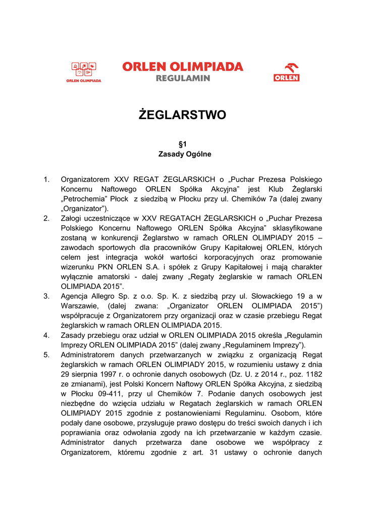 ŻEGLARSTWO §1 Zasady Ogólne 1. 2. 3. 4. 5. Organizatorem XXV REGAT ŻEGLARSKICH o „Puchar Prezesa Polskiego Koncernu Naftowego ORLEN Spółka Akcyjna” jest Klub Żeglarski „Petrochemia” Płock z siedzibą w Płocku przy ul. Chemików 7a (dalej zwany „Organizator”). Załogi uczestniczące w XXV REGATACH ŻEGLARSKICH o „Puchar Prezesa Polskiego Koncernu Naftowego ORLEN Spółka Akcyjna” sklasyfikowane zostaną w konkurencji Żeglarstwo w ramach ORLEN OLIMPIADY 2015 – zawodach sportowych dla pracowników Grupy Kapitałowej ORLEN, których celem jest integracja wokół wartości korporacyjnych oraz promowanie wizerunku PKN ORLEN S.A. i spółek z Grupy Kapitałowej i mają charakter wyłącznie amatorski - dalej zwany „Regaty żeglarskie w ramach ORLEN OLIMPIADA 2015”. Agencja Allegro Sp. z o.o. Sp. K. z siedzibą przy ul. Słowackiego 19 a w Warszawie, (dalej zwana: „Organizator ORLEN OLIMPIADA 2015”) współpracuje z Organizatorem przy organizacji oraz w czasie przebiegu Regat żeglarskich w ramach ORLEN OLIMPIADA 2015. Zasady przebiegu oraz udział w ORLEN OLIMPIADA 2015 określa „Regulamin Imprezy ORLEN OLIMPIADA 2015” (dalej zwany „Regulaminem Imprezy”). Administratorem danych przetwarzanych w związku z organizacją Regat żeglarskich w ramach ORLEN OLIMPIADY 2015, w rozumieniu ustawy z dnia 29 sierpnia 1997 r. o ochronie danych osobowych (Dz. U. z 2014 r., poz. 1182 ze zmianami), jest Polski Koncern Naftowy ORLEN Spółka Akcyjna, z siedzibą w Płocku 09-411, przy ul Chemików 7. Podanie danych osobowych jest niezbędne do wzięcia udziału w Regatach żeglarskich w ramach ORLEN OLIMPIADY 2015 zgodnie z postanowieniami Regulaminu. Osobom, które podały dane osobowe, przysługuje prawo dostępu do treści swoich danych i ich poprawiania oraz odwołania zgody na ich przetwarzanie w każdym czasie. Administrator danych przetwarza dane osobowe we współpracy z Organizatorem, któremu zgodnie z art. 31 ustawy o ochronie danych osobowych, na podstawie umowy powierza przetwarzanie danych osobowych celu organizacji ORLEN OLIMPIADY 2015. §2 Udział w regatach W składzie trzyosobowej załogi żeglarskiej uczestniczącej w Regatach żeglarskich w ramach ORLEN OLIMPIADY 2015, sternikiem jachtu muszą być wyłącznie pracownicy PKN ORLEN S. A. z siedzibą w Płocku lub pracownicy spółek należących do Grupy Kapitałowej ORLEN S. A. Sternik musi posiadać minimum patent żeglarza jachtowego. Przez pracownika należy rozumieć osobę zatrudnioną w PKN ORLEN S. A. lub Spółce Grupy Kapitałowej ORLEN na podstawie umowy o pracę. 2. PKN ORLEN S. A. oraz każda ze spółek Grupy Kapitałowej ORLEN ma prawo zgłosić dowolną ilość załóg żeglarskich. 3. Uczestnicy Regat żeglarskich, zgłoszeni jako sternik są zobowiązani do okazania Organizatorowi ORLEN OLIMPIADY 2015 przed Regatami patentu żeglarskiego oraz dokumentu potwierdzającego tożsamość takiego jak np.: aktualna przepustka służbowa,. Osoba, która nie okaże w dniu zawodów w/w dokumentu nie może uczestniczyć w Regatach. 4. Uczestnicy mają obowiązek przestrzegania porządku publicznego, poleceń służb porządkowych oraz poszanowania pozostałych uczestników ORLEN OLIMPIADY 2015. Organizator oraz Organizator ORLEN OLIMPIADY 2015 ma prawo usunąć z terenu Regat osoby, które w jakikolwiek sposób zakłócają porządek publiczny, przebieg ORLEN OLIMPIADY 2015 lub zachowują się niezgodnie z Regulaminem lub z Regulaminem Imprezy. 5. Uczestnicy rozgrywek w ramach ORLEN OLIMPIADY 2015 oświadczają w formie pisemnej, lub w przypadku osób rejestrujących się za pomocą panelu rejestracyjnego dostępnego na stronie www.olimpiada.orlen.pl, w formie odznaczenia odpowiedniego checkboxu, że wyrażają zgodę na przestrzeganie Regulaminu i tym samym akceptują zawarte w nim regulacje oraz zobowiązują się do ich przestrzegania 6. Każdy z uczestników rozgrywek w ramach ORLEN OLIMPIADY 2015 zobowiązany jest do złożenia oświadczenia w formie pisemnej, lub w przypadku osób rejestrujących się za pomocą panelu rejestracyjnego dostępnego na stronie www.olimpiada.orlen.pl, w formie odznaczenia odpowiedniego checkboxu, że wyraża zgodę na udział w rozgrywkach wyłącznie na własną odpowiedzialność z pełną świadomością niebezpieczeństw i ryzyka wynikających z charakteru tego wydarzenia, które mogą polegać m.in. na ryzyku utraty zdrowia lub życia. Dopuszcza się do uczestnictwa w rozgrywkach w ramach ORLEN OLIMPIADY 2015 wyłącznie osoby posiadające dobry stan 1. 7. 8. 9. 10. 11. zdrowia, nieposiadające przeciwwskazań medycznych do uczestnictwa w Regatach w ramach ORLEN OLIMPIADY 2015. Każdy z uczestników Regatach jest zobowiązany do złożenia oświadczenia w formie pisemnej lub, w przypadku osób rejestrujących się za pomocą panelu rejestracyjnego dostępnego na stronie www.olimpiada.orlen.pl, w formie odznaczenia odpowiedniego checkboxu, że wyraża zgodę na przetwarzanie danych osobowych, w tym na zamieszczanie tych danych w przekazach internetowych i w formie drukowanej informacji dotyczących ORLEN OLIMPIADY 2015. Każdy z uczestników biorących udział w Regatach żeglarskich zobowiązany jest do złożenia pisemnego oświadczenia, lub w przypadku osób rejestrujących się za pomocą panelu rejestracyjnego dostępnego na stronie www.olimpiada.orlen.pl, w formie odznaczenia odpowiedniego checkboxu, że wyraża zgodę na poddanie się weryfikacji w Biurze Zawodów w dniach od 12.06.2015 r. – do 13.06.2015 r. Podczas weryfikacji konieczne będzie ponowne złożenie przez uczestnika w formie pisemnej oświadczenia, o którym mowa w pkt. 6 powyżej. Oświadczenia, o których mowa w pkt. 5-8 powyżej zawarte są w Załączniku nr 1 do Regulaminu. Sternicy zobowiązani są do dostarczenia w trybie opisanym w § 8 Regulaminu, oświadczeń, zgodnych z Załącznikiem nr 1 do Regulaminu, podpisanych przez zawodników należących do zgłoszonej przez si