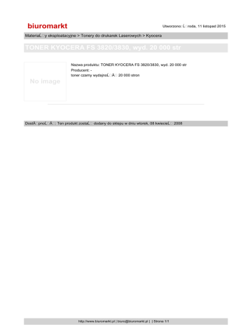 biuromarkt Utworzono: Ĺ roda, 11 listopad 2015 MateriaĹ y eksploatacyjne > Tonery do drukarek Laserowych > Kyocera TONER KYOCERA FS 3820/3830, wyd. 20 000 str Nazwa produktu: TONER KYOCERA FS 3820/3830, wyd. 20 000 str Producent: toner czarny wydajnoĹ Ä 20 000 stron No image DostÄ pnoĹ Ä : Ten produkt zostaĹ dodany do sklepu w dniu wtorek, 08 kwiecieĹ http://www.biuromarkt.pl | [email protected] | | Strona 1/1 2008