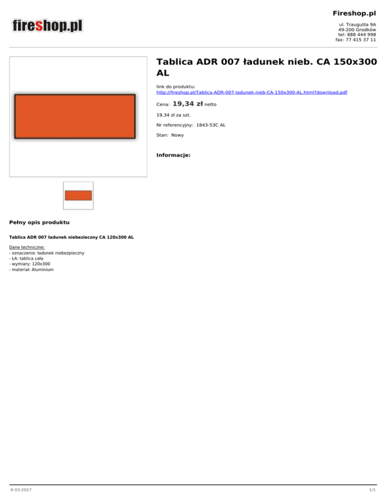 Fireshop.pl ul. Traugutta 9A 49-200 Grodków tel: 888 444 998 fax: 77 415 37 11 Tablica ADR 007 ładunek nieb. CA 150x300 AL link do produktu: http://fireshop.pl/Tablica-ADR-007-ladunek-nieb-CA-150x300-AL.html?download.pdf Cena: 19,34 zł netto 19,34 zł za szt. Nr referencyjny: 1843-53C AL Stan: Nowy Informacje: Pełny opis produktu Tablica ADR 007 ładunek niebezieczny CA 120x300 AL Dane techniczne: - oznaczenie: ładunek niebezpieczny - ŁA: tablica cała - wymiary: 120x300 - materiał: Aluminium 8-03-2017 1/1