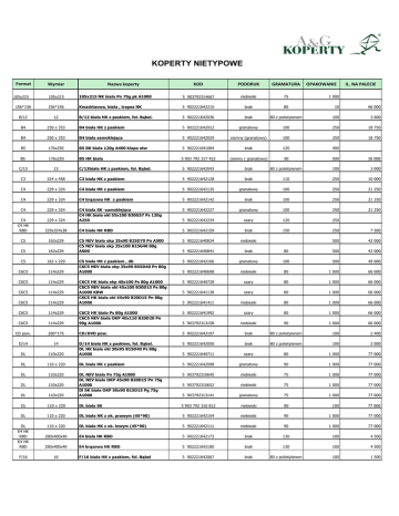 KOPERTY NIETYPOWE Format Wymiar Nazwa koperty KOD PODDRUK GRAMATURA OPAKOWANIE IL. NA PALECIE 105x215 105x215 NK biała Pn 75g pk A1000 5 903792314667 niebieski 75 1 000 156*156 156*156 Kwadrtaowa, biała , trapez NK 5 902221642210 brak 80 10 66 000 B/12 12 B/12 biała HK z paskiem, fol. Bąbel. 5 902221642036 brak 80 z polietylenem 100 3 600 B4 250 x 353 B4 biała HK z paskiem 5 902221642012 granatowy 100 250 18 750 B4 250 x 353 B4 biała samoklejąca 5 902221642029 ciemny (granatowy) 100 250 18 750 B5 176x250 B5 BK biała 120g A400 klapa otw 5 902221641084 brak 120 400 B5 176x250 B5 HK biała 5 903 792 317 422 ciemny ( granatowy) 90 500 36 000 C/13 13 C/13biała HK z paskiem, fol. Bąbel. 5 902221642043 brak 80 z polietylenem 100 3 000 C3 324 x 458 C3 biała HK z paskiem 5 902221642128 brak 110 250 10 000 C4 229 x 324 C4 biała HK z paskiem 5 902221642135 granatowy 100 250 21 250 C4 229 x 324 C4 brązowa HK z paskiem 5 902221642142 brak 100 250 21 250 C4 229 x 324 5 902221642227 granatowy 100 250 21 250 C4 C4 HK RBD 229 x 324 C4 biała SK -samoklejąca C4 HK biała okl 55x100 B30G57 Ps 120g A250 5 902221642234 szary 120 250 229x324x38 C4 biała HK RBD 5 902221642159 brak 150 250 7 500 C5 162x229 5 902221640834 niebieski 500 42 000 C5 162x229 C5 NEV biała okp 35x90 B25D70 Pn A500 C5 NEV biała okp 35x100 B15G40 80g A500 5 902221640841 brak 80 500 42 000 C5 162 x 229 5 902221642166 granatowy 100 500 49 000 C6C5 114x229 C5 biała HK z paskiem , db C6C5 NEV biała okp 35x90 B55D40 Pn 80g A1000 5 902221640698 niebieski 80 1 000 66 000 C6C5 114x229 5 902221640728 szary 80 1 000 66 000 C6C5 114x229 5 902221641138 szary 80 1 000 66 000 C6C5 114x229 C6C5 HK biała okp 40x100 Ps 80g A1000 C6C5 NEV biała okl 45x100 B30D15 Ps 80g A1000 KBW C6C5 HK biała okl 45x90 B20D15 Pn 80g A1000 5 902221641411 niebieski 80 1 000 66 000 C6C5 114x229 5 902221641992 szary 80 1 000 66 000 C6C5 114x229 C6C5 HK biała Ps 80g A1000 C6C5 NEV biała OKP 40x110 B20D20 Pn 90g A1000 5 903792313158 niebieski 90 1 000 66 000 CD pow. 200*175 CD/DVD pow. 5 902221642197 brak 80 z polietylenem 100 2 400 D/14 14 5 902221642050 brak 80 z polietylenem 100 2 000 DL 110x220 D/14 biała HK z paskiem, fol. Bąbel. DL HK biała okl 30x95 B15D40 Ps 80g A1000 5 902221640711 szary 80 1 000 77 000 DL 110 x 220 DL biala HK z paskiem 5 902221642098 granatowy 90 1 000 77 000 DL 110x220 5 903792310645 niebieski 75 1 000 77 000 DL 110x220 5 903792310652 niebieski 75 1 000 77 000 DL 110x220 DL NEV biała Pn 75g A1000 DL NEV biała OKP 45x90 B20D15 Pn 75g A1000 Dl SK biała OKP 50x90 B15D15 Pg 75g A1000 5 903792313141 granatowy 75 1 000 77 000 DL 110 x 220 DL biala SK 5 903 792 310 812 niebieski 80 100 77 000 DL 110 x 220 DL biała HK z ok. prawym (45*90) 5 902221642104 niebieski 90 1 000 77 000 DL E4 HK RBD E4 HK RBD 110 x 220 DL biała HK z ok. lewym (45*90) 5 902221642111 niebieski 90 1 000 77 000 280x400x40 E4 biała HK RBD 5 902221642173 brak 130 100 4 500 280x400x40 E4 brązowa HK RBD 5 902221642180 brak 130 100 4 500 F/16 16 F/16 biała HK z paskiem, fol. Bąbel 5 902221642067 brak 80 z polietylenem 100 1 500 105x215 G/17 17 G/17 biała Hk, fol. Bąbel. 5 902221642074 brak 80 z polietylenem 100 1 200 K/20 20 k/20 biała Hk, fol. Bąbel. 5 902221642081 brak 80 z polietylenem 50 600