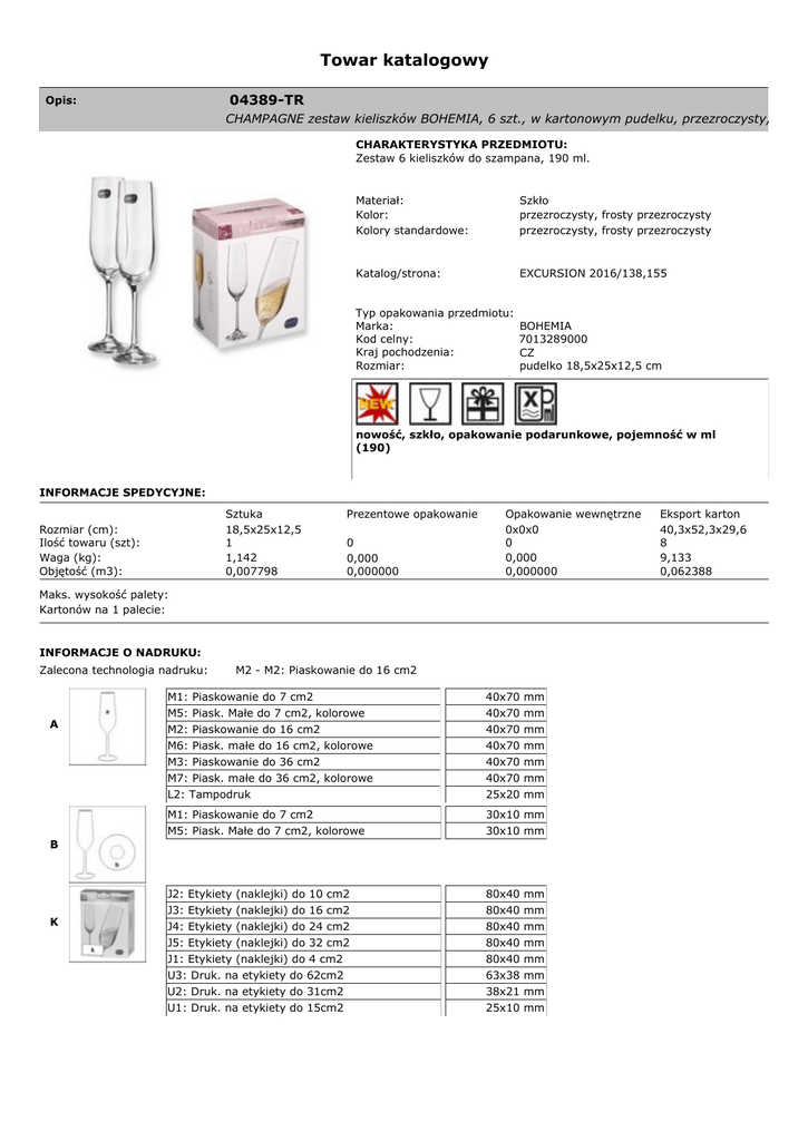 Towar katalogowy 04389-TR Opis: CHAMPAGNE zestaw kieliszków BOHEMIA, 6 szt., w kartonowym pudelku, przezroczysty, frost CHARAKTERYSTYKA PRZEDMIOTU: Zestaw 6 kieliszków do szampana, 190 ml. Materiał: Kolor: Kolory standardowe: Szkło przezroczysty, frosty przezroczysty przezroczysty, frosty przezroczysty Katalog/strona: EXCURSION 2016/138,155 Typ opakowania przedmiotu: Marka: Kod celny: Kraj pochodzenia: Rozmiar: BOHEMIA 7013289000 CZ pudelko 18,5x25x12,5 cm nowość, szkło, opakowanie podarunkowe, pojemność w ml (190) INFORMACJE SPEDYCYJNE: Sztuka 18,5x25x12,5 1 1,142 0,007798 Rozmiar (cm): Ilość towaru (szt): Waga (kg): Objętość (m3): Prezentowe opakowanie 0 0,000 0,000000 Opakowanie wewnętrzne 0x0x0 0 0,000 0,000000 Maks. wysokość palety: Kartonów na 1 palecie: INFORMACJE O NADRUKU: Zalecona technologia nadruku: M2 - M2: Piaskowanie do 16 cm2 M1: Piaskowanie do 7 cm2 A M5: Piask. Małe do 7 cm2, kolorowe M2: Piaskowanie do 16 cm2 M6: Piask. małe do 16 cm2, kolorowe 40x70 40x70 40x70 40x70 mm mm mm mm M3: Piaskowanie do 36 cm2 M7: Piask. małe do 36 cm2, kolorowe L2: Tampodruk 40x70 mm 40x70 mm 25x20 mm M1: Piaskowanie do 7 cm2 M5: Piask. Małe do 7 cm2, kolorowe 30x10 mm 30x10 mm J2: Etykiety (naklejki) do 10 cm2 80x40 mm J3: Etykiety (naklejki) do 16 cm2 J4: Etykiety (naklejki) do 24 cm2 J5: Etykiety (naklejki) do 32 cm2 J1: Etykiety (naklejki) do 4 cm2 U3: Druk. na etykiety do 62cm2 U2: Druk. na etykiety do 31cm2 U1: Druk. na etykiety do 15cm2 80x40 80x40 80x40 80x40 63x38 38x21 25x10 B K mm mm mm mm mm mm mm Eksport karton 40,3x52,3x29,6 8 9,133 0,062388 Towar katalogowy P U3: Druk. na etykiety do 62cm2 90x50 mm U2: Druk. na etykiety do 31cm2 60x40 mm V3: Digitalny druk z lamino 20/A3 V2: Digitalny druk z lamino 40/A3 90x50 mm 60x40 mm