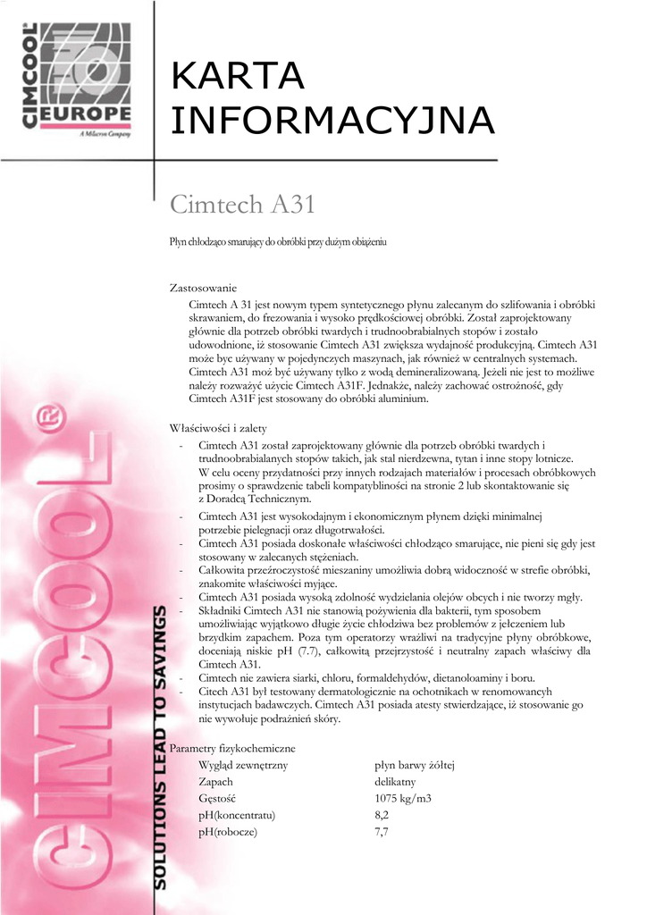 KARTA INFORMACYJNA Cimtech A31 Płyn chłodząco smarujący do obróbki przy dużym obiążeniu Zastosowanie Cimtech A 31 jest nowym typem syntetycznego płynu zalecanym do szlifowania i obróbki skrawaniem, do frezowania i wysoko prędkościowej obróbki. Został zaprojektowany głównie dla potrzeb obróbki twardych i trudnoobrabialnych stopów i zostało udowodnione, iż stosowanie Cimtech A31 zwiększa wydajność produkcyjną. Cimtech A31 może byc używany w pojedynczych maszynach, jak również w centralnych systemach. Cimtech A31 moż być używany tylko z wodą demineralizowaną. Jeżeli nie jest to możliwe należy rozważyć użycie Cimtech A31F. Jednakże, należy zachować ostrożność, gdy Cimtech A31F jest stosowany do obróbki aluminium. Właściwości i zalety - Cimtech A31 został zaprojektowany głównie dla potrzeb obróbki twardych i trudnoobrabialanych stopów takich, jak stal nierdzewna, tytan i inne stopy lotnicze. W celu oceny przydatności przy innych rodzajach materiałów i procesach obróbkowych prosimy o sprawdzenie tabeli kompatybliności na stronie 2 lub skontaktowanie się z Doradcą Technicznym. - Cimtech A31 jest wysokodajnym i ekonomicznym płynem dzięki minimalnej potrzebie pielegnacji oraz długotrwałości. - Cimtech A31 posiada doskonałe właściwości chłodząco smarujące, nie pieni się gdy jest stosowany w zalecanych stężeniach. - Całkowita przeźroczystość mieszaniny umożliwia dobrą widoczność w strefie obróbki, znakomite właściwości myjące. - Cimtech A31 posiada wysoką zdolność wydzielania olejów obcych i nie tworzy mgły. - Składniki Cimtech A31 nie stanowią pożywienia dla bakterii, tym sposobem umożliwiając wyjątkowo długie życie chłodziwa bez problemów z jełczeniem lub brzydkim zapachem. Poza tym operatorzy wrażliwi na tradycyjne płyny obróbkowe, doceniają niskie pH (7.7), całkowitą przejrzystość i neutralny zapach właściwy dla Cimtech A31. - Cimtech nie zawiera siarki, chloru, formaldehydów, dietanoloaminy i boru. - Citech A31 był testowany dermatologicznie na ochotnikach w renomowancyh instytucjach badawczych. Cimtech A31 posiada atesty stwierdzające, iż stosowanie go nie wywołuje podrażnień skóry. Parametry fizykochemiczne Wygląd zewnętrzny Zapach Gęstość pH(koncentratu) pH(robocze) płyn barwy żółtej delikatny 1075 kg/m3 8,2 7,7 Sposób u życia Cimtech A31 można z łatwością rozcienczyć . Wystarczy jedynie wlać go do wody w zalecanej ilości i mieszać . Do automatycznego mieszania zaleca się stosowanie Cimcool®Mix Master. Zalecane stężenia początkowe Frezowanie, wiercenie , tłoczenie, rozwiercanie i szlifowanie 5% Obrabianie i odlewanie stopów aluminium, węgla i stali 5% nierdzewnej, tytanu i egzotycznych stopów Użycie niższego stężenia, niż zalecane może powodować pienienie, korozję i/lub jełczenie. Kompatybilność metalu i wody Rodzaj metalu Miedź i stopy miedzi takie ja brąz i mosiądz Aluminium Stopy żelaza Stal węglowa i nierdzewna Doskonały dla twardego Al (typowych obrabianych i odlewancyh Al). Przy obróbce miękkiego Al mogą się nawarstwić wióry na narzędziach, przy gwintowaniu i głębokim wierceniu porównywalny z płynami na bazie olejowej. Przy zastosowaniu do obróbki specjalncyh gatunków Al zalecane są testy dotyczące plamienia przed użyciem tego produktu. Kompatybliny, ale istnieje niewielkie ryzyko korozji wiórów w porównaniu do konwencjonalnych płynów na bazie olejowej. Ochronę przed korozją można podwyższyć przez regularne dodawanie Cimplus T4009. Znakomita Tytan i inne twarde stopy Znakomita Kompatybilność Kompatybilny tylko w niektórych zastosowanich ale itnieje ryzyko plamienia elementów , tworzenia osadów w urządzeniu i/lub odbarwienia mieszaniny. Regularne dodawanie Inhibitora EC może zredukować ale nie wyeliminować tego ryzyka. Kompatybilność Może być stosowana woda demineralizowana. Zalecane jest sprawdzanie i utrzymanie stężenia chlorków w mieszanie poniżej 150 ppm dla zapewnienia zadowalającej ochrony przed korozją. Uwagi Wolny od oleju mineralnego Cimtech A31 może wykazywać tendencje do tworzenia bardziej lepkich pozostałości, niż tradycyjny płyn na bazie oleju mineralnego w pojedynczych otwartych urządzeniach. Jednakże, regularne zraszanie 1% roztworem Cimclean 50F stosowanego przy jednoczesnym przecieraniu szmatką z materiału zapobiega powstawaniu takich pozostałości. Należy wystrzegać się osadów, gdy stosowana jest aparatura pomiarowa i okresowo czyszczone są elementy ruchome. Stosowanie cienkiej powłoki z Cimguard 10, czy Cimguard 20 może niwelować takie problemy i nie wpływa na dokładność aparatury pomiarowej. Tabela doboru dysz mieszalnika Mix Master (Stężenie może się zmieniaċ w zależności od warunków lokalnych.) Kolor Brąz Stężenie 1.7 Pomar. 2.0 Zielony 2.5 Żółtobrąz. 3.9 Nieb. Biały Czerw. Beżowy Czarny 4.5 5.3 7.4 13 23 Badanie stężenia Do badania stężenia należy użyć jednej z metod podanych poniżej lub odpowiednich procedur laboratoryjnych dostępnych u lokalnego dostawcy. Współczynnik refraktometru 1.8 W przypadku użycia refraktometru uzyskany odczyt pomnożony przez 1.8 jest miarodajny tylko w przypadku świeżej mieszaniny. Cimcool Zestaw TA % Odczyt Magazynownaie Chroniċ przed mrozem 1 0.89 Użycie 2 ml roztworu 2 3 4 5 0.79 0.69 0.59 0.49 Opakowanie 5, 25 i 200 litrow DYSTRYBUTOR PROFIT-STAT EP Szynkiewicz Sp.j. 05-506 Lesznowola ul. Gminnej Rady Narodowej 29A http://profitstatep.pl/ http://sklep.profitstatep.pl/ 6 0.39 7 0.29 *:następna strzykawka 8 9 0.19 0.09 10 *.99