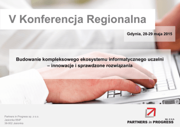 V Konferencja Regionalna Gdynia, 28-29 maja 2015 Budowanie kompleksowego ekosystemu informatycznego uczelni – innowacje i sprawdzone rozwiązania Partners in Progress sp. z o.o. Jasionka 954F 36-002 Jasionka Informacje o Konferencji Regionalnej „ Szanowni Państwo, Firma Partners in Progress ma zaszczyt zaprosić Państwa do udziału w piątej edycji Konferencji Regionalnej organizowanej cyklicznie w różnych miastach Polski. Tym razem miejscem konferencji będzie Gdynia, gdzie zostaniemy przyjęci przez Akademię Marynarki Wojennej. „ „Konferencje Regionalne” organizowane przez Partners in Progress to cykl spotkań, odbywających się dwa razy w roku w największych ośrodkach akademickich na terenie całej Polski. Zaletą regionalizacji konferencji jest, m.in. dostęp do środowiska akademickiego z konkretnego regionu Polski i możliwość podzielenia się doświadczeniami związanymi z produktami i usługami skierowanymi do uczelni w regionie. To również stworzenie okazji do współpracy dydaktycznej, naukowej i biznesowej uczelni skupionych w konkretnym regionie Polski. www.pip.com.pl 17 777 37 00 [email protected] Partners in Progress sp. z o.o. Jasionka 954F 36-002 Jasionka Dlaczego warto uczestniczyć w V Konferencji Regionalnej? Jesteśmy wiodącym na polskim rynku dostawcą systemu wspomagającego zarządzanie uczelnią Z naszych produktów i usług korzysta siedem uczelni znajdujących się w pierwszej dziesiątce Rankingu Niepublicznych Uczelni Magisterskich 2014 prowadzonego przez miesięcznik „Perspektywy” i dziennik „Rzeczpospolita” Posiadamy szeroki zakres funkcjonalny oferowanego systemu zarządzania uczelnią Posiadamy wieloletnie doświadczenie i wysokie kompetencje kadry potwierdzone certyfikatami IMA, Prince, ITIL, ISTQB, Oracle i Microsoft www.pip.com.pl 17 777 37 00 [email protected] Partners in Progress sp. z o.o. Jasionka 954F 36-002 Jasionka Plan Konferencji Agenda Konferencji – w załączeniu do Zaproszenia Rekomendowany hotel: Hotel Blick *** ul. Jana z Kolna 6, 81-351 Gdynia, tel. 58 793 03 00, kom. 502 153 566, e-mail: [email protected] Dla wszystkich uczestników Konferencji, na hasło „Partners in Progress” Hotel Blick udziela specjalnego rabatu na nocleg. Pokój jednoosobowy: 160 zł Pokój dwuosobowy: 220 zł W przypadku wyboru innego miejsca zakwaterowania niż Hotel Blick, uczestnicy są odpowiedzialni za dojazd na Konferencję we własnym zakresie. V Konferencja Regionalna odbędzie się w budynku Biblioteki Głównej Akademii Marynarki Wojennej im. Bohaterów Westerplatte w Gdyni, przy ul. Śmidowicza 69. Dzień pierwszy – 28.05.2015 – plan ramowy 11:00 Zakwaterowanie w hotelu i wyjazd z Hotelu Blick autokarem do Akademii Marynarki Wojennej, gdzie będzie odbywała się V Konferencja Regionalna (szacowany czas przejazdu to 20 minut) 11:45 Rejestracja uczestników Konferencji oraz poczęstunek 12:15 – 17:00 Prelekcje 17:00 – 20:00 Atrakcje konferencyjne 20:00 – 20:30 Powrót autokarem do Hotelu Blick 20:30 - … Kolacja w Hotelu Blick Dzień drugi – 29.05.2015 – plan ramowy 8:00 – 8:30 Śniadanie w Hotelu Blick 8:30 – 9:00 wyjazd z Hotelu Blick autokarem do Portu Wojennego w Gdyni (szacowany czas przejazdu to 20 minut) 9:00 – 11:00 Zwiedzanie portu wojennego – wyłącznie dla osób z rezerwacją 11:00 – 14:55 Prelekcje 14:55 Powrót autokarem do Hotelu Blick. Uwaga: ze względu na konieczność odpowiednio wczesnego dokonania rezerwacji osób zwiedzających Port Wojenny w Gdyni, prosimy o zgłaszanie swojego udziału w V Konferencji do 15 maja 2015. Po tym terminie nie będziemy mogli zapewnić wejścia do Portu Wojennego. Jeśli macie Państwo pytania, zapraszamy do kontaktu: Magdalena Zboch Koordynator ds. Współpracy Zagranicznej [email protected] tel.: (017) 777 37 00 kom: 727 690 960 „