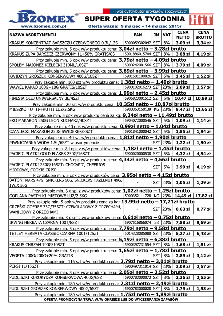 SUPER OFERTA TYGODNIA www.bzomex.com.pl NAZWA ASORTYMENTU Oferta ważna: 9 marzec – 14 marzec 2015r EAN JM VAT CENA NETTO 3,09 zł CENA BRUTTO 3,34 zł 5900059302047 SZT 8% KRAKUS KONCENTRAT BARSZCZU CZERWONEGO 0.3L/12S Przy zakupie min. 5 opk w/w produktu cena: 3,04zł netto – 3,28zł brutto 5901886015704 SZT 8% KRAKUS ZUPA BARSZCZ CZERWONY 1L+50% GRATIS/8S 3,88 zł 4,19 zł Przy zakupie min. 5 opk w/w produktu cena: 3,79zł netto – 4,09zł brutto 5900242001566 SZT 8% SPOŁEM MAJONEZ KIELECKI 310ML/10SZT 3,79 zł 4,09 zł Przy zakupie min. 5 opk w/w produktu cena: 3,69zł netto – 3,99zł brutto 5901581100026 SZT 5% KWIDZYŃ GROSZEK KONSERWOWY 400G/10SZT 1,45 zł 1,52 zł Przy zakupie min. 100 szt w/w produktu cena: 1,38zł netto – 1,49zł brutto 5900102016273 SZT 23% 2,09 zł WAWEL KAKAO 100G+10G GRATIS/10SZT 2,57 zł Przy zakupie min. 5 opk w/w produktu cena: 1,99zł netto – 2,45zł brutto 5906823001512 SZT 5% 10,47 zł 10,99 zł FINESIA OLEJ UNIWERSALNY 3L/4SZT Przy zakupie min. 20 szt w/w produktu cena: 10,35zł netto – 10,87zł brutto 5900353150139 KG 23% 9,47 zł 11,65 zł MIESZKO TUTTI-FRUTTI LUZ/2.5KG Przy zakupie min. 5 opk w/w produktu cena za kg: 9,34zł netto – 11,49zł brutto 5904072000546 SZT 5% EKO MAKARON 250G LEON KUCHARZ/40SZT 1,09 zł 1,14 zł Przy zakupie min. 40 opk w/w produktu cena: 0,99zł netto – 1,04zł brutto 5901841000042 SZT 5% CZANIECKI MAKARON 250G ŚWIDEREK/8SZT 1,85 zł 1,94 zł Przy zakupie min. 40 szt w/w produktu cena: 1,81zł netto – 1,90zł brutto PIWNICZANKA WODA 1.5L/6SZT w asortymencie SZT 23% 1,22 zł 1,50 zł Przy zakupie min. 84 opk z w/w produktów cena: 1,18zł netto – 1,45zł brutto 5900020000538 SZT 5% PACIFIC PŁATKI GOLD FLAKES 250G/16SZT 4,32 zł 4,54 zł Przy zakupie min. 3 opk w/w produktu cena: 4,34zł netto – 4,56zł brutto PACIFIC PŁATKI 250G/16SZT: CHOCAPIC, CHEERIOS SZT 5% 3,99 zł 4,19 zł MIODOWY, COOKIE CRISP Przy zakupie min. 5 opk z w/w produktów cena: 3,95zł netto – 4,15zł brutto BATON: MARS 47G, SNICKERS 50G, SNICKERS HAZELNUT 49G, SZT 23% 1,05 zł 1,29 zł TWIX 50G Przy zakupie min. 3 displ z w/w produktów cena: 1,02zł netto – 1,25zł brutto 5900352111728 KG 23% 14,49 zł 17,82 zł GOPLANA PASTYLKI MIĘTOWE LUZ/2.5KG Przy zakupie min. 5 opk w/w produktu cena za kg: 13,99zł netto – 17,21zł brutto GRZEŚKI GOFREE 33G/35SZT: CZEKOLADOWY Z ORZECHAMI, SZT 23% 0,63 zł 0,77 zł WANILIOWY Z ORZECHAMI Przy zakupie min. 3 displ z w/w produktów cena: 0,61zł netto – 0,75zł brutto 5907516866074 23 23% 7,88 zł IRVING HERBATA CZARNA 100T/8SZT 9,69 zł Przy zakupie min. 5 opk w/w produktu cena: 7,79zł netto – 9,58zł brutto 5014328085088 SZT 23% 5,27 zł TETLEY HERBATA CLASSIC CZARNA 100T/12SZT 6,48 zł Przy zakupie min. 5 opk w/w produktu cena: 5,19zł netto – 6,38zł brutto 5900397731554 SZT 8% KRAKUS CHRZAN 190G/10SZT 1,68 zł 1,81 zł Przy zakupie min. 5 opk w/w produktu cena: 1,65zł netto – 1,78zł brutto VEGETA 200G/200G+20% GRATIS SZT 8% 2,89 zł 3,12 zł Przy zakupie min. 116 szt w/w produktu cena: 2,79zł netto – 3,01zł brutto 5900497311014 SZT 23% 2,09 zł PEPSI 1L/15SZT 2,57 zł Przy zakupie min. 5 opk w/w produktu cena: 2,05zł netto – 2,52zł brutto 5900783000073 SZT 8% PUDLISZKI KUKURYDZA KONSERWOWA 400G/6SZT 2,36 zł 2,55 zł Przy zakupie min. 180 szt w/w produktu cena: 2,31zł netto – 2,49zł brutto 5900783000028 SZT 8% PUDLISZKI GROSZEK KONSERWOWY 400G/6SZT 1,79 zł 1,93 zł Przy zakupie min. 180 szt w/w produktu cena: 1,75zł netto – 1,89zł brutto OFERTA PROMOCYJNA TRWA W/W OKRESIE LUB DO WYCZERPANIA ZAPASÓW
