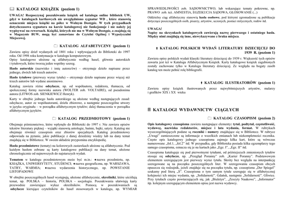 KATALOGI KSIĄśEK (poziom 1) UWAGA! Rozpoczynaj poszukiwania ksiąŜek od katalogu online bibliotek UW, gdyŜ w katalogach kartkowych nie uwzględniono sygnatur WD , które stanowią oznaczenie miejsca ksiąŜki na półce w Wolnym Dostępie. W tych przypadkach dotychczasowa sygnatura na karcie katalogowej nie funkcjonuje i nie naleŜy jej wypisywać na rewersach. KsiąŜki, których nie ma w Wolnym Dostępie, a znajdują się w Magazynie BUW, mogą być zamawiane do Czytelni Ogólnej i WypoŜyczalni Miejscowej. KATALOG ALFABETYCZNY (poziom 1) Zawiera opisy dzieł wydanych od 1801 roku i wpływających do Biblioteki do 1997 roku. Od 1998 roku kontynuacja w katalogu komputerowym. Opisy katalogowe ułoŜone są alfabetycznie według haseł, głównie autorskich i tytułowych, które tworzą jeden wspólny szereg. Hasło autorskie (nazwisko i imię autora/ów) – otrzymuje dzieło napisane przez jednego, dwóch lub trzech autorów. Hasło tytułowe (pierwszy wyraz tytułu) – otrzymuje dzieło napisane przez więcej niŜ trzech autorów lub wydane anonimowo. SPRAWIEDLIWOŚCI zob. SĄDOWNICTWO; lub wskazujące tematy pokrewne, np. PRAWO zob. teŜ. AMNESTIA, EGZEKUCJA SĄDOWA, GŁOSOWANIE (...) Oddzielny ciąg alfabetyczny stanowią hasła osobowe, pod którymi zgromadzone są publikacje dotyczące poszczególnych osób, pisarzy, artystów, uczonych, postaci mitycznych, rodów itd. UWAGA! Napisy na skrzynkach katalogowych zawierają nazwę pierwszego i ostatniego hasła. Między nimi znajdują się inne, niewykazywane z braku miejsca. KATALOG POLSKICH WYDAŃ LITERATURY DZIECIĘCEJ DO 1939 R. (poziom 1) Zawiera opisy polskich wydań klasyki literatury dziecięcej do 1939 r. Większość tych opisów zawarta jest teŜ w Katalogu Alfabetycznym KsiąŜek. Karty katalogowe ksiąŜek zagubionych zostały zachowane tylko w Katalogu literatury dziecięcej. Ze względu na bogaty zasób katalog ten moŜe pełnić rolę bibliografii. KATALOG ILUSTRATORÓW (poziom 1) Katalog zawiera róŜne odsyłacze, np. od współautora, redaktora, tłumacza, od spolszczonej formy nazwiska autora (WOLTER zob. VOLTAIRE), od pseudonimu autora (LITWOS zob. SIENKIEWICZ Henryk). Zawiera opisy ksiąŜek ilustrowanych i grafików XIX i XX wieku Karty w obrębie jednego hasła autorskiego są ułoŜone według następujących zasad: odsyłacze, autor ze współautorami, dzieła zbiorowe, a następnie poszczególne utwory w języku oryginału – w porządku alfabetycznym tytułów; dalej tłumaczenia w porządku alfabetycznym języków. KATALOGI WYDAWNICTW CIĄGŁYCH przez najwybitniejszych artystów, malarzy KATALOG PRZEDMIOTOWY (poziom 1) KATALOG CZASOPISM (poziom 2) Obejmuje piśmiennictwo, które wpłynęło do Biblioteki do 1997 r. Nie zawiera opisów tekstów literatury pięknej – wyjątki stanowią antologie, baśnie, bajki, satyry. Katalog nie obejmuje równieŜ czasopism oraz zbiorów specjalnych. Katalog przedmiotowy odpowiada na pytanie, jakie publikacje z danej dziedziny wiedzy lub na dany temat znajdują się w Bibliotece. W swoim układzie przypomina encyklopedię. Opis katalogowy czasopisma zawiera następujące elementy: tytuł, podtytuł, częstotliwość, wydawcę, nazwiska redaktorów, miejsce i lata wydania, format. W rubrykach wyszczególniających podane są roczniki i numery znajdujące się w Bibliotece. W rubryce „Uwagi” zamieszczone są informacje o wszelkich zmianach lub niekompletności rocznika. Często opis katalogowy jednego czasopisma zajmuje kilka kart, które są wówczas numerowane „fol.1, „fol.2” itd. W przypadku, gdy Biblioteka posiada kilka egzemplarzy tego samego czasopisma, oznacza się je na kartach jako „Egz. I”, „Egz. II” itd. Czasopisma kataloguje się pod pierwotnymi tytułami, od późniejszych zmienionych tytułów stosuje się odsyłacze, np. „Przegląd Poranny” zob. „Kurier Poranny”. Podstawowym elementem szeregującym jest pierwszy wyraz tytułu. Skróty bez względu na interpunkcję szeregowane są na początku poszczególnych liter. W szeregowaniu czasopism obcych opuszcza się rodzajnik, jeŜeli znajduje się na początku tytułu, np. czasopisma „Der Spiegel” szukamy pod literą „S”. Czasopisma o tym samym tytule szereguje się w alfabetycznej kolejności ich miejsc wydania, np. „Solidarność”. Gdańsk, następnie „Solidarność”. Gliwice. Przy tytułach często powtarzających się, jak „Biuletyn”, „Zeszyty Naukowe”, „Informator” itp. kolejnym szeregującym elementem opisu jest nazwa wydawcy. Hasła przedmiotowe (tematy) na kolorowych zastawkach ułoŜone są alfabetycznie. Pod kaŜdym hasłem zebrane są karty katalogowe publikacji na dany temat, ułoŜone chronologicznie od najnowszych do najstarszych wydań. Tematem w katalogu przedmiotowym moŜe być m.in.: ♦nazwa przedmiotu, np. KSIĄśKA, UNIWERSYTETY, STUDENCI; ♦nazwa geograficzna, np. WARSZAWA, TATRY, WARMIA; ♦nazwa wydarzenia historycznego, np. POWSTANIE LISTOPADOWE W obrębie poszczególnych haseł występują, ułoŜone alfabetycznie, określniki, które uściślają temat, np. POLSKA – historia, POLSKA - socjologia. Poszukiwania ułatwiają karty przewodnie zawierające wykaz określników. Pomocą w poszukiwaniach są odsyłacze kierujące czytelników do haseł stosowanych w katalogu, np. WYMIAR UWAGA! • Na kartach wprowadza się informację o zmikrofilmowanych czasopismach, udostępnianych wyłącznie w postaci mikrofilmu w Czytelni Czasopism BieŜących i Mikroform. • Na karcie katalogowej wydawnictw ciągłych znajdujących się w Wolnym Dostępie jest pieczątka, wskazująca symbol szerokiej dziedziny. • Czasopisma, których nie ma w Wolnym Dostępie, a znajdują się w Magazynie BUW, mogą być zamawiane tylko do Czytelni Ogólnej. • Numery z roku bieŜącego dostępne są w Czytelni Czasopism BieŜących i Mikroform, z wyjątkiem publikacji wydawanych jako roczniki (raz w roku), które znajdują się w Wolnym Dostępie lub w Mag