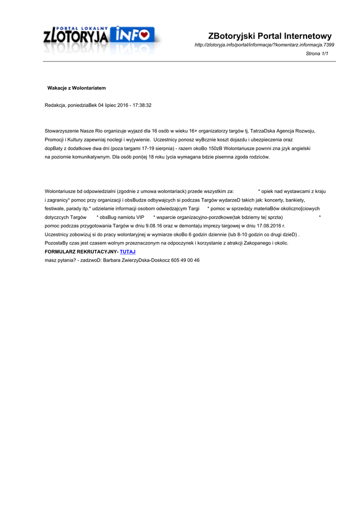 ZBotoryjski Portal Internetowy http://zlotoryja.info/portal/informacje/?komentarz.informacja.7399 Strona 1/1 Wakacje z Wolontariatem Redakcja, poniedziaBek 04 lipiec 2016 - 17:38:32 Stowarzyszenie Nasze Rio organizuje wyjazd dla 16 osób w wieku 16+ organizatorzy targów tj, TatrzaDska Agencja Rozwoju, Promocji i Kultury zapewniaj noclegi i wy|ywienie. Uczestnicy ponosz wyBcznie koszt dojazdu i ubezpieczenia oraz dopBaty z dodatkowe dwa dni (poza targami 17-19 sierpnia) - razem okoBo 150zB Wolontariusze pownni zna jzyk angielski na poziomie komunikatywnym. Dla osób poni|ej 18 roku |ycia wymagana bdzie pisemna zgoda rodziców. Wolontariusze bd odpowiedzialni (zgodnie z umowa wolontariack) przede wszystkim za: * opiek nad wystawcami z kraju i zagranicy* pomoc przy organizacji i obsBudze odbywajcych si podczas Targów wydarzeD takich jak: koncerty, bankiety, festiwale, parady itp.* udzielanie informacji osobom odwiedzajcym Targi dotyczcych Targów * obsBug namiotu VIP * pomoc w sprzeda|y materiaBów okoliczno[ciowych * wsparcie organizacyjno-porzdkowe(tak bdziemy te| sprzta) pomoc podczas przygotowania Targów w dniu 9.08.16 oraz w demonta|u imprezy targowej w dniu 17.08.2016 r. Uczestnicy zobowizuj si do pracy wolontaryjnej w wymiarze okoBo 6 godzin dziennie (lub 8-10 godzin co drugi dzieD) . PozostaBy czas jest czasem wolnym przeznaczonym na odpoczynek i korzystanie z atrakcji Zakopanego i okolic. FORMULARZ REKRUTACYJNY- TUTAJ masz pytania? - zadzwoD: Barbara ZwierzyDska-Doskocz 605 49 00 46 *