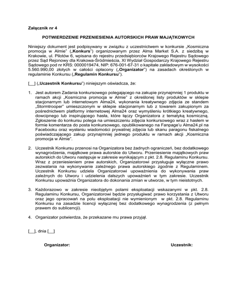 Załącznik nr 4 POTWIERDZENIE PRZENIESIENIA AUTORSKICH PRAW MAJĄTKOWYCH Niniejszy dokument jest podpisywany w związku z uczestnictwem w konkursie „Kosmiczna promocja w Almie” („Konkurs”) organizowanym przez Alma Market S.A. z siedzibą w Krakowie, ul. Pilotów 6, wpisana do rejestru przedsiębiorców Krajowego Rejestru Sądowego przez Sąd Rejonowy dla Krakowa-Śródmieścia, XI Wydział Gospodarczy Krajowego Rejestru Sądowego pod nr KRS: 0000019474, NIP: 676-001-67-31 o kapitale zakładowym w wysokości 5.560.990,00 złotych w całości opłacony („Organizator”) na zasadach określonych w regulaminie Konkursu („Regulamin Konkursu”). [__] („Uczestnik Konkursu”) niniejszym oświadcza, że: 1. Jest autorem Zadania konkursowego polegającego na zakupie przynajmniej 1 produktu w ramach akcji „Kosmiczna promocja w Almie” z określonej listy produktów w sklepie stacjonarnym lub internetowym Alma24, wykonania kreatywnego zdjęcia ze standem „Stormtrooper” umieszczonym w sklepie stacjonarnym lub z towarem zakupionym za pośrednictwem platformy internetowej Alma24 oraz wymyśleniu krótkiego kreatywnego, dowcipnego lub inspirującego hasła, które łączy Organizatora z tematyką kosmiczną. Zgłoszenie do konkursu polega na umieszczeniu zdjęcia konkursowego wraz z hasłem w formie komentarza do posta konkursowego, opublikowanego na Fanpage’u Alma24.pl na Facebooku oraz wysłaniu wiadomości prywatnej zdjęcia lub skanu paragonu fiskalnego poświadczającego zakup przynajmniej jednego produktu w ramach akcji „Kosmiczna promocja w Almie”. 2. Uczestnik Konkursu przenosi na Organizatora bez żadnych ograniczeń, bez dodatkowego wynagrodzenia, majątkowe prawa autorskie do Utworu. Przeniesienie majątkowych praw autorskich do Utworu następuje w zakresie wynikającym z pkt. 2.8. Regulaminu Konkursu. Wraz z przeniesieniem praw autorskich, Organizatorowi przysługuje wyłączne prawo zezwalania na wykonywanie zależnego prawa autorskiego zgodnie z Regulaminem. Uczestnik Konkursu udziela Organizatorowi upoważnienia do wykonywania praw zależnych do Utworu i udzielenia dalszych upoważnień w tym zakresie. Uczestnik Konkursu upoważnia Organizatora do dokonania zmian w utworze, w tym nieistotnych. 3. Każdorazowo w zakresie nieobjętym polami eksploatacji wskazanymi w pkt. 2.8. Regulaminu Konkursu, Organizatorowi będzie przysługiwać prawo korzystania z Utworu oraz jego opracowań na polu eksploatacji nie wymienionym w pkt. 2.8. Regulaminu Konkursu na zasadzie licencji wyłącznej bez dodatkowego wynagrodzenia (z pełnym prawem do sublicencji). 4. Organizator potwierdza, że przekazane mu prawa przyjął. [__], dnia [__] Organizator: Uczestnik: