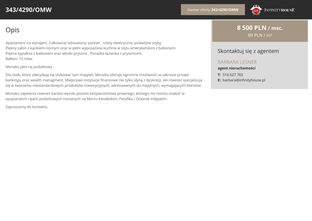 343/4290/OMW Numer oferty 343/4290/OMW Opis 8 500 PLN / msc. 89 PLN / m² Apartament na wynajem. Całkowicie odnowiony: parkiet , rolety elektryczne, podwójne szyby. Piękny salon z kącikiem nocnym oraz w pełni wyposażona kuchnia w stylu amerykańskim z balkonem. Piękna sypialnia z balkonem oraz włoski prysznic . Ponadto łazienka z prysznicem. Balkon: 15 mkw. Skontaktuj się z agentem Monako jako raj podatkowy : agent nieruchomości Dla osób, które zdecydują się ulokować tam majątek, Monako oferuje ogromne możliwości w zakresie private bankingu oraz wealth managment. Miejscowe instytucje finansowe nie tylko słyną z dyskrecji, ale również specjalizują się w tworzeniu niestandardowych produktów inwestycyjnych, adresowanych do majętnych, wymagających klientów. Monako zapewnia również bardzo wysoki poziom bezpieczeństwa prawnego, którego nie można znaleźć w wyspiarskich rajach podatkowych rozsianych na Morzu Karaibskim, Pacyfiku i Oceanie Indyjskim. Zapraszamy do kontaktu. BARBARA LESNER T: 516 627 765 E: barbara@infinityhouse.pl 343/4290/OMW Zdjęcia Numer oferty 343/4290/OMW 343/4290/OMW Numer oferty 343/4290/OMW 343/4290/OMW Numer oferty 343/4290/OMW 343/4290/OMW Numer oferty 343/4290/OMW 343/4290/OMW Numer oferty 343/4290/OMW 343/4290/OMW Numer oferty 343/4290/OMW 343/4290/OMW Numer oferty 343/4290/OMW 343/4290/OMW Mapa Numer oferty 343/4290/OMW