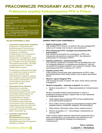 PRACOWNICZE PROGRAMY AKCYJNE (PPA) Praktyczne aspekty funkcjonowania PPA w Polsce Szanowni Pań stwo, Mamy zaszczyt zaprosićPaństwa na konferencję PricewaterhouseCoopers, która odbędzie się15 lutego 2007 r. Miejsce: Hotel Hyatt, Warszawa, ul. Belwederska 23 Czas trwania: 9.30 – 16.30 W przypadku zgł oszeńnadesł anych do 31 stycznia 2007 r. koszt uczestnictwa jednej osoby wynosi 100 euro + VAT. Koszt uczestnictwa zgł oszonego po 31 stycznia to 150 euro + VAT CELEM KONFERENCJI JEST: ZAKRES TEMATYCZNY KONFERENCJI: omówienie praktycznych aspektów związanych z wprowadzaniem i funkcjonowaniem Pracowniczych Programów Akcyjnych w Polsce, począwszy od aspektów motywacyjnych i komunikacyjnych poprzez podatkowe i prawne, skończywszy na księgowych. Swoją wiedząw tym zakresie będądzielić sięz Państwem nie tylko specjaliści PricewaterhouseCoopers, ale także przedstawiciele firm, w których dział ajątakie programy. Ogólne informacje o PPA (Jak dział ająPPA w Polsce i na świecie? Na czym polegająPPA i jakie sąich rodzaje oraz korzyści z wprowadzenia?) Rola motywacyjna PPA i strategie komunikowania PPA pracownikom (Jak zachęcićpracowników do uczestnictwa w PPA? Jak motywowaćpracowników za pomocąPPA? Jak efektywnie przekazywaćim informacje o PPA?) Aspekty podatkowe i ubezpieczeniowe PPA (Czy dochody uzyskiwane w ramach PPA sąopodatkowane oraz czy podlegająskł adkom na ubezpieczenie społ eczne? Jeśli tak, czy spół ka ma obowiązki pł atnika? Czy można ich uniknąć? Jakie sąkonsekwencje PPA w zakresie CIT i VAT?) Przedmiotem zainteresowania będą w szczególności programy opcji na akcje (w tym równieżopcji menedżerskich), programy nabycia akcji, programy akcji restrykcyjnych oraz prawa do ekwiwalentu za wzrost wartości akcji (stock appreciation rights). Aspekty prawne PPA (Jakie przepisy prawa będąmiał y zastosowanie do PPA? Jakie sąwymogi prawne, które należy speł nić, aby w spół ce wprowadzić PPA?) Wycena i ujęcie księgowe PPA (Jak wycenia sięopcje na akcje? Jak opcje i akcje należy ujmować w księgach?) Studium przypadku – dyskusje w grupach. Do wyboru: stworzenie forum wymiany doświadczeńw zakresie Pracowniczych Programów Akcyjnych pomiędzy firmami, które wprowadził y takie programy dla swoich pracowników / kadry menedżerskiej lub dopiero rozważająich wprowadzenie. Po konferencji planowane jest uruchomienie strony internetowej zawierającej praktyczne informacje o PPA, streszczenia artykuł ów prasowych, formularz do zadawania pytań, ciekawostki, itp. swobodna dyskusja ze specjalistami z PricewaterhouseCoopers zajmującymi sięna co dzień obsł ugąPracowniczych Programów Akcyjnych w Polsce. a. Studium przypadku nr 1 – Etapy wprowadzania i funkcjonowania PPA Studium przypadku będzie przeprowadzone w oparciu o przykł adowy program akcyjny i będzie miał o na celu odpowiedź na następujące pytania: Jakie kolejno etapy przechodzi PPA od fazy projektowania ażdo zakończenia programu? Na co należy zwrócićuwagęna poszczególnych etapach PPA (aspekty prawne, podatkowe, księgowe, komunikacyjne)? Skąd czerpaćinformacje i gdzie można uzyskaćpomoc? b. Studium przypadku nr 2 – Komunikacja i motywowanie za pomocąPPA Celem studium będzie wybranie optymalnych programów dla (i) kadry menedżerskiej i (ii) pracowników oraz dobranie do tych programów odpowiednich strategii komunikacyjnych i motywacyjnych. Patron medialny: PRACOWNICZE PROGRAMY AKCYJNE (PPA) Praktyczne aspekty funkcjonowania PPA w Polsce GODZINOWY PROGRAM KONFERENCJI 09:30 – 09:50 OTWARCIE KONFERENCJI Katarzyna Serwińska (PricewaterhouseCoopers) 09:50 – 10:10 AKCJONARIAT PRACOWNICZY W POLSCE I NA ŚWIECIE Jacek Socha (PricewaterhouseCoopers) 10:10 – 10:45 RODZAJE PPA I KORZYŚCI Z ICH WPROWADZENIA Joanna Narkiewicz-Tarł owska (PricewaterhouseCoopers) 10:45 – 11:00 PRZERWA NA KAWĘ 11:00 – 12:00 MOTYWOWANIE ZA POMOCĄPPA ORAZ KOMUNIKACJA PPA PRACOWNIKOM Prezentacja tematu: Joanna Narkiewicz-Tarł owska (PricewaterhouseCoopers) Aspekty praktyczne: Dorota Patejko (Auchan) Dyskusja wśród uczestników – wymiana doświadczeń 12:00 – 13:30 ASPEKTY PODATKOWE I UBEZPIECZENIOWE PPA Prezentacja tematu: PawełStańczyk, Tomasz Barańczyk, Marcin Chomiuk (PricewaterhouseCoopers) Aspekty praktyczne: Anna Grodek (Société Générale), Jerzy Brniak (BP) Dyskusja wśród uczestników – wymiana doświadczeń 13:30 – 14:15 PRZERWA NA LUNCH 14:15 – 14:40 UWARUNKOWANIA PRAWNE PPA Prezentacja tematu: PawełStańczyk (PricewaterhouseCoopers) Aspekty praktyczne: Katarzyna Jankowska (Lafarge) Dyskusja wśród uczestników – wymiana doświadczeń 14:40 – 15:00 WYCENA I UJĘCIE KSIĘGOWE PPA Prezentacja tematu: PawełSpł awski, Krzysztof Nowak (PricewaterhouseCoopers) 15:00 – 15:15 PRZERWA NA KAWĘ 15:15 – 16:15 STUDIUM PRZYPADKÓW – DYSKUSJA W GRUPACH Do wyboru: Studium przypadku nr 1: Etapy wprowadzania i funkcjonowania PPA Studium przypadku nr 2: Komunikacja i motywowanie za pomocąPPA 16:15 DYSKUSJA NA ZAKOŃCZENIE KONFERENCJI W celu zarejestrowania uczestnictwa w konferencji, prosimy o wypeł nienie zał ączonego formularza i odesł anie go faksem na nazwisko Justyny Grochowskiej, na numer (22) 508 48 31 – termin nadsył ania zgł oszeńupł ywa 8 lutego 2007 r. Patron medialny: PRACOWNICZE PROGRAMY AKCYJNE (PPA) Praktyczne aspekty funkcjonowania PPA w Polsce PRELEGENCI Jacek Socha Doł ączyłdo PricewaterhouseCoopers w grudniu 2005 r. i między innymi nadzoruje prace zespoł u ds. rynków kapitał owych w Polsce. Jako Minister Skarbu Państwa (2004-2005) przeprowadziłszereg prywatyzacji przez Gieł dęPapierów Wartościowych, w tym PKO BP S.A., której IPO był o największąofertąpublicznąw Polsce. Jako Przewodniczący Komisji Papierów Wartościowych i Gieł d (1994-2004) brał udziałw dopuszczeniu do publicznego obrotu większości spół ek, które są obecnie notowane na GPW. W okresie peł nienia przez Jacka S