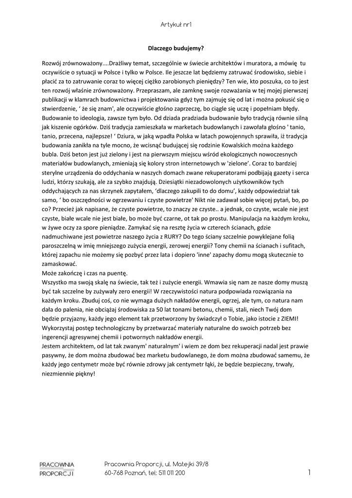 Artykuł nr1 Dlaczego budujemy? Rozwój zrównoważony....Drażliwy temat, szczególnie w świecie architektów i muratora, a mówię tu oczywiście o sytuacji w Polsce i tylko w Polsce. Ile jeszcze lat będziemy zatruwać środowisko, siebie i płacić za to zatruwanie coraz to więcej ciężko zarobionych pieniędzy? Ten wie, kto poszuka, co to jest ten rozwój właśnie zrównoważony. Przepraszam, ale zamknę swoje rozważania w tej mojej pierwszej publikacji w klamrach budownictwa i projektowania gdyż tym zajmuję się od lat i można pokusić się o stwierdzenie, ‘ że się znam', ale oczywiście głośno zaprzeczę, bo ciągle się uczę i popełniam błędy. Budowanie to ideologia, zawsze tym było. Od dziada pradziada budowanie było tradycją równie silną jak kiszenie ogórków. Dziś tradycja zamieszkała w marketach budowlanych i zawołała głośno ' tanio, tanio, przecena, najlepsze! ‘ Dziura, w jaką wpadła Polska w latach powojennych sprawiła, iż tradycja budowania zanikła na tyle mocno, że wcisnąć budującej się rodzinie Kowalskich można każdego bubla. Dziś beton jest już zielony i jest na pierwszym miejscu wśród ekologicznych nowoczesnych materiałów budowlanych, zmieniają się kolory stron internetowych w 'zielone’. Coraz to bardziej sterylne urządzenia do oddychania w naszych domach zwane rekuperatorami podbijają gazety i serca ludzi, którzy szukają, ale za szybko znajdują. Dziesiątki niezadowolonych użytkowników tych oddychających za nas skrzynek zapytałem, ‘dlaczego zakupili to do domu’, każdy odpowiedział tak samo, ‘ bo oszczędności w ogrzewaniu i czyste powietrze' Nikt nie zadawał sobie więcej pytań, bo, po co? Przecież jak napisane, że czyste powietrze, to znaczy ze czyste.. a jednak, co czyste, wcale nie jest czyste, białe wcale nie jest białe, bo może być czarne, ot tak po prostu. Manipulacja na każdym kroku, w żywe oczy za spore pieniądze. Zamykać się na resztę życia w czterech ścianach, gdzie nadmuchiwane jest powietrze naszego życia z RURY? Do tego ściany szczelnie powyklejane folią paroszczelną w imię mniejszego zużycia energii, zerowej energii? Tony chemii na ścianach i sufitach, której zapachu nie możemy się pozbyć przez lata i dopiero 'inne' zapachy domu mogą skutecznie to zamaskować. Może zakończę i czas na puentę. Wszystko ma swoją skalę na świecie, tak też i zużycie energii. Wmawia się nam ze nasze domy muszą być tak szczelne by zużywały zero energii! W rzeczywistości natura podpowiada rozwiązania na każdym kroku. Zbuduj coś, co nie wymaga dużych nakładów energii, ogrzej, ale tym, co natura nam dała do palenia, nie obciążaj środowiska za 50 lat tonami betonu, chemii, stali, niech Twój dom będzie przyjazny, każdy jego element tak przetworzony by świadczył o Tobie, jako istocie z ZIEMI! Wykorzystaj postęp technologiczny by przetwarzać materiały naturalne do swoich potrzeb bez ingerencji agresywnej chemii i potwornych nakładów energii. Jestem architektem, od lat tak zwanym' naturalnym' i wiem ze dom bez rekuperacji nadal jest prawie pasywny, że dom można zbudować bez marketu budowlanego, że dom można zbudować samemu, że każdy jego centymetr może być równie zdrowy jak centymetr łąki, że będzie bezpieczny, trwały, niezmiennie piękny! Pracownia Proporcji, ul. Matejki 39/8 60-768 Poznań, tel: 511 011 200 1