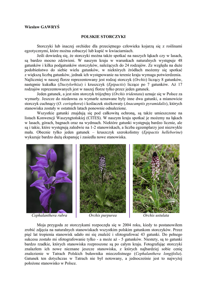 Wiesław GAWRYŚ POLSKIE STORCZYKI Storczyki lub inaczej orchidee dla przeciętnego człowieka kojarzą się z roślinami egzotycznymi, które można zobaczyć lub kupić w kwiaciarniach. Jeśli dowiedzą się, że storczyki można także spotkać na naszych łąkach czy w lasach, są bardzo mocno zdziwieni. W naszym kraju w warunkach naturalnych występuje 48 gatunków i kilka podgatunków storczyków, należących do 24 rodzajów. Ze względu na duże podobieństwo do siebie wielu gatunków, w niektórych źródłach możemy się spotkać z większą liczbą gatunków, jednak ich występowanie na terenie kraju wymaga potwierdzenia. Najliczniej w naszej florze reprezentowany jest rodzaj storczyk (Orchis) liczący 8 gatunków, następnie kukułka (Dactylorhiza) i kruszczyk (Epipactis) liczące po 7 gatunków. Aż 17 rodzajów reprezentowanych jest w naszej florze tylko przez jeden gatunek. Jeden gatunek, a jest nim storczyk trójzębny (Orchis tridentata) uznaje się w Polsce za wymarły. Jeszcze do niedawna za wymarłe uznawane były inne dwa gatunki, a mianowicie storczyk cuchnący (O. coriophora) i koślaczek stożkowaty (Anacamptis pyramidalis), których stanowiska zostały w ostatnich latach ponownie odnalezione. Wszystkie gatunki znajdują się pod całkowitą ochroną, są także umieszczone na listach Konwencji Waszyngtońskiej (CITES). W naszym kraju spotkać je możemy na łąkach w lasach, górach, bagnach oraz na wydmach. Niektóre gatunki występują bardzo licznie, ale są i takie, które występują zaledwie na 1-2 stanowiskach, a liczba egzemplarzy jest niezwykle mała. Obecnie tylko jeden gatunek – kruszczyk szerokolistny (Epipactis helleborine) wykazuje bardzo dużą ekspansję i zasiedla nowe stanowiska. Cephalanthera rubra Orchis purpurea Orchis ustulata Moja przygoda ze storczykami rozpoczęła się w 2004 roku, kiedy to postanowiłem zrobić zdjęcia na naturalnych stanowiskach wszystkim polskim gatunkom storczyków. Przez pięć lat tropienia stanowisk udało mi się znaleźć i sfotografować 43 gatunki. Do pełnego sukcesu zostało mi sfotografowanie tylko - a może aż - 5 gatunków. Niestety, są to gatunki bardzo rzadkie, których stanowiska rozproszone są po całym kraju. Fotografując storczyki znalazłem ich nowe nieznane jeszcze stanowiska, z których najbardziej sobie cenię znalezienie w Tatrach Polskich buławnika mieczolistnego (Cephalanthera longifolia). Gatunek ten dotychczas w Tatrach nie był notowany, a jednocześnie jest to najwyżej położone stanowisko w Polsce.
