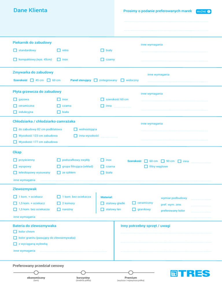 Dane Klienta Prosimy o podanie preferowanych marek Piekarnik do zabudowy inne wymagania standardowy retro biały kompaktowy (wys. 45cm) inox czarny Zmywarka do zabudowy Szerokość 45 cm inne wymagania 60 cm Panel sterujący zintegrowany widoczny Płyta grzewcza do zabudowy inne wymagania gazowa inox szerokość 60 cm ceramiczna czarna inna indukcyjna biała Chłodziarka / chłodziarko-zamrażaka inne wymagania do zabudowy 82 cm podblatowa wolnostojąca Wysokość 123 cm zabudowa inna wysokość Wysokość 177 cm zabudowa Okap przyścienny podszafkowy zwykły inox wyspowy grupa filtrująca (wkład) czarna teleskopowy wysuwany ze szkłem biała Szerokość 60 cm 90 cm inna filtry węglowe inne wymagania Zlewozmywak 1 kom. + ociekacz 1 kom. bez ociekacza 1,5 kom. + ociekacz 2 komory stalowy gładki ceramiczny 1,5 kom. bez ociekacza narożny stalowy len granitowy Materiał: wymiar podbudowy pref. wym. zew. preferowany kolor inne wymagania Bateria do zlewozmywaka Inny potrzebny sprzęt / uwagi kolor chrom kolor granitu (pasujący do zlewozmywaka) z wyciąganą wylewką inne wymagania Preferowany przedział cenowy ekonomiczny (tani) korzystny (średnia półka) Premium (wyższa i najwyższa półka)