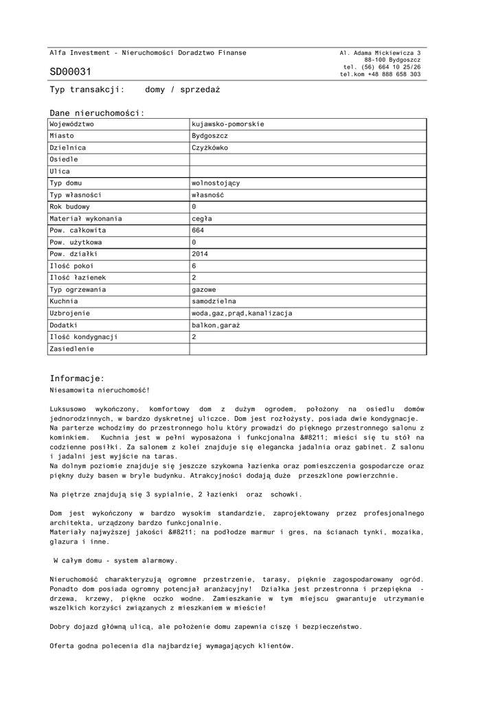 Alfa Investment - Nieruchomości Doradztwo Finanse Al. Adama Mickiewicza 3 88-100 Bydgoszcz tel. (56) 664 10 25/26 tel.kom +48 888 658 303 SD00031 Typ transakcji: domy / sprzedaż Dane nieruchomości: Województwo kujawsko-pomorskie Miasto Bydgoszcz Dzielnica Czyżkówko Osiedle Ulica Typ domu wolnostojący Typ własności własność Rok budowy 0 Materiał wykonania cegła Pow. całkowita 664 Pow. użytkowa 0 Pow. działki 2014 Ilość pokoi 6 Ilość łazienek 2 Typ ogrzewania gazowe Kuchnia samodzielna Uzbrojenie woda,gaz,prąd,kanalizacja Dodatki balkon,garaż Ilość kondygnacji 2 Zasiedlenie Informacje: Niesamowita nieruchomość! Luksusowo wykończony, komfortowy dom z dużym ogrodem, położony na osiedlu domów jednorodzinnych, w bardzo dyskretnej uliczce. Dom jest rozłożysty, posiada dwie kondygnacje. Na parterze wchodzimy do przestronnego holu który prowadzi do pięknego przestronnego salonu z kominkiem. Kuchnia jest w pełni wyposażona i funkcjonalna – mieści się tu stół na codzienne posiłki. Za salonem z kolei znajduje się elegancka jadalnia oraz gabinet. Z salonu i jadalni jest wyjście na taras. Na dolnym poziomie znajduje się jeszcze szykowna łazienka oraz pomieszczenia gospodarcze oraz piękny duży basen w bryle budynku. Atrakcyjności dodają duże przeszklone powierzchnie. Na piętrze znajdują się 3 sypialnie, 2 łazienki oraz schowki. Dom jest wykończony w bardzo wysokim standardzie, zaprojektowany przez profesjonalnego architekta, urządzony bardzo funkcjonalnie. Materiały najwyższej jakości – na podłodze marmur i gres, na ścianach tynki, mozaika, glazura i inne. W całym domu - system alarmowy. Nieruchomość charakteryzują ogromne przestrzenie, tarasy, pięknie zagospodarowany ogród. Ponadto dom posiada ogromny potencjał aranżacyjny! Działka jest przestronna i przepiękna drzewa, krzewy, piękne oczko wodne. Zamieszkanie w tym miejscu gwarantuje utrzymanie wszelkich korzyści związanych z mieszkaniem w mieście! Dobry dojazd główną ulicą, ale położenie domu zapewnia ciszę i bezpieczeństwo. Oferta godna polecenia dla najbardziej wymagających klientów. Serdecznie zapraszam na prezentację, z przyjemnością odpowiem Państwu na wszelkie pytania oraz udzielę dodatkowych informacji. Beata Jażdżewska tel. 883 589 914, e-mail:[email protected] Pośrednik odpowiedzialny zawodowo: Paweł Dawidowicz licencja pośrednika w obrocie nieruchomościami 7432 Andrzej Pamin licencja pośrednika w obrocie nieruchomościami 1145 UWAGA!!! BEZPŁATNIE POMAGAMY W UZYSKANIU KREDYTU NA ZAKUP NIERUCHOMOŚCI. WSPÓŁPRACUJEMY Z WIELOMA BANKAMI. Z NAMI MOŻESZ UZYSKAĆ KREDYT NA 100% WARTOŚCI NIERUCHOMOŚCI. Treść niniejszego ogłoszenia nie stanowi oferty handlowej w rozumieniu przepisów Kodeksu Cywilnego. Cena: 1 690 000 PLN Dokument wygenerowany ze strony www.alfa-investment.pl Strona 2
