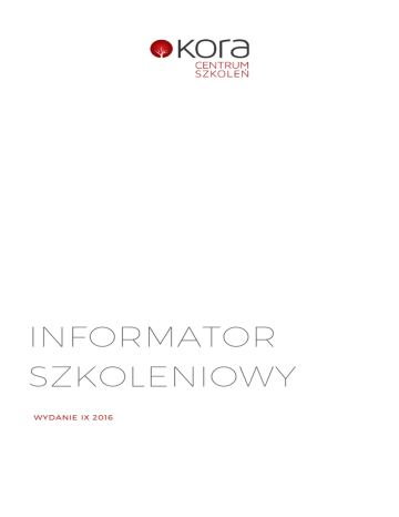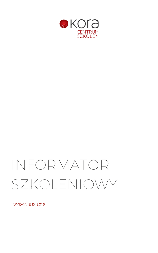 INFORMATOR SZKOLENIOWY WYDANIE IX 2016 Copyright © 2016 Marek Wojda Niniejsza publikacja, ani żadna jej części, nie może być kopiowana, ani w jakikolwiek inny sposób reprodukowana, powielana, ani odczytywana w środkach publicznego przekazu bez pisemnej zgody autora. Zabrania się jej publicznego udostępniania w Internecie oraz odsprzedaży zgodnie z regulaminem dostępnym na stronie www.kora.pl. KORA Centrum Szkoleń Kolberga 15 81-881 Sopot www.kora.pl Wstęp ............................................................................................................................................................................. 4 Warunki uczestnictwa ...................................................................................................................................... 5 Staż pracy .............................................................................................................................................................. 5 Kursy dodatkowe ........................................................................................................................................... 5 Kursy dodatkowe dla specjalizacji dla pielęgniarek ...................................................... 5 Kursy dodatkowe dla specjalizacji dla położnych ........................................................... 6 Kursy dodatkowe dla kursów kwalifikacyjnych dla pielęgniarek ........................ 6 Kursy dodatkowe dla kursów kwalifikacyjnych dla położnych ............................. 6 Wybór organizatora ............................................................................................................................................. 7 Najbliższe szkolenia ............................................................................................................................................ 8 Sopot ........................................................................................................................................................................ 8 Bydgoszcz ............................................................................................................................................................ 9 Olsztyn .................................................................................................................................................................... 9 Spis treści 3 Pracując w zawodzie widzisz jak wiele aspektów w Twoim otoczeniu zawodowym jest precyzyjnie określonych, podobnymi zasadami objęte jest kształcenie podyplomowe pielęgniarek i położnych. Wstęp Moją intencją nie jest ocenianie formuły i zasad podyplomowego kształcenia pielęgniarek i położnych, lecz przygotowanie Cię do świadomego wyboru ścieżki szkoleniowej, chcę Ci podpowiedzieć na co zwrócić uwagę podejmując decyzję o rozpoczęciu kształcenia. Jest to ważne, bo droga do upragnionego kursu, specjalizacji czasami może być skomplikowana. W podziękowaniu za to, że jesteś w gronie naszych Przyjaciół przesyłam Ci swoistego rodzaju „bezpłatną mapę drogową”, z którą bez problemu przejdziesz drogę od wyboru szkolenia do upragnionego dyplomu. Jestem przekonany, że zawarte informacje pomogą Ci w podejmowaniu decyzji. Zanim przystąpisz do działania, musisz odpowiedzieć sobie jakiego kursu potrzebujesz? Do wyboru masz cztery rodzaje kształcenia: KURS DOKSZTAŁCAJĄCY jak sama nazwa mówi jest kursem, który pozwala pogłębić i aktualizować wiedzę oraz umiejętności wąskiego zakresu tematycznego. KURS SPECJALISTYCZNY Kurs specjalistyczny, jest formą kształcenia, która pozwala uzyskać kwalifikacje do wykonywania określonych czynności zawodowych, np. kwalifikacje do wykonywania szczepień ochronnych, wykonywania i interpretacji zapisu EKG i innych. KURS KWALIFIKACYJNY Po ukończeniu kursu kwalifikacyjnego uzyskujesz kwalifikacje z danej dziedziny, np. np. kwalifikacje pielęgniarki anestezjologicznej, rodzinnej lub innych wymienionych w wykazie. SPECJALIZACJA Absolwent uzyskuje specjalistyczne kwalifikacje, staje się specjalistą w dziedzinie. Specjalizacja jest najwyższą forma kształcenia podyplomowego, szkolenie trwa około dwóch lat i kończy się egzaminem państwowym. Wszystkie szkolenia opierają się na precyzyjnych programach. Od roku 2015 programy są upublicznione i znajdują się na stronie Centrum Kształcenia Pielęgniarek i Położnych. Wyjątkiem są kursy dokształcające, te są realizowane w oparciu o programy autorskie. 4 STAŻ PRACY Przystępując do szkolenia pamiętaj o wymogach formalnych, pamiętaj spełnienie ich jest konieczne i obowiązkowe. Pierwszym i kluczowym wymogiem formalnym jest staż pracy w zawodzie, i tak: Warunki uczestnictwa min. 2 lata w zawodzie w okresie ostatnich 5 lat- dla specjalizacji, min. 6 miesięcy w zawodzie- dla kursów kwalifikacyjnych, brak wymogu stażu w kursach specjalistycznych i dokształcających; KURSY DODATKOWE Drugim warunkiem, który możesz spełnić w trakcie szkolenia, jest ukończenie dodatkowych kursów. Jeżeli posiadasz już zaświadczenie o ukończonym kursie, wystarczy, że dostarczysz kopię do organizatora. Musisz uwzględnić w planach ukończenie wymaganych kursów dodatkowych. Poza tym w przypadku wszystkich specjalizacji wymagane jest ukończenie kursu wywiad i badanie fizykalne. Możesz ubiegać się o zwolnienie z badań fizykalnych w przypadku ukończenia innej specjalizacji po roku 2001 lub kursu badania fizykalnego Advanced Physical Assessment. KURSY DODATKOWE DLA SPECJALIZACJI DLA PIELĘGNIAREK chirurgiczna + kursy dodatkowe anestezjologiczna + kursy dodatkowe geriatryczna + kursy dodatkowe internistyczna + kursy dodatkowe pediatryczna + kursy dodatkowe rodzinna + kursy dodatkowe ratunkowa + kursy dodatkowe opieki długoterminowej + kursy dodatkowe paliatywna + kursy dodatkowe psychiatryczna + kursy dodatkowe ochrona zdrowia pracujących + kursy dodatkowe epidemiologiczna + kursy dodatkow