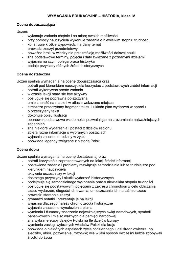 WYMAGANIA EDUKACYJNE – HISTORIA, klasa IV Ocena dopuszczająca Uczeń: - wykonuje zadania chętnie i na miarę swoich możliwości - przy pomocy nauczyciela wykonuje zadania o niewielkim stopniu trudności - konstruuje krótkie wypowiedzi na dany temat - prowadzi zeszyt przedmiotowy - poważne braki w wiedzy nie przekreślają możliwości dalszej nauki - zna podstawowe terminy, pojęcia i daty związane z poznanymi dziejami - wyjaśnia na czym polega praca historyka - podaje przykłady różnych źródeł historycznych Ocena dostateczna Uczeń spełnia wymagania na ocenę dopuszczającą oraz - potrafi pod kierunkiem nauczyciela korzystać z podstawowych źródeł informacji - potrafi wykonywać proste zadania - w czasie lekcji stara się być aktywny - posługuje się poprawną polszczyzną - umie znaleźć na mapie i w atlasie wskazane miejsca - streszcza przeczytany fragment tekstu i układa plan wydarzeń w oparciu o przeczytany tekst - dokonuje opisu ilustracji - opanował podstawowe wiadomości pozwalające na zrozumienie najważniejszych zagadnień - zna niektóre wydarzenia i postaci z dziejów regionu - zbiera różne informacje o wybranych postaciach - wyjaśnia znaczenie rodziny w życiu - opowiada legendy związane z historią Polski Ocena dobra Uczeń spełnia wymagania na ocenę dostateczną oraz - potrafi korzystać z zaprezentowanych na lekcji źródeł informacji - postawione zadania i problemy rozwiązuje samodzielnie lub te trudniejsze pod kierunkiem nauczyciela - aktywnie uczestniczy w lekcji - dostrzega przyczyny i skutki wydarzeń historycznych - podejmuje się samodzielnego wykonania prac o niewielkim stopniu trudności - posługuje się podstawowymi pojęciami z zakresu chronologii w celu obliczania czasu wydarzeń, długości ich trwania, umieszczania ich na taśmie czasu - prowadzi starannie zeszyt - gromadzi notatki i prezentuje je na lekcji - wyjaśnia dlaczego należy chronić źródła historyczne - wyjaśnia znaczenie wynalezienia pisma - wymienia i tłumaczy znaczenie najważniejszych świąt narodowych, symboli państwowych i miejsc ważnych dla pamięci narodowej - zna wybrane etapy dziejów Polski na tle dziejów Europy - wymienia zasługi wybranych władców Polski dla kraju - opowiada o niektórych aspektach życia codziennego ludzi średniowiecza: np. siedziby, ubiór, pożywienie, rozrywki; wie w jaki sposób ówcześni ludzie zdobywali środki do życia Ocena bardzo dobra Uczeń spełnia wymagania na ocenę dobrą oraz - opanował materiał przewidziany programem - dociera samodzielnie do źródeł informacji wskazanych przez nauczyciela - aktywnie uczestniczy w lekcji - postawione problemy i zadania rozwiązuje w sposób samodzielny i prezentuje na forum klasy - rozwiązuje zadania dodatkowe i potrafi zaprezentować ich wyniki na forum klasy - poprawnie posługuje się poznanymi pojęciami - dostrzega przyczyny i skutki wydarzeń historycznych - potrafi uporządkować zebrany materiał i właściwie wykorzystać - wzorowo prowadzi zeszyt lekcyjny - biegle posługuje się mapą i atlasem historycznym i osią czasu - odczytuje ze zrozumieniem teksty źródłowe - opisuje charakterystyczne cechy wzorców osobowych w średniowieczu (rycerz, władca) - charakteryzuje obowiązki szlachcica wobec państwa - wymienia zasługi władców dla kultury polskiej i kraju - charakteryzuje życie społeczeństwa polskiego w XVII wieku na tle życia społeczeństw Europy - opisuje działalność gospodarczą polskiej szlachty - porównuje warunki życia na wsi i w mieście - charakteryzuje działalność wybitnych uczonych i ich zasługi dla kraju Ocena celująca Uczeń spełnia wymagania na ocenę bardzo dobrą oraz - aktywnie uczestniczy w procesie lekcyjnym - samodzielnie rozwiązuje problemy omawiane w czasie lekcji - potrafi samodzielnie dotrzeć do różnych źródeł informacji i w oparciu o nie rozszerza swą wiedzę historyczną - potrafi uporządkować zebrany materiał, przechować go i wykorzystać - potrafi na forum klasy zaprezentować wyniki swych prac - zna i rozumie pojęcia historyczne poprawnie posługuje się myśleniem przyczynowoskutkowym - wyraża własne zdanie, popiera je właściwą i logiczną argumentacją - posługuje się poprawną polszczyzną - uczestniczy w konkursach na poziomie klasy czwartej