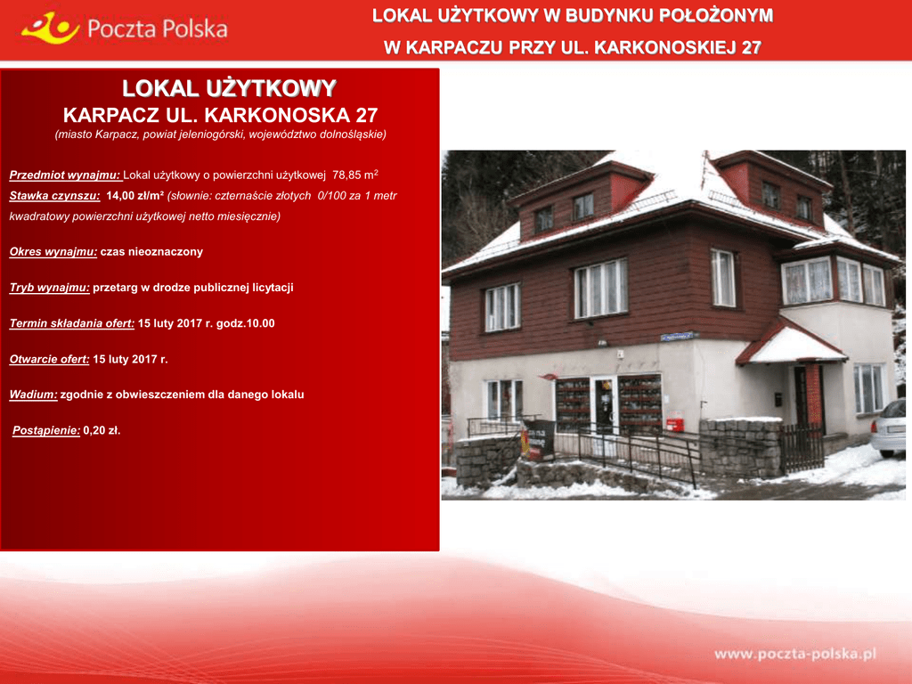 LOKAL UŻYTKOWY W BUDYNKU POŁOŻONYM W KARPACZU PRZY UL. KARKONOSKIEJ 27 LOKAL UŻYTKOWY KARPACZ UL. KARKONOSKA 27 (miasto Karpacz, powiat jeleniogórski, województwo dolnośląskie) Przedmiot wynajmu: Lokal użytkowy o powierzchni użytkowej 78,85 m 2 Stawka czynszu: 14,00 zł/m² (słownie: czternaście złotych 0/100 za 1 metr kwadratowy powierzchni użytkowej netto miesięcznie) Okres wynajmu: czas nieoznaczony Tryb wynajmu: przetarg w drodze publicznej licytacji Termin składania ofert: 15 luty 2017 r. godz.10.00 Otwarcie ofert: 15 luty 2017 r. Wadium: zgodnie z obwieszczeniem dla danego lokalu Postąpienie: 0,20 zł. Kliknij i zlokalizuj na mapie Opis nieruchomości: Miejscowość Karpacz Ulica, nr budynku Karkonoska 27 Powierzchnia budynku, w którym zlokalizowany jest przedmiot wynajmu 78,85 m² Nr działki ewidencyjnej, obręb Dz. nr 80 AM 3 Księga wieczysta, Sąd Rejonowy, Nr Wydziału JG1J/00018400/1 Stan prawny gruntu Własność Skarbu Państwa w użytkowaniu wieczystym Poczty Polskiej S.A. Lokalizacja i dostępność komunikacyjna: Nieruchomość położona jest przy ul. Karkonoskiej 27 w Karpaczu w województwie dolnośląskim. Usytuowana jest w pobliżu jednej z najchętniej odwiedzanych przez turystów atrakcji Karpacza tj. Świątyni Wang, Odległość do centrum miasta wynosi 3,5 km . Opis nieruchomości: Lokal użytkowy jest częścią nieruchomości zabudowanej oznaczonej w ewidencji gruntów numerem: 80 o łącznym obszarze 0,964 ha.. Nieruchomość objęta jest Księgą Wieczystą nr JG1J/00018400/1 prowadzoną przez Sąd Rejonowy w Jeleniej Gorze, VI Wydział Ksiąg Wieczystych w Jeleniej Górze. Nieruchomość jest własnością Skarbu Państwa w użytkowaniu wieczystym Poczty Polskiej S.A. OBWIESZCZENIE O PRZETARGU w TRYBIE PUBLICZNEJ LICYTACJI • Wynajmujący: Poczta Polska S.A., ul. Rodziny Hiszpańskich 8, 00-940 Warszawa • Prowadzący przetarg: Poczta Polska S.A., Pion Infrastruktury Obszar Operacyjny ds. Nieruchomości, ul. Ibn Siny Awicenny 21, 50-900 Wrocław. • Termin i miejsce przetargu: 15 lutego 2017 r., o godz. 10ºº we Wrocławiu przy ul. Ibn Siny Awicenny 21, parter, pokój nr 02. • Przedmiotem przetargu jest najem lokalu użytkowego przy ul Karkonoskiej 27 wg poniższego zestawienia: Wykaz pomieszczeń – lokal użytkowy – parter. nr pomieszczenia Sposób wykorzystania Powierzchnia [m2] wywoławcza stawka czynszu [m2] netto zł. 1 Lokal użytkowy 78,85 14,00 wysokość wadium zł 3 207,36 wysokość postąpienia 0,2 • Wywoławcze stawki czynszu nie obejmują kosztów zużycia mediów i opłat za wywóz nieczystości stałych. • Okres obowiązywania umowy najmu. Umowa będzie zawarta na czas nieoznaczony. • Zawarcie umowy najmu jest uzależnione od wpłacenia przez najemcę kaucji zabezpieczającej w wysokości trzykrotności miesięcznego czynszu brutto za przedmiot umowy, obliczonego wg stawki czynszu obowiązującej w dniu zawarcia umowy najmu oraz złożenia oświadczenia notarialnego o poddaniu się egzekucji w trybie art. 777 kpc wydania przedmiotu umowy najmu po zakończeniu jej obowiązywania i spłaty należności wynikających z umowy (oświadczenie składane jest po podpisaniu umowy przed protokolarnym wydaniem przedmiotu umowy). • Wadium w wysokości określonej dla tej części nieruchomości, najmem której zainteresowany jest uczestnik, należy wnieść w gotówce lub przelewem na konto: Bank Pocztowy SA CRS Bydgoszcz nr 85 1320 0019 0099 0718 2000 0025 do dnia 14 lutego 2017 roku z dopiskiem „ON Wrocław, przetarg Karpacz ul. Karkonoska 27”, przy czym jako termin wpłaty rozumiany jest termin jej uznania na rachunku Poczty Polskiej S.A. UWAGA: Wadium przepadnie na rzecz Wynajmującego, jeżeli: a. uczestnik, którego oferta zostanie przyjęta, uchyli się od zawarcia umowy najmu, b. żaden z uczestników przetargu nie zaoferuje ceny wywoławczej. Wadium wniesione przez uczestników przetargu, których oferty nie zostaną przyjęte, zostanie zwrócone po dokonaniu wyboru oferty, a wniesione przez uczestnika, który wygrał przetarg, zostanie zarachowane na poczet kaucji zabezpieczającej. Warunkiem uczestnictwa w przetargu jest: a.wpłata wadium we właściwej wysokości i w terminie określonym powyżej, b.złożenie wniosku o udział w przetargu (na miejscu), zawierającego: dane osobowe, NIP i PESEL, oświadczenie o zapoznaniu się z ogłoszeniem przetargu, warunkami przetargu, przedmiotem przetargu, oświadczenie o zapoznaniu się ze stanem technicznym lokali oraz oświadczenie, że uczestnik akceptuje wszystkie warunki przetargu i wzór umowy najmu (do pobrania u osoby wskazanej do kontaktów), c.w przypadku podmiotów gospodarczych: przedłożenie Komisji Przetargowej dokumentów rejestrowych firmy tj. odpisu z KRS (nie starszego niż 3 m-ce) lub z Centralnej Ewidencji i Informacji o Działalności Gospodarczej oraz kompletu dokumentów upoważniających do reprezentowania podmiotu w przetargu (pełnomocnictwo), o ile nie wynika to z przedkładanych dokumentów rejestrowych, decyzji o nadaniu numeru identyfikacji podatkowej NIP, numeru REGON, d.przedłożenie Komisji Przetargowej przez uczestników przetargu dowodów tożsamości oraz oświadczenia, czy uczestnik występuje w imieniu współmałżonka (dotyczy osób fizycznych pozostających we wspólności małżeńskiej). Informacje dodatkowe: Lokal można oglądać, od poniedziałku do piątku w godz. 9ºº - 13ºº po uprzednim uzgodnieniu terminu, kontakt: Anna Kania nr tel.75 752 46 88, kom. 502 018 437. Do przeprowadzenia przetargu wystarczy uczestnictwo jednego uczestnika i zaoferowanie stawki czynszu nie niższej od stawki wywoławczej. Zastrzega się prawo odstąpienia od przetargu w każdym czasie, bez podania przyczyny. Formularz zgłoszenia uczestnictwa w przetargu Dotyczy wynajmu części nieruchomości: Lokal użytkowy o powierzchni użytkowej 78,85 m2 usytuowany na parterze budynku przy ul. Karkonoskiej 27 w miejscowości Karpacz. Czas 