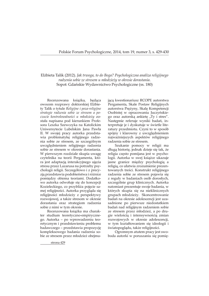 Polskie Forum Psychologiczne, 2014, tom 19, numer 3, s. 429