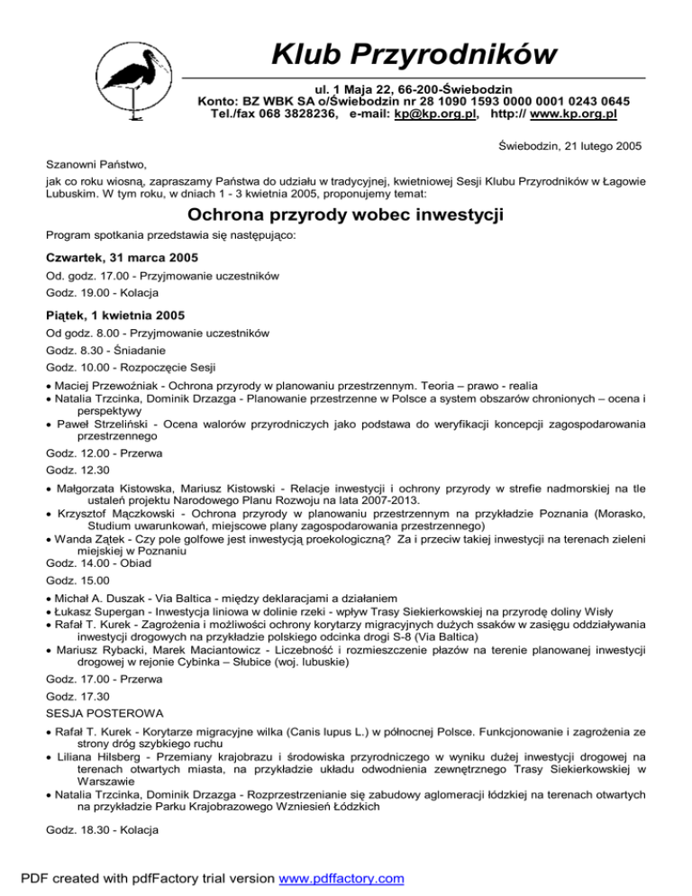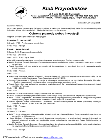 Klub Przyrodników ul. 1 Maja 22, 66-200-Świebodzin Konto: BZ WBK SA o/Świebodzin nr 28 1090 1593 0000 0001 0243 0645 Tel./fax 068 3828236, e-mail: [email protected], http:// www.kp.org.pl Świebodzin, 21 lutego 2005 Szanowni Państwo, jak co roku wiosną, zapraszamy Państwa do udziału w tradycyjnej, kwietniowej Sesji Klubu Przyrodników w Łagowie Lubuskim. W tym roku, w dniach 1 - 3 kwietnia 2005, proponujemy temat: Ochrona przyrody wobec inwestycji Program spotkania przedstawia się następująco: Czwartek, 31 marca 2005 Od. godz. 17.00 - Przyjmowanie uczestników Godz. 19.00 - Kolacja Piątek, 1 kwietnia 2005 Od godz. 8.00 - Przyjmowanie uczestników Godz. 8.30 - Śniadanie Godz. 10.00 - Rozpoczęcie Sesji • Maciej Przewoźniak - Ochrona przyrody w planowaniu przestrzennym. Teoria – prawo - realia • Natalia Trzcinka, Dominik Drzazga - Planowanie przestrzenne w Polsce a system obszarów chronionych – ocena i perspektywy • Paweł Strzeliński - Ocena walorów przyrodniczych jako podstawa do weryfikacji koncepcji zagospodarowania przestrzennego Godz. 12.00 - Przerwa Godz. 12.30 • Małgorzata Kistowska, Mariusz Kistowski - Relacje inwestycji i ochrony przyrody w strefie nadmorskiej na tle ustaleń projektu Narodowego Planu Rozwoju na lata 2007-2013. • Krzysztof Mączkowski - Ochrona przyrody w planowaniu przestrzennym na przykładzie Poznania (Morasko, Studium uwarunkowań, miejscowe plany zagospodarowania przestrzennego) • Wanda Zątek - Czy pole golfowe jest inwestycją proekologiczną? Za i przeciw takiej inwestycji na terenach zieleni miejskiej w Poznaniu Godz. 14.00 - Obiad Godz. 15.00 • Michał A. Duszak - Via Baltica - między deklaracjami a działaniem • Łukasz Supergan - Inwestycja liniowa w dolinie rzeki - wpływ Trasy Siekierkowskiej na przyrodę doliny Wisły • Rafał T. Kurek - Zagrożenia i możliwości ochrony korytarzy migracyjnych dużych ssaków w zasięgu oddziaływania inwestycji drogowych na przykładzie polskiego odcinka drogi S-8 (Via Baltica) • Mariusz Rybacki, Marek Maciantowicz - Liczebność i rozmieszczenie płazów na terenie planowanej inwestycji drogowej w rejonie Cybinka – Słubice (woj. lubuskie) Godz. 17.00 - Przerwa Godz. 17.30 SESJA POSTEROWA • Rafał T. Kurek - Korytarze migracyjne wilka (Canis lupus L.) w północnej Polsce. Funkcjonowanie i zagrożenia ze strony dróg szybkiego ruchu • Liliana Hilsberg - Przemiany krajobrazu i środowiska przyrodniczego w wyniku dużej inwestycji drogowej na terenach otwartych miasta, na przykładzie układu odwodnienia zewnętrznego Trasy Siekierkowskiej w Warszawie • Natalia Trzcinka, Dominik Drzazga - Rozprzestrzenianie się zabudowy aglomeracji łódzkiej na terenach otwartych na przykładzie Parku Krajobrazowego Wzniesień Łódzkich Godz. 18.30 - Kolacja PDF created with pdfFactory trial version www.pdffactory.com Godz. 19.30 - Ognisko, spotkanie towarzyskie Sobota, 2 kwietnia 2005 Godz. 8.00 - Śniadanie Godz. 9.00 • Andrzej Jermaczek – O czym milczą oceny? Odległe oddziaływania inwestycji • Ryszard Czeraszkiewicz, Jacek Kaliciuk - Zagrożenia dla ostoi ptaków związane z eksploatacją trzciny i budową elektrowni wiatrowych na Pomorzu Zachodnim • Radosław Ślusarczyk - Wartości przyrodnicze Tatrzańskiego Parku Narodowego a plany gospodarczego rozwoju Powiatu Tatrzańskiego - konflikty i zagrożenia • Jacek Potocki - Konflikt między narciarstwem a ochroną przyrody w Karkonoszach w świetle danych klimatycznych Godz. 11.00 - Przerwa Godz. 11.30 • Ewa Weremczuk - Miejsce Natury 2000 w projektowanym studium uwarunkowań i kierunków zagospodarowania przestrzennego gmin • Liliana Hilsberg - Zieleń jako element ochrony środowiska nowej drogi - ostatni etap projektowania i wykonania inwestycji • Alicja Kolasińska - Infrastruktura komunikacyjna Zespołu Przyrodniczo - Krajobrazowego Morasko w Poznaniu siecią korytarzy ekologicznych Godz. 13.00 - Obiad Godz. 14.00 • Lars Briggs - Przejścia dla płazów - praktyczne zastosowanie dostępnych rozwiązań technicznych • Krzysztof Baldy - Monitoring efektu ekologicznego tuneli dla płazów pod drogą powiatową w Jeleniowie/Kudowie • Ignacy Kutyna, Katarzyna Dziubak - Zbiorowiska roślinne występujące na terenie zbiornika odpadów poflotacyjnych Gilów • Marzena Fedorowicz - Sposoby zagospodarowywania gruntów pokopalnianych a ochrona przyrody, na przykładzie działań Kopalni Węgla Brunatnego „Konin” • Bernard Konca - Człowiek - krajobraz - gatunki specjalnej troski na Dolnym Śląsku i Ziemi Lubuskiej Godz. 16.30 - Przerwa Godz. 17.00 - DYSKUSJA GENERALNA, WNIOSKI Godz. 18.00 - Kolacja Godz. 19.00 - Pokazy przeźroczy (zapraszamy do prezentacji, mniej lub bardziej związanych z tematyką sesji), spotkanie towarzyskie Niedziela, 3 kwietnia 2005 Godz. 8.00 - Śniadanie Godz. 8.30 - Wyjazd na wycieczkę (Autostrada A2 i inne inwestycje w zachodniej Wielkopolsce i Ziemi Lubuskiej) Godz. 15.00 - Powrót z wycieczki, obiad Koszty udziału w sesji podaje załączona tabela. Wybrane opcje należy zaznaczyć, kwoty zsumować, a otrzymaną wartość wplacić na konto Klubu podane pod tabelą. Zniżka wpisowego dotyczy tylko Osób zapisanych do Klubu do dnia 20 lutego 2005, z opłacona składką za rok 2004 lub 2005. Jak co roku autorów wystąpień i posterów (które znalazły się w programie) zwalniamy z wpisowego. Udział w sesji gwarantujemy tylko osobom, które w nieprzekraczalnym terminie do 20 marca 2005 dokonają rezerwacji przesyłając poniższą kartę zgłoszenie pocztą, faxem lub emailem na adres Klubu. Noclegi i posiłki rezerwujemy w Ośrodku Leśnik. W przypadku wyczerpania się jakiejś kategorii noclegów będziemy Państwu proponować inne. W przypadku rezerwacji posiłków wegeteriańskich prosimy o zakreślenie odpowiedniej rubryki. Dojazd do Łagowa we własnym zakresie (informacja o odjazdach autobusów PKS ze Świebodzina - 0683822693), w niedzielę będzie można wróc