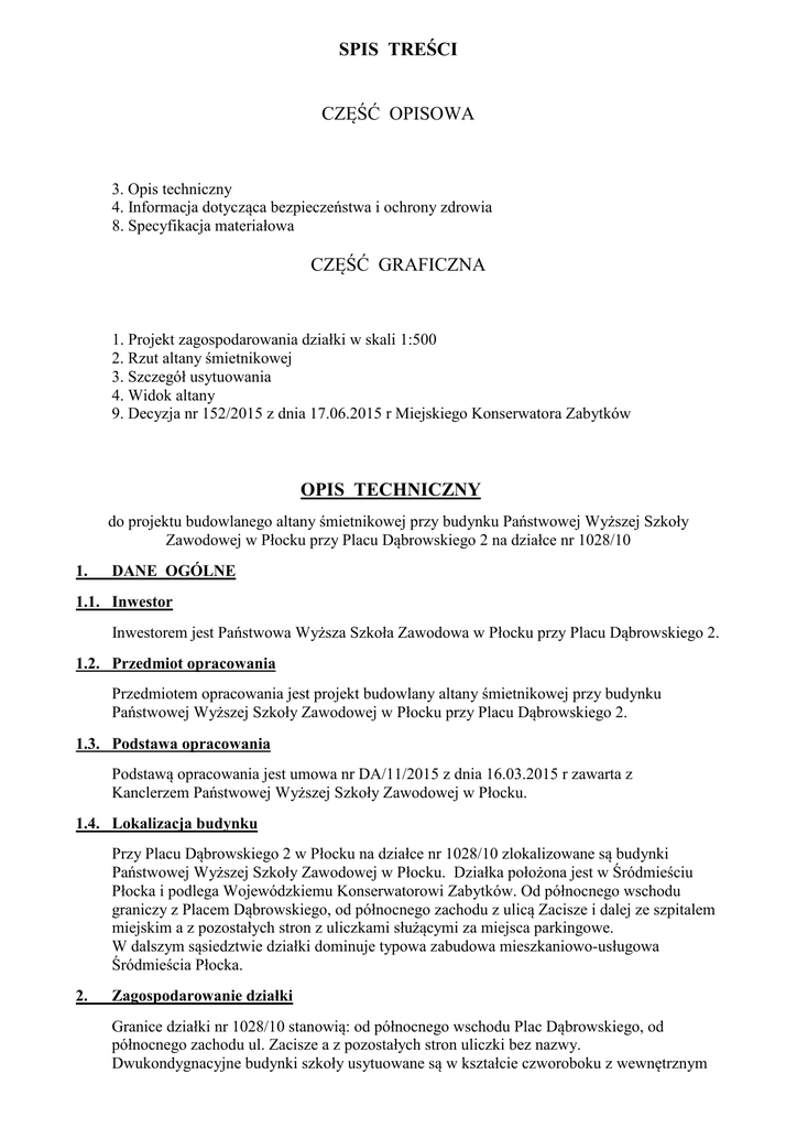 SPIS TREŚCI CZĘŚĆ OPISOWA 3. Opis techniczny 4. Informacja dotycząca bezpieczeństwa i ochrony zdrowia 8. Specyfikacja materiałowa CZĘŚĆ GRAFICZNA 1. Projekt zagospodarowania działki w skali 1:500 2. Rzut altany śmietnikowej 3. Szczegół usytuowania 4. Widok altany 9. Decyzja nr 152/2015 z dnia 17.06.2015 r Miejskiego Konserwatora Zabytków OPIS TECHNICZNY do projektu budowlanego altany śmietnikowej przy budynku Państwowej Wyższej Szkoły Zawodowej w Płocku przy Placu Dąbrowskiego 2 na działce nr 1028/10 1. DANE OGÓLNE 1.1. Inwestor Inwestorem jest Państwowa Wyższa Szkoła Zawodowa w Płocku przy Placu Dąbrowskiego 2. 1.2. Przedmiot opracowania Przedmiotem opracowania jest projekt budowlany altany śmietnikowej przy budynku Państwowej Wyższej Szkoły Zawodowej w Płocku przy Placu Dąbrowskiego 2. 1.3. Podstawa opracowania Podstawą opracowania jest umowa nr DA/11/2015 z dnia 16.03.2015 r zawarta z Kanclerzem Państwowej Wyższej Szkoły Zawodowej w Płocku. 1.4. Lokalizacja budynku Przy Placu Dąbrowskiego 2 w Płocku na działce nr 1028/10 zlokalizowane są budynki Państwowej Wyższej Szkoły Zawodowej w Płocku. Działka położona jest w Śródmieściu Płocka i podlega Wojewódzkiemu Konserwatorowi Zabytków. Od północnego wschodu graniczy z Placem Dąbrowskiego, od północnego zachodu z ulicą Zacisze i dalej ze szpitalem miejskim a z pozostałych stron z uliczkami służącymi za miejsca parkingowe. W dalszym sąsiedztwie działki dominuje typowa zabudowa mieszkaniowo-usługowa Śródmieścia Płocka. 2. Zagospodarowanie działki Granice działki nr 1028/10 stanowią: od północnego wschodu Plac Dąbrowskiego, od północnego zachodu ul. Zacisze a z pozostałych stron uliczki bez nazwy. Dwukondygnacyjne budynki szkoły usytuowane są w kształcie czworoboku z wewnętrznym dziedzińcem w kształcie prostokąta, który w większej części przeznaczony jest na parking szkolny a w centralnej i północnej części na trawniki. Wjazd i wejście na dziedziniec jest poprzez bramę od strony ulicy Zacisze. Zakres robót w niniejszym projekcie obejmuje budowę altany śmietnikowej usytuowanej w jedynym możliwym miejscu na działce z uwagi na: a) bardzo dobry dojazd samochodem służb miejskich opróżniających pojemniki, b) najkrótszą drogę dojścia z odpadkami od drzwi wejściowych do budynku szkoły, c) a także z uwagi na niewielką odległość granicy działki od ścian budynków szkoły w innych lokalizacjach. Altanę usytuowano w odległości 3 m od granicy działki wzdłuż ulicy Zacisze oraz 3,3 m od granicy południowej. Altana zajmie niewielką część trawnika (1,01 m2 ) z powodu usytuowania jej równolegle do granicy działki w odległości 3 m oraz jedno miejsce parkingowe. Altanę śmietnikową usytuowano w taki sposób, aby jej odległość od najbliżej usytuowanych okien w budynku szkoły była równa 10,0 m zgodnie z Rozporządzeniem Ministra Infrastruktury z dnia 12 kwietnia 2002 r w sprawie warunków technicznych, jakim powinny odpowiadać budynki i ich usytuowanie § 23. 1 zamieszczonym w Dz. U. nr 75 poz. 690. Wykonanie altany śmietnikowej jest niezbędne ponieważ aktualnie pojemniki na odpady znajdują się pod ścianą szkoły i są dostępne dla osób trzecich nie wyłączając złomiarzy i wandali. 3. Roboty budowlane Altana śmietnikowa przeznaczona będzie do zamykania trzech istniejących, typowych, wykonanych z tworzyw sztucznych pojemników na odpady stałe o wymiarach w rzucie 140 x 110 cm. ark. 4 Altana będzie zamykana na klucz z dostępem wyłącznie dla osób zatrudnionych w PWSZ, co uchroni szkołę przed plagą wyrzucania śmieci nie do swoich pojemników. Altana zaprojektowana jest w poziomie parkingu przed budynkiem PWSZ od strony zachodniej. Roboty należy rozpocząć od rozbiórki 4,5 mb krawężnika ulicznego. W poziomie parkingu należy wykonać poziomą płytę z betonu C 16/20 w kształcie trapezu o wymiarach 450x(30-45) cm i grubości 10 cm. Płytę wykonać „na mokro” na podsypce piaskowej grubości 10 cm. Zamiast płyty betonowej można wykonać utwardzenie z kostki brukowej Polbruk grubości 8 cm na podsypce piaskowo-cementowej grubości 10 cm. Konstrukcja szkieletu altany oraz furtka wykonana będzie z wysokiej jakości stalowych profili zamkniętych o grubości ścianki 3 mm. Stal jest ocynkowano ogniowo i malowana proszkowo na kolor szary RAL 7040. Elewacja między słupkami wykonana będzie z paneli klinkierowych wykonanych z pcv z filtrem uv, o wzorze czerwonej cegły klinkierowej (kwarc oraz odpowiednio dobrane żywice i polimery) pokrytych powłoką polimerową zwiększającą odporność na warunki atmosferyczne dzięki czemu elewacja przez wiele lat wygląda jak nowa. Ponadto system bio protect chroni panele przed działaniem szkodliwych czynników pochodzenia biologicznego: grzybów, bakterii czy glonów powodujących nieestetyczne przebarwienia. Od wewnątrz altany jest stalowa ocynkowana blacha trapezowa. Dach jest czterospadowy z blachy stalowej ocynkowanej płaskiej na rąbek stojący w kolorze grafitowym ułożonej na łatach drewnianych a te z kolei na krokiewkach ze stalowych profili zamkniętych. Wokół dachu montowana jest rynna pcv a deszczówka odprowadzana będzie na trawnik po zachodniej stronie altany. Poniżej rynny znajduje się ocynkowana siatka stalowa krępowana wymuszająca wentylację grawitacyjną altany – nawiew przez furtkę. Wnętrze z blachy ocynkowanej i elewacja z paneli są łatwe w utrzymaniu czystości – umycie ich przy pomocy wody i detergentów nie będzie sprawiać trudności a szczelina pomiędzy płytą posadzki a panelami ścian pozwala na odprowadzenia wody podczas mycia. Konstrukcja altany jest całkowicie niepalna (profile stalowe i blacha stalowa oraz niepalne panele ścienne). Konstrukcja altany jest możliwa do demontażu i ponownego montażu w przypadku zmiany zagospodarowania działki. Wymiary altany w planie 450 x 200 cm. Powierzchnia zab