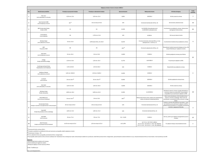 Najlepszy kredyt w koncie w kwocie 10000 zł Poz. Bank/nazwa produktu Prowizja za przyznanie kredytu Prowizja za odnowienie kredytu Oprocentowanie Maksymalna kwota Od kiedy dostępny Liczba punktów 1 Alior Sync Limit odnawialny w rachunku 0,5% min. 25 zł 0,5% min. 25 zł 9,60% 100 000 zł W dniu zawarcia umowy 7 2 Bank Zachodni WBK Limit kredytowy w koncie 0% 1) 1% nie mniej niż 50 zł 16% 6 krotność dochodu (do 120 tys. zł) Od momentu założenia konta 5,5 3 BNP Paribas Bank Polska Kredyt w ROR 1% 1% 15,50% do 100 000 zł (niezabezpieczony) do 600 000 zł (zabezpieczony) Uruchamiany po podpisaniu umowy i dostarczeniu wymaganych dokumentów 4,5 Citi Handlowy Linia kredytowa 0% 1,75% min. 50 zl 16% 60 000 zł Od razu po otwarciu konta ING Bank Śląski Limit zadłużenia w koncie 1% min. 50 zł 1,8% kwoty limitu, min. 68 zł 14,25% 6 krotność dochodu netto (do 200 tys. zł, bez zabezpieczenia - do 50 tys. zł) Uruchomienie niezwłocznie po podpisaniu umowy BOŚ Pozyczka w ROR 0% 2% 16% 3) 8 krotność wpływów (do 100 tys. zł) Dla podanych założeń pożyczka dostępna od razu. Dla nowych Klientów po 1 wpływie na konto. Getin Bank Limit kredytowy w koncie 1% min. 50 zł 1% min. 50 zł 12,86% 50 000 zł Od dnia podpisania umowy przez Klienta Inteligo Kredyt odnawialny Inteligo 1,5% min. 40 zł 1,5% min. 50 zł 15,75% do 60 000 zł Po pierwszym wpływie na ROR. Credit Agricole Bank Polska Indywidualna Linia Kredytowa 1,5% min 60 zł 1,5% min 60 zł 16% 50 000 zł Bezpośrednio po podpisaniu umowy Raiffeisen Polbank Limit zadłużenia w koncie 1,6% min. 50,00 zł 1,3% min. 50,00 zł 13,49% 60 000 zł eurobank Limit w koncie 2% min. 60 zł 2) 2% min. 60 zł 2) 10,90% 100 000 zł Od dnia podpisania umowy konta Alior Bank Limit odnawialny w rachunku 1,6% min. 60 zł 1,6% min. 60 zł 14,00% 100 000 zł W dniu zawarcia umowy PKO Bank Polski Kredyt odnawialny 1,85% min. 60 zł 1,85% min. 60 zł 15,90% do 100 000 zł Możliwość zawarcia umowy o kredyt odnawialny w momencie zawarcia umowy ROR. W pozostałych przypadkach już po pierwszym wpływie na ROR. Bank Millennium Limit w Koncie Osobistym 1% min. 50 zł 4) 1% min. 50 zł 16% 5) Maksymalna kwota Limitu ustalana jest indywidualnie i zależy od zdolności kredytowej Klienta. Nordea Bank Polska Kredyt w rachunku oszczędnościowo-rozliczeniowym 2% nie mniej niż 50 zł 2% nie mniej niż 50 zł 15% 4 krotność dochodu (do 50 tys. zł) Bank BGŻ Kredyt dla posiadaczy konta osobistego 1,8% min. 55 zł 1,8% min. 55 zł 16% 6 krotność dochodu (50 tys. zł) 9 Bank BPH Limit na koncie 2% min. 75 zł 2% min. 75 zł 13,3 - 16,0% 50 000 zł Od razu, jeżeli są już wpływy wynagrodzenia przez 6 miesięcy 1,5 10 Bank Pocztowy Kredyt w Pocztowym Koncie Standard do 5% nie mniej niż 25 zł 1,5% nie mniej niż 25 zł od 11,49% po 1 m-cu - do 1-krotn. wpływu po 3 m-cach - do 3-krotn. śr. mies. reg. wpływów po 12 m-cach - do 6-krotn. śr. mies. reg. wpływów Po upływie miesiąca od prowadzenia konta 1 4 5 6 4 3,5 7 8 3 Klient może wnioskowac o limit niezwłocznie po otwarciu rachunku osobistego. Klient może też wnioskować o przeniesienie limitu w koncie z innego banku. Kredyt w rachunku dla podanych warunków - może być udzielony już po pierwszym wpływie na ROR w zadeklarowanej wysokości w przypadku przeniesienia rachunku i wpływów do Nordea. 1) Promocja do końca czerwca 2014 r. 2) Prowizja za udzielenie i przedłużenie limitu jest zwracana w przypadku stałych wpływów na konto 3) W pierwszym miesiącu - 0% 4) 0 zł za udzielenie limitu w przypadku przeniesienia limitu z innego banku 5) W przypadku wykorzystania Limitu w koncie osobistym do 7 dowolnych dni w miesięcznym cyklu rozliczeniowym odsetki nie są naliczane. Jeżeli klient przenosi limit z innego banku, oprocentowanie zostanie obniżone o 2 p.p. od oprocentowania limitu w innym banku i może wynieść już od 10% Założenia: - Klient posiada konto osobiste od 6 miesięcy - Konto osobiste jest regularnie zasilane - Miesięczne wpływy na konto wynoszą 2700 zł Źródło: TotalMoney.pl Stan na 22 listopada 2013 r. 2,5 2