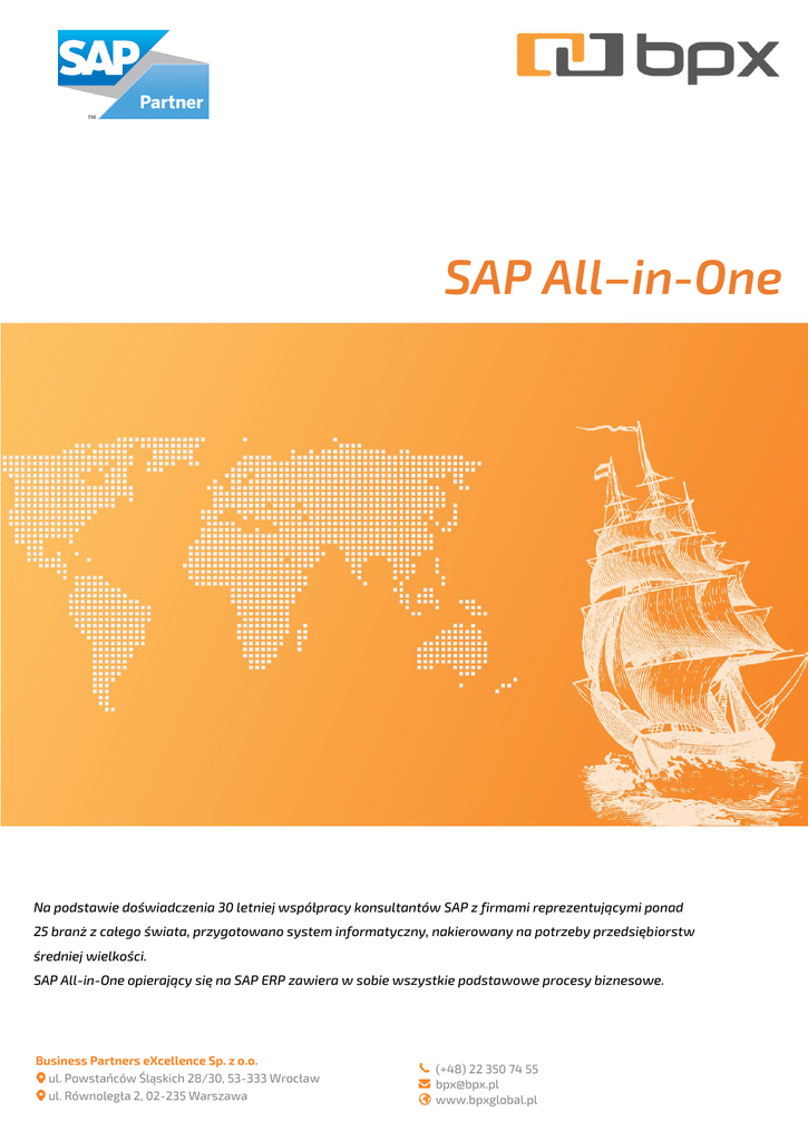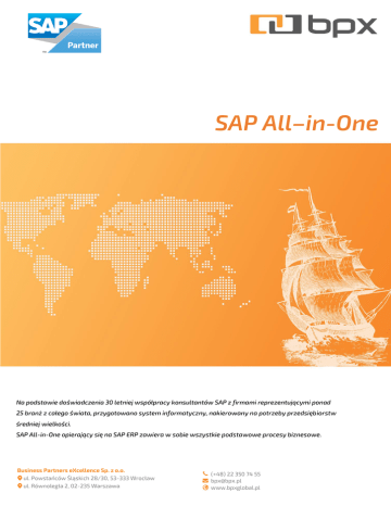 SAP All–in-One Na podstawie doświadczenia 30 letniej współpracy konsultantów SAP z firmami reprezentującymi ponad 25 branż z całego świata, przygotowano system informatyczny, nakierowany na potrzeby przedsiębiorstw średniej wielkości. SAP All-in-One opierający się na SAP ERP zawiera w sobie wszystkie podstawowe procesy biznesowe. Business Partners eXcellence Sp. z o.o. ul. Powstańców Śląskich 28/30, 53-333 Wrocław ul. Równoległa 2, 02-235 Warszawa (+48) 22 350 74 55 [email protected] www.bpxglobal.pl Korzyści z wdrożenia Elastyczna i zintegrowana obsługa wszystkich procesów biznesowych, efektywna realizacja wszelkich działań operacyjnych, spójność informacji we wszystkich jednostkach organizacyjnych, możliwość błyskawicznej reakcji na zmiany zachodzące w otoczeniu, brak ograniczeń co do rozwoju oraz rozszerzania procesów biznesowych, udoskonalony proces decyzyjny na każdym szczeblu organizacyjnym firmy, przejrzystość informacji dzięki stale aktualizowanym raportom (dostępne po jednym kliknięciu), światowej klasy praktyki biznesowe i wiedza branżowa, które zapewniają wysoką dochodowość. Obszary funkcjonalne Rachunkowość finansowa Bilans, rachunek zysków i strat, księga główna, rozrachunki, księgowość. Rachunkowość zarządcza Rachunek miejsc powstawania kosztów, centrum zysku, koszty. Procesy sprzedaży od zlecenia do płatności, Procesy zaopatrzeniowe – od nabycia do płatności, ustalanie cen dostawy, gospodarka zapasami. rozliczenia. sprawozdawczość finansowa, planowanie budżetu, zarządzanie rentownością. Zamówienia i zapasy Sprzedaż i dystrybucja Raporty i analizy Produkcja Planowanie popytu, potrzeb materiałowych oraz zdolności produkcyjnych, zarządzanie partiami oraz jakością. Realizacja wdrożeń SAP Business All–in-One Kompleksowa oferta wdrożenia oparta o wieloletnie doświadczenie BPX zawiera: Przygotowanie wdrożenia włącznie z analizą przedwdrożeniową Dostawę licencji Przeprowadzenie usług wdrożeniowych Przeprowadzenie szkoleń Dostawę platformy sprzętowej Usługi serwisu i rozwoju systemu Dzięki możliwości pełnej realizacji wdrożenia przez jednego doświadczonego dostawcę, Klient ma gwarancję pełnego sukcesu związanego z wprowadzeniem nowego systemu ERP. Bezpieczne wdrożenie funkcjonalności podstawowych trwa 12-14 tygodni. Przy realizacji prac opieramy się na sprawdzonych i uznanych na świecie metodykach realizacji projektów ASAP, PRINCE2 oraz PMI. Aby uzyskać szczegółowe informacje o kompetencjach BPX w zakresie poszczególnych modułów funkcjonalnych, skontaktuj się z nami. KONTAKT: (+48) 22 350 74 55 [email protected] www.bpxglobal.pl