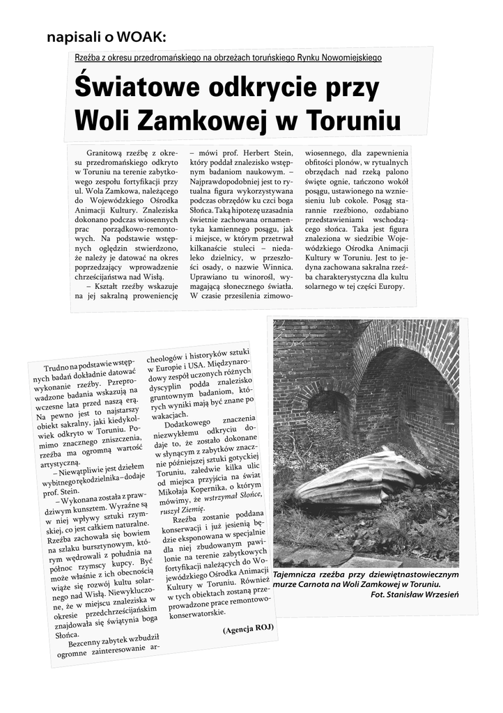 napisali o WOAK: Rzeźba z okresu przedromańskiego na obrzeżach toruńskiego Rynku Nowomiejskiego Światowe odkrycie przy Woli Zamkowej w Toruniu Granitową rzeźbę z okresu przedromańskiego odkryto w Toruniu na terenie zabytkowego zespołu fortyfikacji przy ul. Wola Zamkowa, należącego do Wojewódzkiego Ośrodka Animacji Kultury. Znaleziska dokonano podczas wiosennych prac porządkowo-remontowych. Na podstawie wstępnych oględzin stwierdzono, że należy je datować na okres poprzedzający wprowadzenie chrześcijaństwa nad Wisłą. – Kształt rzeźby wskazuje na jej sakralną proweniencję – mówi prof. Herbert Stein, który poddał znalezisko wstępnym badaniom naukowym. – Najprawdopodobniej jest to rytualna figura wykorzystywana podczas obrzędów ku czci boga Słońca. Taką hipotezę uzasadnia świetnie zachowana ornamentyka kamiennego posągu, jak i miejsce, w którym przetrwał kilkanaście stuleci – niedaleko dzielnicy, w przeszłości osady, o nazwie Winnica. Uprawiano tu winorośl, wymagającą słonecznego światła. W czasie przesilenia zimowo- wiosennego, dla zapewnienia obfitości plonów, w rytualnych obrzędach nad rzeką palono święte ognie, tańczono wokół posągu, ustawionego na wzniesieniu lub cokole. Posąg starannie rzeźbiono, ozdabiano przedstawieniami wschodzącego słońca. Taka jest figura znaleziona w siedzibie Wojewódzkiego Ośrodka Animacji Kultury w Toruniu. Jest to jedyna zachowana sakralna rzeźba charakterystyczna dla kultu solarnego w tej części Europy. sztuki w i historyków gó lo eo ch iędzynarotawie wstęp ropie i USA. M Eu Trudno na pods w ać w nych różnych kładnie dato wy zespół uczo do nych badań do ko opr re dda znalezis eźby. Pz dyscyplin po wykonanie rz ókt na , ą uj om az ni sk bada nia w gruntownym wadzone bada po ą. e er an ą zn sz ć na by d ą aj prze rych wyniki m wczesne lata to najstarszy st je . ch no ja w ac pe ak Na - w znaczenia , jaki kiedykol Dodatkowego obiekt sakralny Po u. yc ni odkr iu do w Toru niezwykłemu wiek odkryto ne a, na ni ko ze do zc is o stał ego zn daje to, że zo mimo znaczn ną wartość bytków znaczm za ro z og ym a ąc m yn w sł rzeźba ki gotyckiej późniejszej sztu e ni artystyczną. ic m łe ie jest dz dwie kilka ul – Niewątpliwie Toruniu, zale t ia je św da do na – a a zyjści dzielnik od miejsca pr wybitnego ręko ym ór kt o , ka erni Mikołaja Kop prof. Stein. ce, stała z prawzo wstrzymał Słoń a an że on y, yk im W ów – m są ne em. Wyraź ył Ziemię. dziwym kunszt rzym- rusz ki ie poddana tu sz y yw Rzeźba zostan w niej wpł e. ln ra enią bętu na łkiem acji i już jesi w er ns ko skiej, co jest ca specjalnie ała się bowiem sponowana w ek ie dz Rzeźba zachow óym pawiztynowym, kt niej zbudowan a dl na szlaku burs na ia zabytkowych i z połudn nie na terenie lo rym wędrowal oć By y. leżących do W scy kupc fortyfikacji na północ rzym ji ac ią m śc ni no A ec ka ob Tajemnicza rzeźba przy dziewiętnastowiecznym z ich iego Ośrod zk ód w je może właśnie eż rni niu. Rów kultu sola ru ój To murze Carnota na Woli Zamkowej w Toruniu. zw w ro ę ry si tu Kul wiąże h zostaną prze Niewykluczoac . łą kt is ie Fot. Stanisław Wrzesień W ob d ch na ty nego w w wocu znaleziska prace remonto js ne ie m zo ad w ow że , pr ne m dchrześcijański atorskie. okresie prze ga konserw bo a ni ty ią św ę si a ał znajdow (Agencja ROJ) Słońca. ł zi ud tek wzb Bezcenny zaby sowanie arre te in ogromne za