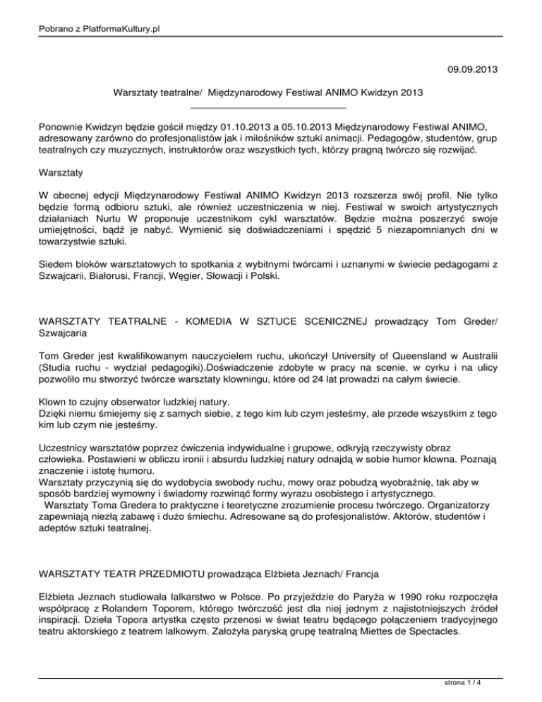 Pobrano z PlatformaKultury.pl 09.09.2013 Warsztaty teatralne/ Międzynarodowy Festiwal ANIMO Kwidzyn 2013 ____________________________ Ponownie Kwidzyn będzie gościł między 01.10.2013 a 05.10.2013 Międzynarodowy Festiwal ANIMO, adresowany zarówno do profesjonalistów jak i miłośników sztuki animacji. Pedagogów, studentów, grup teatralnych czy muzycznych, instruktorów oraz wszystkich tych, którzy pragną twórczo się rozwijać. Warsztaty W obecnej edycji Międzynarodowy Festiwal ANIMO Kwidzyn 2013 rozszerza swój profil. Nie tylko będzie formą odbioru sztuki, ale również uczestniczenia w niej. Festiwal w swoich artystycznych działaniach Nurtu W proponuje uczestnikom cykl warsztatów. Będzie można poszerzyć swoje umiejętności, bądź je nabyć. Wymienić się doświadczeniami i spędzić 5 niezapomnianych dni w towarzystwie sztuki. Siedem bloków warsztatowych to spotkania z wybitnymi twórcami i uznanymi w świecie pedagogami z Szwajcarii, Białorusi, Francji, Węgier, Słowacji i Polski. WARSZTATY TEATRALNE - KOMEDIA W SZTUCE SCENICZNEJ prowadzący Tom Greder/ Szwajcaria Tom Greder jest kwalifikowanym nauczycielem ruchu, ukończył University of Queensland w Australii (Studia ruchu - wydział pedagogiki).Doświadczenie zdobyte w pracy na scenie, w cyrku i na ulicy pozwoliło mu stworzyć twórcze warsztaty klowningu, które od 24 lat prowadzi na całym świecie. Klown to czujny obserwator ludzkiej natury. Dzięki niemu śmiejemy się z samych siebie, z tego kim lub czym jesteśmy, ale przede wszystkim z tego kim lub czym nie jesteśmy. Uczestnicy warsztatów poprzez ćwiczenia indywidualne i grupowe, odkryją rzeczywisty obraz człowieka. Postawieni w obliczu ironii i absurdu ludzkiej natury odnajdą w sobie humor klowna. Poznają znaczenie i istotę humoru. Warsztaty przyczynią się do wydobycia swobody ruchu, mowy oraz pobudzą wyobraźnię, tak aby w sposób bardziej wymowny i świadomy rozwinąć formy wyrazu osobistego i artystycznego. Warsztaty Toma Gredera to praktyczne i teoretyczne zrozumienie procesu twórczego. Organizatorzy zapewniają niezłą zabawę i dużo śmiechu. Adresowane są do profesjonalistów. Aktorów, studentów i adeptów sztuki teatralnej. WARSZTATY TEATR PRZEDMIOTU prowadząca Elżbieta Jeznach/ Francja Elżbieta Jeznach studiowała lalkarstwo w Polsce. Po przyjeździe do Paryża w 1990 roku rozpoczęła współpracę z Rolandem Toporem, którego twórczość jest dla niej jednym z najistotniejszych źródeł inspiracji. Dzieła Topora artystka często przenosi w świat teatru będącego połączeniem tradycyjnego teatru aktorskiego z teatrem lalkowym. Założyła paryską grupę teatralną Miettes de Spectacles. strona 1 / 4 Pobrano z PlatformaKultury.pl W poruszających wyobraźnię warsztatach uczestnicy podejmą próbę dialogu aktora z przedmiotem, dokonają teatralizacji rzeczy codziennego użytku. Użyją przedmiotów przyniesionych przez siebie do tego, by w poetycki sposób ukazać otaczającą nas rzeczywistość. Zagłębią się w świat fantazji, snów i marzeń. Poznają znaczenie teatralizacji przedmiotu również jako obiektu scenograficznego. Warsztaty są adresowane zarówno do profesjonalistów jak i amatorów. Miłośników sztuk plastycznych, wizualnych. Ludzi obdarzonych wyobraźnią i abstrakcyjnym myśleniem. Prosimy uczestników o przyniesienie ze sobą przedmiotów związanych z jakąś ciekawą historią, można też wziąć ze sobą ulubioną muzykę. Organizatorzy wierzą, że uczestnicy będą mieli okazję wyzwolić swoją kreatywność, tak aby dzięki twórczej współpracy w grupie pod kierunkiem Elżbiety Jeznach stworzyć cudowny spektakl, na który będą mogli zaprosić festiwalowych gości. WARSZTATY ANIMACJI LALKĄ TEATRALNĄ prowadząca Marina Lazariewa/Białoruś Marina Lazariewa – aktorka, scenograf i reżyser teatru lalek. Jest absolwentką Petersburskiej Akademii Sztuki Teatralnej - Sankt Petersburg / Rosja. Ukończyła również Akademię Sztuk w Grodnie ze specjalnością reżyser imprez masowych - kierunek pedagogiczny. Pracowała ponad 20 lat w Obwodowym Teatrze Lalek w Grodnie. Jako reżyser promuje sztukę teatralną związaną z folklorem i kulturą białoruską. Prowadzi edukację teatralną dla dzieci i młodzieży. Wielokrotnie prowadziła warsztaty dla nauczycieli i instruktorów teatralnych. Jest twórcą i założycielem Teatru Domowego Maria Iskusnica z Grodna. Warsztaty skoncentrują się na tradycyjnych technikach animacji lalką teatralną. Będą odbywały się na podstawowym poziomie pierwszego semestru nauki animacji w Akademii Teatralnej. Będą bazowały na improwizowanej akcji scenicznej przy użyciu lalek ćwiczebnych. Doprowadzą do stworzenia lalkowej postaci teatralnej. Dadzą podstawy do pracy z dziećmi i młodzieżą przy tworzeniu amatorskich spektakli lalkowych. Wynik warsztatowej pracy zostanie zaprezentowany w ostatnim dniu festiwalu, pod postacią mini spektaklu. Warsztaty są adresowane do amatorskich grup teatralnych, instruktorów, pedagogów, nauczycieli, osób prowadzących zajęcia teatralne, miłośników teatru, którzy chcą zdobyć praktyczne wiadomości na temat animacji lalką teatralną, a także dla profesjonalistów, którzy nie znają sztuki animacji. Organizatorzy mają nadzieję, że spotkania z Mariną Lazariewą staną się początkiem fascynacji sztuką lalkarską. WARSZTATY SAMORÓBKA prowadzący Paweł Romańczuk/Polska Paweł Romańczuk -muzyk i kompozytor. Od 2006 roku rozwija poszukiwania w dziedzinie małych instrumentów. Jest autorem muzyki do filmów, spektakli teatralnych. Buduje własne instrumenty, konstrukcje grające, tworzy instalacje dźwiękowe. W 2010 roku opublikował pierwsze opracowanie historii toy piano. Prowadzi warsztaty, prezentacje, wykłady i wystawy związane z instrumentami i eksperymentami dźwiękowymi. Założyciel grupy Małe Instrumenty z Wrocławia. Współpracował z Pierre’em Bastienem, Margar