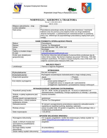 European Employment Services Wojewódzki Urząd Pracy w Rzeszowie (Gdańsk) NORWEGIA – KIEROWCA TRAKTORA Nr ref. 1120-2012-02-3 ISCO: 8341 Norwegia 1 Pracodawca poszukuje osoby do pracy jako kierowca i mechanik traktora oraz do pomocy przy dojeniu krów (co drugi weekend). Jedynie kandydaci z potwierdzonym doświadczeniem w podobnej pracy (np. referencje od poprzedniego pracodawcy) będą brani pod uwagę. Miejsce zatrudnienia – kraj: Liczba wakatów: Opis pracy Status: Nazwa: Adres: Kraj: Telefon (z kodem kraju): E-mail: Krótki opis działalności gospodarczej: DANE PODMIOTU OFERUJĄCEGO PRACĘ Pracodawca Farmer Tor Stangeland Stanglandsveien 185, 4354 Voll Norwegia + 47 909 88 885 [email protected] Na farmie mlecznej zatrudniającej 2 pracowników produkuje się ok. milion litrów mleka. Na farmie znajduje się ponad 150 krów, 150-200 młodych osobników, 70 cieląt w nowym budynku oraz 2100 świń. Do dojenia używana jest maszyna SAC 2x8. Lokalizacja: Wykształcenie: Doświadczenie: Znajomość języków: Inne istotne wymagania: MIEJSCE PRACY Farma w regionie Rogaland WYMAGANIA Nie jest wymagane Wymagane wcześniejsze doświadczenie w tego rodzaju pracy. Język Poziom 1. angielski 1. dobry - prawo jazdy kategorii T - umiejętność pracy w zespole jak i samodzielnie - umiejętność naprawienia i prowadzenia maszyn rolniczych WYNAGRODZENIE I WARUNKI ZATRUDNIENIA Wysokość pensji brutto: Od 121 NOK brutto za godzinę (ok. 15 euro) w zależności od doświadczenia i kwalifikacji. Pensja wypłacana co miesiąc + prowizja. Waluta, w jakiej wypłacana jest korona norweska pensja: Rodzaj stawki wynagrodzenia: godzinowa Nazwa firmy, z którą zostanie Farmer Tor Stangeland podpisana umowa: Zakwaterowanie: W ramach wynagrodzenia pracodawca zapewnia zakwaterowanie – sypialnię ze wspólną kuchnią, łazienką i salonem. Rodzaj umowy: praca na pełen etat, 40 godzin w tygodniu, na okres jednego roku z możliwością przedłużenia Data rozpoczęcia: 1.03.2012r. Wymagane dokumenty Język, w którym muszą być sporządzone przedkładane dokumenty: Do kogo należy wysłać dokumenty: Gdzie należy wysłać dokumenty: SPOSÓB SKŁADANIA WNIOSKU CV w języku angielskim i krótki list motywacyjny należy wysłać na adres [email protected] angielski do pracodawcy [email protected] DODATKOWE INFORMACJE Więcej informacji udziela p. Tor Stangeland pod numerem + 47 909 88 885 lub adresem [email protected] Data publikacji: WAŻNOŚĆ 14.02.2012 Termin przedkładania podań o 29.02.2012 pracę / zakończenia ważności oferty: Uprzejmie informujemy, że pracodawca skontaktuje się wyłącznie z wybranymi kandydatami. UWAGA: 1. Umowa z zagranicznym pracodawcą zostanie zawarta zgodnie z prawem kraju zatrudnienia. Oznacza to, że wszystkie roszczenia odnośnie do warunków, które obejmuje umowa, można kierować wyłącznie do odpowiedniego sądu w kraju zatrudnienia. Publiczne służby zatrudnienia (EURES) nie mogą pośredniczyć ani reprezentować pracownika w sądzie kraju zatrudnienia w przypadku sporu z pracodawcą. 2. Publiczne służby zatrudnienia (EURES) dokładają wszelkich starań, aby zapewnić rzetelność i wiarygodność ofert pracy zgłoszonych w lokalnym urzędzie pracy. Należy wyjaśnić, że oferta pracy została zgłoszona przez stronę trzecią i EURES nie odpowiada za ewentualne rozbieżności między warunkami pracy określonymi w ofercie pracy i warunkami oferowanymi przez potencjalnego pracodawcę. 3. Publiczne służby zatrudnienia (EURES) informują, że będą zbierać, przetwarzać i przekazywać potencjalnym pracodawcom zgodnie z przepisami dotyczącymi ochrony danych osobowych wszystkie dane osobowe dostarczone przez osoby poszukujące pracy.