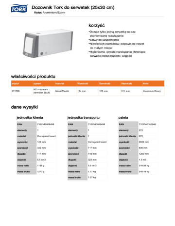 Dozownik Tork do serwetek (25x30 cm) Kolor: Aluminium/Szary korzyść •Dozuje tylko jedną serwetkę na raz: ekonomiczne rozwiązanie •Łatwy do uzupełnienia •Niewielkich rozmiarów: odpowiedni nawet do małych miejsc •Higieniczne i proste rozwiązanie chroniące serwetki przed brudem i wilgocią właściwości produktu artykuł system Materiał Wysokość Szerokość Głębokość Kolor 271700 N2 — system serwetek 25x30 Metal/Plastik 134 mm 105 mm 311 mm Aluminium/Szary dane wysyłki jednostka klienta jednostka transportu paleta EAN 7322540068498 EAN 7322540068498 EAN 7322540161946 elementy 1 elementy 1 elementy 272 materiał Corrugated board jednostki klienta 1 jednostki klienta 272 wysokość 146 mm materiał Corrugated board wysokość 2022 mm szerokość 322 mm wysokość 117 mm szerokość 800 mm długość 117 mm szerokość 146 mm długość 1200 mm objętość 5.5 dm3 długość 322 mm objętość 1.5 m3 masa netto 1165 g objętość 5.5 dm3 masa netto 316.88 kg masa brutto 1273 g masa netto 1.17 kg masa brutto 345.44 kg masa brutto 1.27 kg