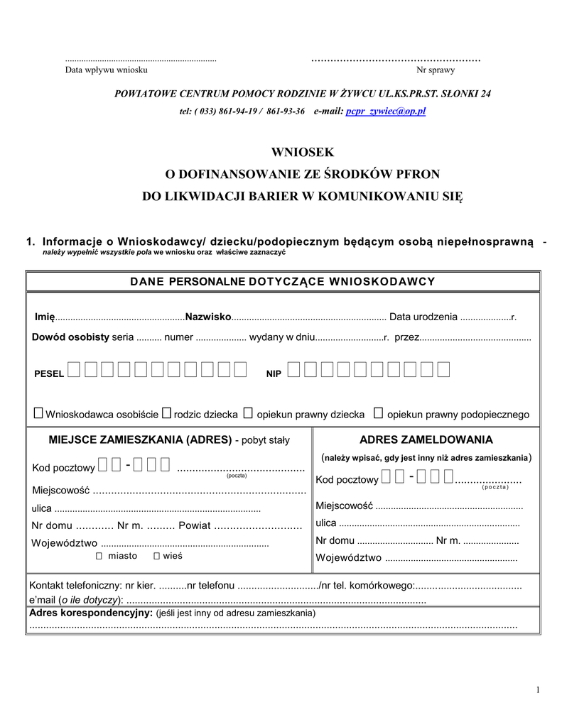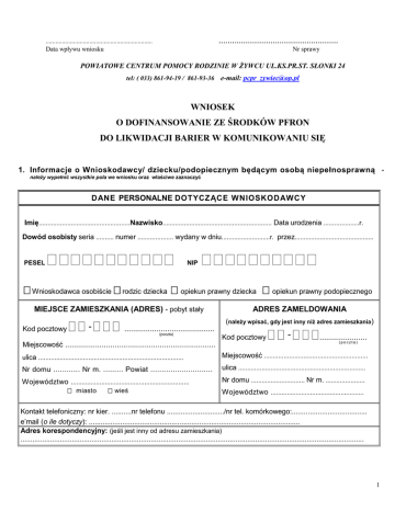 ..................................................... .................................................................. Data wpływu wniosku Nr sprawy POWIATOWE CENTRUM POMOCY RODZINIE W ŻYWCU UL.KS.PR.ST. SŁONKI 24 tel: ( 033) 861-94-19 / 861-93-36 e-mail: [email protected] WNIOSEK O DOFINANSOWANIE ZE ŚRODKÓW PFRON DO LIKWIDACJI BARIER W KOMUNIKOWANIU SIĘ 1. Informacje o Wnioskodawcy/ dziecku/podopiecznym będącym osobą niepełnosprawną należy wypełnić wszystkie pola we wniosku oraz właściwe zaznaczyć DANE PERSONALNE DOTYCZĄCE WNIOSKODAWCY Imię...................................................Nazwisko............................................................. Data urodzenia ....................r. Dowód osobisty seria .......... numer .................... wydany w dniu...........................r. przez............................................ PESEL NIP Wnioskodawca osobiście rodzic dziecka opiekun prawny dziecka opiekun prawny podopiecznego MIEJSCE ZAMIESZKANIA (ADRES) - pobyt stały Kod pocztowy - .......................................... (poczta) Miejscowość ...................................................................... ADRES ZAMELDOWANIA (należy wpisać, gdy jest inny niż adres zamieszkania) Kod pocztowy - ...................... (poczta) ulica ................................................................................. Miejscowość .......................................................... Nr domu ............ Nr m. ......... Powiat ............................ ulica ....................................................................... Województwo .................................................................. miasto wieś Nr domu .............................. Nr m. ...................... Województwo .................................................... Kontakt telefoniczny: nr kier. ..........nr telefonu ............................./nr tel. komórkowego:...................................... e’mail (o ile dotyczy): ........................................................................................................... Adres korespondencyjny: (jeśli jest inny od adresu zamieszkania) .............................................................................................................................................................................. 1 DANE PERSONALNE DOTYCZĄCE DZIECKA/PO DOPIECZNEGO MIEJSCE ZAMIESZKANIA (ADRES) (jeśli inny niż Wnioskodawcy – pobyt stały) DANE PERSONALNE Imię .................................................................... Kod pocztowy - ............................................ (poczta) Nazwisko ............................................................ Miejscowość ................................................................. Data urodzenia:................................................. r. Ulica ............................................................................ Nr domu ........................... Nr m. ................................. PESEL NIP Pełnoletni: tak Powiat ......................................................................... Województwo .............................................................. miasto wieś nie 2. STAN PRAWNY DOT. NIEPEŁNOSPRAWNOŚCI WNIOSKODAWCY /DZIECKA / PODOPIECZNEGO całkowita niezdolność do pracy i do samodzielnej egzystencji znaczny stopień I grupa inwalidzka całkowita niezdolność do pracy umiarkowany stopień II grupa inwalidzka częściowa niezdolność do pracy lekki stopień III grupa inwalidzka ORZECZENIE O NIEPEŁNOSPRAWNOŚCI (wydawane do 16 roku życia) Ww. dokument jest ważny: okresowo do ......................................................................................................... bezterminowo 3. RODZAJ NIEPEŁNOSPRAWNOŚCI WNIOSKODAWCY/DZIECKA/ PODOPIECZNEGO UTRUDNIAJĄCY KOMUNIKOWANIE SIĘ WYNIKAJĄCY Z ORZECZENIA O NIEPEŁNOSPRAWNOŚCI NARZĄD RUCHU, w zakresie: z koniecznością porusza się przy pomocy I NN A D YS F UN K CJ A N AR Z ĄD U RU CH U obu kończyn dolnych wózka inwalidzkiego jednej kończyny dolnej kul ........................................................................ NARZĄD WZROKU, w zakresie: osoba niewidoma osoba niedowidząca NARZĄD SŁUCHU , w zakresie: osoba niesłysząca osoba niedosłysząca INNA DYSFUNKCJA NARZĄDU SŁUCHU I MOWY.............................................................................................................. DEFICYT ROZWOJOWY ( jaki?) .......................................................................................................................................... CHOROBA PSYCHICZNA ( jaka?)......................................................................................................................................... INNE PRZYCZYNY niepełnosprawności utrudniające komunikowanie się .......................................................................... 2 4. WYKSZTAŁCENIE WNIOSKODAWCY/DZIECKA/ PODOPIECZNEGO podstawowe średnie ogólne wyższe gimnazjalne zawodowe średnie zawodowe policealne inne, jakie: jest w trakcie realizacji obowiązku szkolnego (podać nazwę nie realizuje obowiązku szkolnego szkoły).............................................................................................. 5. DODATKOWE KWALIFIKACJE WNIOSKODAWCY/DZIECKA/ PODOPIECZNEGO obsługa urządzeń biurowych inne, jakie:......................... prawo jazdy znajomość języków obcych obsługa komputera wykonywane zawody .................................................................................................................................................................. 6. SYTUACJA ZAWODOWA WNIOSKODAWCY/DZIECKA/PODOPIECZNEGO zatrudniony w ........................................ .................................................................... na czas określony do dnia.................... na czas nieokreślony emeryt 7. prowadzący działalność gospodarczą rencista bezrobotny zarejestrowany w P