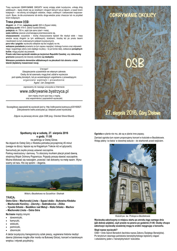 Trasy wycieczek ODKRYWANIE OKOLICY raczej omijają szlaki turystyczne, unikają dróg asfaltowych – lepiej chodzi się po ścieżkach i drogach leśnych lub po łąkach, a nawet torem kolejowym – nie stronią od rozległych widoków, miejsc urokliwych i ciekawostek krajoznawczych. Bywa, że dla urozmaicenia lub skrótu droga wiedzie przez chaszcze lub na przykład torem kolejowym. Trasa piesza OSB: długość: ok. 21 km, najwyższy punkt: 820 m (Sypací skála), najniższy punkt: 419 m. (dolna Vysoká Srbská), podejścia: ok. 750 m, zejść tyle samo (start = meta), szata roślinna: jeszcze urozmaicająca przemieszczanie się, chaszczowanie: oczywiście – trochę chaszczowania będzie! Ale niezbyt wiele – trasa wiedzie raczej drogami (w tym asfaltowymi), ścieżkami, troszkę też po prostu lasami i bezdrożami (w tym znakowanymi szlakami turystycznymi), pora roku i pogoda: wycieczka odbędzie się bez względu na nie, wskazane posiadanie prowiantu (w tym zapasu napojów) i dobrego humoru oraz odpowiedniego i wygodnego ubioru (coś ciepłego na plecy – to już koniec lata), zwłaszcza porządnych butów, mogą przydać się parasole. Prawie cała trasa wycieczki wiedzie po terytorium Republiki Czeskiej, więc dokumenty graniczne (paszporty lub dowody osobiste) są niezbędne. Wskazane posiadanie elementów odblaskowych na plecakach lub ubraniu a także latarek (będziemy maszerować nocą). Uwaga! Ubezpieczenie uczestników we własnym zakresie. Osoby do lat szesnastu mogą brać udział w wycieczce pod opieką dorosłych, lub po wcześniejszym uzgodnieniu z prowadzącymi. organizator wędrówki i prowadzenie: Agata i Jan Zasępowie zapraszamy do naszego uroczyska w Internecie: www.odkrywanie.bystrzyca.pl (tam między innymi opis trasy z mapką oraz wspomnienia z poprzednich wycieczek) Szczegółowa zapowiedź tej wycieczki jest tu: http://odkrywanie.bystrzyca.pl/20160827. Zdecydowanie warto przeczytać ją i obejrzeć przed wycieczką! Zdjęcie na pierwszej stronie: płyta OSB (ang. Oriented Strand Board). Spotkamy się w sobotę, 27. sierpnia 2016 o godz. 11:00 na parkingu w Ostrej Górze. Na dojazd do Ostrej Góry z Kłodzka potrzeba przynajmniej 45 minut (uwaga na dziury: lepsze są na Kręgielnym Trakcie niż w Łężycach). Ogniska w planie nie ma, ale są w planie inne popasy. Zamiast ogniska tym razem proponujemy koncert w kościele w Bezdiekowie. Wstęp płatny ‘co łaska’ w dowolnej walucie – do skarbonek przed wejściem. Samochody jak zwykle proszę ustawiać oszczędnie. Parking niestrzeżony i darmowy. To otoczony murkiem placyk przed dawną strażnicą Wojsk Ochrony Pogranicza. Pojazdy proszę stawiać oszczędnie. Można blokować się nawzajem, przecież i tak dotrzemy na metę razem. Wyruszamy od razu. Kto się spóźni – dogania. Widok z Bezdiekowa na Szczelińce i Skalniak TRASA: Ostra Góra – Machovská Lhota – Sypací skála – Bukowina Kłodzka – Machovské Končiny – Závrchy – Sedmákovice – Zlíčko – Vysoká Srbská – Bezděkov nad Metují – Nizká Srbská – Machov – Machovská Lhota – Ostra Góra Na trasie między innymi: dzwonniczki, kamyczki, widoczki, pomniczki, zbiorniczki. • • • • • A także turystyczny transgraniczny szlak pieszy, wypierana historia niezbyt dawna (zbiorowa mogiła ofiar mordu na Bukowej Górze), koncert w barokowym wnętrzu i młynek przydrożny. Kościół pw. św. Prokopa w Bezdiekowie Wycieczkę zakończymy w miejscu startu po zmroku tego samego dnia (jak dobrze pójdzie), czyli prawie na pewno po godzinie 21:00. Osoby chcące zakończyć wycieczkę wcześniej mogą to zrobić rezygnując z koncertu. Skąd nazwa wycieczki? OSB = Ordo Sancti Benedicti (łacińska nazwa Zakonu Świętego Benedykta). Po terytorium dawnego państewka benedyktyńskiego będziemy stąpać i odwiedzimy jeden z ‘benedyktyńskich’ kościołów. Spotkamy się w sobotę, 27. sierpnia 2016 o godz. 11:00 na parkingu w Ostrej Górze. Na dojazd do Ostrej Góry z Kłodzka potrzeba przynajmniej 45 minut (uwaga na dziury: lepsze są na Kręgielnym Trakcie niż w Łężycach). Ogniska w planie nie ma, ale są w planie inne popasy. Zamiast ogniska tym razem proponujemy koncert w kościele w Bezdiekowie. Wstęp płatny ‘co łaska’ w dowolnej walucie – do skarbonek przed wejściem. Samochody jak zwykle proszę ustawiać oszczędnie. Parking niestrzeżony i darmowy. To otoczony murkiem placyk przed dawną strażnicą Wojsk Ochrony Pogranicza. Pojazdy proszę stawiać oszczędnie. Można blokować się nawzajem, przecież i tak dotrzemy na metę razem. Wyruszamy od razu. Kto się spóźni – dogania. Widok z Bezdiekowa na Szczelińce i Skalniak TRASA: Ostra Góra – Machovská Lhota – Sypací skála – Bukowina Kłodzka – Machovské Končiny – Závrchy – Sedmákovice – Zlíčko – Vysoká Srbská – Bezděkov nad Metují – Nizká Srbská – Machov – Machovská Lhota – Ostra Góra Na trasie między innymi: dzwonniczki, kamyczki, widoczki, pomniczki, zbiorniczki. • • • • • A także turystyczny transgraniczny szlak pieszy, wypierana historia niezbyt dawna (zbiorowa mogiła ofiar mordu na Bukowej Górze), koncert w barokowym wnętrzu i młynek przydrożny. Trasy wycieczek ODKRYWANIE OKOLICY raczej omijają szlaki turystyczne, unikają dróg asfaltowych – lepiej chodzi się po ścieżkach i drogach leśnych lub po łąkach, a nawet torem kolejowym – nie stronią od rozległych widoków, miejsc urokliwych i ciekawostek krajoznawczych. Bywa, że dla urozmaicenia lub skrótu droga wiedzie przez chaszcze lub na przykład torem kolejowym. Trasa piesza OSB: długość: ok. 21 km, najwyższy punkt: 820 m (Sypací skála), najniższy punkt: 419 m. (dolna Vysoká Srbská), podejścia: ok. 750 m, zejść tyle samo (start = meta), szata roślinna: jeszcze urozmaicająca przemieszczanie się, chaszczowanie: oczywiście – trochę chaszczowania będzie! Ale niezbyt wiele – trasa wiedzie racze