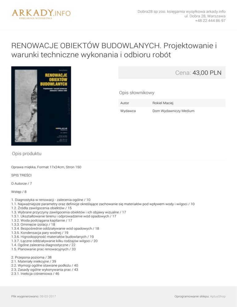 Dobra28 sp zoo. księgarnia wysyłkowa arkady.info ul. Dobra 28, Warszawa +48 22 444 86 97 RENOWACJE OBIEKTÓW BUDOWLANYCH. Projektowanie i warunki techniczne wykonania i odbioru robót Cena: 43,00 PLN Opis słownikowy Autor Rokiel Maciej Wydawca Dom Wydawniczy Medium Opis produktu Oprawa miękka, Format 17x24cm, Stron 150 SPIS TREŚCI O Autorze / 7 Wstęp / 8 1. Diagnostyka w renowacji - zalecenia ogólne / 10 1.1. Najważniejsze parametry oraz definicje określające zachowanie się materiałów pod wpływem wody i wilgoci / 10 1.2. Źródła zawilgocenia obiektów / 15 1.3. Wybrane przyczyny zawilgocenia obiektów i ich objawy wizualne / 17 1.3.1. Ukształtowanie terenu i odprowadzenie wód opadowych / 17 1.3.2. Woda podciągana kapilarnie / 17 1.3.3. Ominięcie izolacji / 18 1.3.4. Bezpośrednie oddziaływanie wód opadowych / 18 1.3.5. Kondensacja pary wodnej / 19 1.3.6. Higroskopijność materiałów budowlanych / 19 1.3.7. Łączne oddziaływanie kilku rodzajów wilgoci / 20 1.4. Ogólne zalecenia diagnostyczne / 22 1.5. Planowanie prac renowacyjnych / 33 2. Przepona pozioma / 38 2.1. Materiały iniekcyjne / 39 2.2. Wymogi ogólne stawiane podłożu / 40 2.3. Zasady ogólne wykonywania prac / 43 2.3.1. Iniekcja ciśnieniowa / 46 Plik wygenerowano: 08-03-2017 Oprogramowanie sklepu: AptusShop Dobra28 sp zoo. księgarnia wysyłkowa arkady.info ul. Dobra 28, Warszawa +48 22 444 86 97 2.3.1.1. Przygotowanie podłoża / 46 2.3.1.2. Kontrola stanu podłoża przed rozpoczęciem prac / 46 2.3.1.3. Przygotowanie materiału / 47 2.3.1.4. Wykonywanie iniekcji / 47 2.3.2. Iniekcja grawitacyjna (bezciśnieniowa) / 51 2.3.2.1. Przygotowanie podłoża / 51 2.3.2.2. Kontrola stanu podłoża przed rozpoczęciem prac / 51 2.3.2.3. Przygotowanie materiału / 51 2.3.2.4. Wykonywanie iniekcji / 51 2.3.3. Iniekcja wstępna wypełniająca pustki / 53 2.3.4. Kontrola podczas wykonywania iniekcji / 53 2.3.5. Kontrola po wykonaniu robót / 55 3. Izolacja pionowa oraz izolacja posadzki / 56 3.1. Materiały do wykonywania izolacji powłokowych / 58 3.1.1. Bezspoinowe materiały bitumiczne / 58 3.1.1.1. Masy asfaltowe / 58 3.1.1.2. Polimerowo-bitumiczne, grubowarstwowe masy uszczelniające (masy KMB) / 61 3.1.2. Bezspoinowe materiały cementowe / 63 3.1.2.1. Elastyczne szlamy (mikrozaprawy) uszczelniające / 63 3.1.2.2. Sztywne szlamy (mikrozaprawy) uszczelniające / 65 3.1.3. Rolowe materiały bitumiczne / 65 3.1.4. Rolowe materiały z tworzyw sztucznych / 68 3.1.5. Zasady doboru materiałów do wykonywania powłok wodochronnych / 68 3.1.6. Wymagania ogólne stawiane uszczelnianemu podłożu / 70 3.2. Izolacja z mas asfaltowych i mas KMB / 75 3.2.1. Wymagania stawiane podłożu / 75 3.2.2. Przygotowanie podłoża / 76 3.2.3. Kontrola stanu podłoża przed rozpoczęciem prac / 77 3.2.4. Przygotowanie materiału / 79 3.2.5. Aplikacja materiału / 79 3.2.6. Kontrola podczas wykonywania powłoki wodochronnej / 80 3.2.7. Kontrola po wykonaniu robót / 83 3.2.8. Ułożenie warstw ochronnych / 83 3.3. Izolacja z mikrozapraw (szlamów) uszczelniających / 84 3.3.1. Wymagania stawiane podłożu / 84 3.3.2. Przygotowanie podłoża / 85 3.3.3. Kontrola stanu podłoża przed rozpoczęciem prac / 85 3.3.4. Przygotowanie materiału / 86 3.3.5. Aplikacja materiału / 87 3.3.6. Kontrola podczas wykonywania powłoki wodochronnej / 88 3.3.7. Kontrola po wykonaniu robót / 91 3.3.8. Ułożenie warstw ochronnych / 91 3.4. Izolacja z rolowych materiałów bitumicznych / 91 3.4.1. Wymagania stawiane podłożu / 91 3.4.2. Przygotowanie podłoża / 92 3.4.3. Kontrola stanu podłoża przed rozpoczęciem prac / 93 3.4.4. Przygotowanie materiału / 94 3.4.5. Aplikacja materiału / 94 3.4.5.1. Papy termozgrzewalne / 94 3.4.5.2. Membrany samoprzylepne / 95 3.4.5.3. Papy klejone masą asfaltową / 95 3.4.6. Kontrola podczas wykonywania powłoki wodochronnej / 96 3.4.7. Kontrola po wykonaniu robót / 96 3.4.8. Ułożenie warstw ochronnych / 96 3.5. Izolacja z materiałów rolowych z tworzyw sztucznych / 97 3.5.1. Wymagania stawiane podłożu / 97 3.5.2. Przygotowanie podłoża / 98 3.5.3. Kontrola stanu podłoża przed rozpoczęciem prac / 99 Plik wygenerowano: 08-03-2017 Oprogramowanie sklepu: AptusShop Dobra28 sp zoo. księgarnia wysyłkowa arkady.info ul. Dobra 28, Warszawa +48 22 444 86 97 3.5.4. Przygotowanie materiału / 99 3.5.5. Aplikacja materiału / 100 3.5.6. Kontrola podczas wykonywania powłoki wodochronnej / 100 3.5.7. Kontrola po wykonaniu robót / 100 3.5.8. Ułożenie warstw ochronnych / 100 3.6. Warstwy rozdzielające i ochronne / 100 3.7. Materiały do wykonywania iniekcji / 102 3.7.1. Materiały do iniekcji strukturalnych / 102 3.7.2. Materiały do iniekcji kurtynowych / 102 3.8. Iniekcja strukturalna / 103 3.8.1. Przygotowanie podłoża / 104 3.8.2. Kontrola stanu podłoża przed rozpoczęciem prac / 104 3.8.3. Wykonywanie iniekcji / 105 3.8.4. Kontrola podczas wykonywania iniekcji / 106 3.8.5. Kontrola po wykonaniu robót / 106 3.9. Iniekcja kurtynowa / 106 3.9.1. Przygotowanie podłoża / 107 3.9.2. Kontrola stanu podłoża przed rozpoczęciem prac / 107 3.9.3. Wykonywanie iniekcji / 107 3.9.4. Kontrola podczas wykonywania iniekcji / 109 3.9.5. Kontrola po wykonaniu robót / 109 4. System tynków renowacyjnych / 112 4.1. Składniki systemu tynków renowacyjnych / 113 4.2. Wymagania ogólne stawiane podłożu pod pierwszą warstwę systemu / 119 4.3. Wykonanie systemu tynków dla wysokiego stopnia zasolenia / 119 4.3.1. Wymagania stawiane podłożu / 119 4.3.2. Przygotowanie podłoża / 120 4.3.3. Kontrola stanu podłoża przed rozpoczęciem prac / 122 4.3.4. Przygotowanie materiału / 122 4.3.4.1. Obrzutka / 122 4.3.4.2. Tynk podkładowy i renowacyjny / 123 4.3.4.3. Szpachla wygładzająca / 123 4.3.5. Aplikacja systemu / 124 4.3.5.1. Tynk podkładowy / 124 4.3.5.2. Kontrola podczas nakładania tynku podkładowego / 124 4.3.5.3. Pielęgnacja tynku podkładowego / 125 4.3.5.4. Kontrola przed nakładaniem tynku renowac