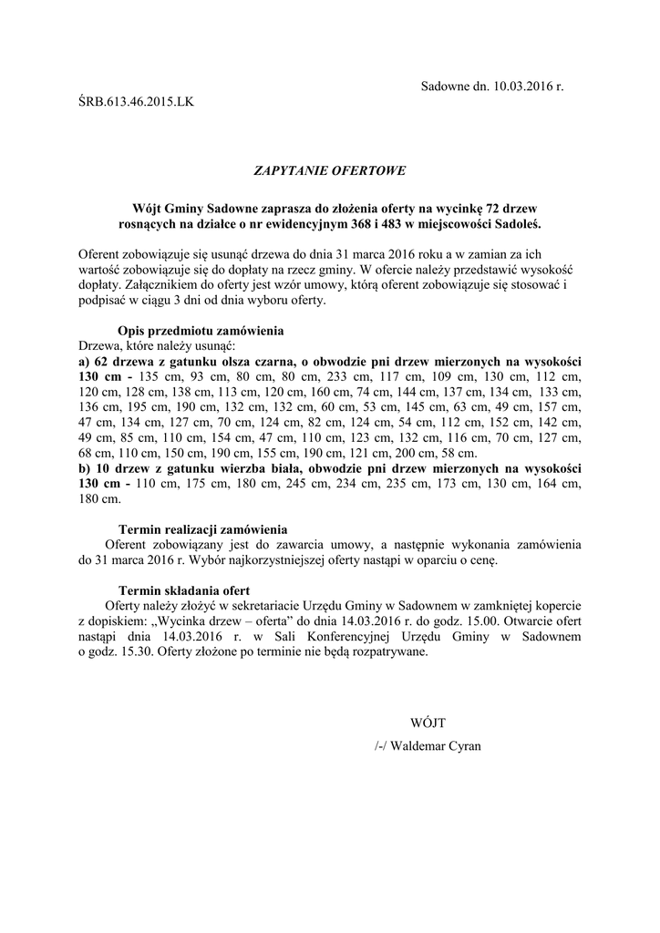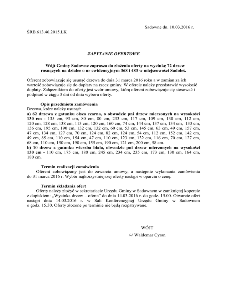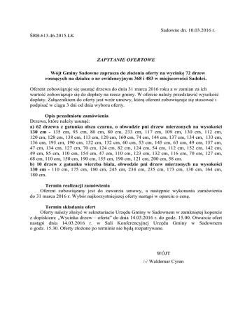 Sadowne dn. 10.03.2016 r. ŚRB.613.46.2015.LK ZAPYTANIE OFERTOWE Wójt Gminy Sadowne zaprasza do złożenia oferty na wycinkę 72 drzew rosnących na działce o nr ewidencyjnym 368 i 483 w miejscowości Sadoleś. Oferent zobowiązuje się usunąć drzewa do dnia 31 marca 2016 roku a w zamian za ich wartość zobowiązuje się do dopłaty na rzecz gminy. W ofercie należy przedstawić wysokość dopłaty. Załącznikiem do oferty jest wzór umowy, którą oferent zobowiązuje się stosować i podpisać w ciągu 3 dni od dnia wyboru oferty. Opis przedmiotu zamówienia Drzewa, które należy usunąć: a) 62 drzewa z gatunku olsza czarna, o obwodzie pni drzew mierzonych na wysokości 130 cm - 135 cm, 93 cm, 80 cm, 80 cm, 233 cm, 117 cm, 109 cm, 130 cm, 112 cm, 120 cm, 128 cm, 138 cm, 113 cm, 120 cm, 160 cm, 74 cm, 144 cm, 137 cm, 134 cm, 133 cm, 136 cm, 195 cm, 190 cm, 132 cm, 132 cm, 60 cm, 53 cm, 145 cm, 63 cm, 49 cm, 157 cm, 47 cm, 134 cm, 127 cm, 70 cm, 124 cm, 82 cm, 124 cm, 54 cm, 112 cm, 152 cm, 142 cm, 49 cm, 85 cm, 110 cm, 154 cm, 47 cm, 110 cm, 123 cm, 132 cm, 116 cm, 70 cm, 127 cm, 68 cm, 110 cm, 150 cm, 190 cm, 155 cm, 190 cm, 121 cm, 200 cm, 58 cm. b) 10 drzew z gatunku wierzba biała, obwodzie pni drzew mierzonych na wysokości 130 cm - 110 cm, 175 cm, 180 cm, 245 cm, 234 cm, 235 cm, 173 cm, 130 cm, 164 cm, 180 cm. Termin realizacji zamówienia Oferent zobowiązany jest do zawarcia umowy, a następnie wykonania zamówienia do 31 marca 2016 r. Wybór najkorzystniejszej oferty nastąpi w oparciu o cenę. Termin składania ofert Oferty należy złożyć w sekretariacie Urzędu Gminy w Sadownem w zamkniętej kopercie z dopiskiem: „Wycinka drzew – oferta” do dnia 14.03.2016 r. do godz. 15.00. Otwarcie ofert nastąpi dnia 14.03.2016 r. w Sali Konferencyjnej Urzędu Gminy w Sadownem o godz. 15.30. Oferty złożone po terminie nie będą rozpatrywane. WÓJT /-/ Waldemar Cyran UMOWA – ZLECENIE Zawarta w dniu ………………….. 2016 roku w Sadownem pomiędzy 1. Panem Waldemarem Cyranem – Wójtem Gminy Sadowne zwanym w dalszej części umowy Zleceniodawcą a 2. ………………………………………………………………………..…. zam. ……………………………………………………………… zwanym w dalszej części umowy Zleceniobiorcą. §1 Zleceniodawca zleca a Zleceniobiorca przyjmuje do wykonania wycinkę drzew na drodze gminnej usytuowanej w miejscowości Sadoleś na działkach nr 368 i 483 zgodnie z decyzją nr ………………….. . §2 Termin wykonania określa się na dzień 31 marca 2016 roku. §3 Zleceniobiorca zobowiązuje się do: 1. Rzetelnego i terminowego wykonania wycinki 2. Wywozu pozostałości i uporządkowania terenu 3. Ponoszenia odpowiedzialności wobec osób trzecich za wyrządzone szkody powstałe w trakcie prac wycinkowych §4 1. Drewno pozyskane z wycinki stanowić będzie własność zleceniobiorcy. 2. Ze względu na wartość pozyskanego drewna Zleceniobiorca zobowiązany jest do zapłaty na rzecz Zleceniodawcy kwoty ………………… zł, słownie: ………………….. złotych 3. Kwotę należy uiścić w kasie Urzędu Gminy w terminie 30 dni od podpisania umowy. §5 Odbiór wykonanego zlecenia nastąpi w terminie siedmiu dni od daty zgłoszenia zakończenia robót. §6 1. Wszelkie zmiany niniejszej umowy wymagają formy pisemnej pod rygorem nieważności. 2. Zamawiający nie dopuszcza zmiany umowy z zakresie zmiany terminu określonego w § 2 oraz wynagrodzenia określonego w § 4. §7 Wszelkie sprawy mogące wyniknąć w związku z realizacją niniejszej umowy strony poddają rozstrzygnięciu sądu właściwego miejscowo dla siedziby Zamawiającego. §8 1. Umowę sporządzono w dwóch jednobrzmiących egzemplarzach dla każdej ze stron. 2. Integralną częścią niniejszej umowy stanowiącą jej załącznik jest Decyzja …………… Zleceniobiorca Zleceniodawca