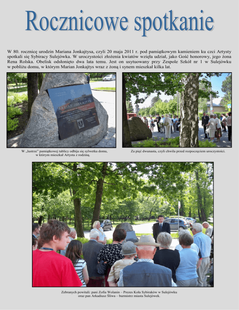 W 80. rocznicę urodzin Mariana Jonkajtysa, czyli 20 maja 2011 r. pod pamiątkowym kamieniem ku czci Artysty spotkali się Sybiracy Sulejówka. W uroczystości złoŜenia kwiatów wzięła udział, jako Gość honorowy, jego Ŝona Rena Rolska. Obelisk odsłonięto dwa lata temu. Jest on usytuowany przy Zespole Szkół nr 1 w Sulejówku w pobliŜu domu, w którym Marian Jonkajtys wraz z Ŝoną i synem mieszkał kilka lat. W „lustrze” pamiątkowej tablicy odbija się sylwetka domu, w którym mieszkał Artysta z rodziną. Za pięć dwunasta, czyli chwila przed rozpoczęciem uroczystości. Zebranych powitali: pani Zofia Wolanin – Prezes Koła Sybiraków w Sulejówku oraz pan Arkadiusz Śliwa – burmistrz miasta Sulejówek. Chwila składania kwiatów. W uroczystości wzięła udział pani Rena Rolska ( opiera dłoń o pamiątkowy kamień) oaz przedstawiciele uczniów i nauczycieli Zespołu Szkół nr 1 w Sulejówku z dyrektorem – panią Hanną Semeniuk. W tle okazały budynek Zespołu Szkół nr 1 oraz ulica Mariana Jonkajtysa. W związku z uroczystością przypominamy kilka utworów Mariana Jonkajtysa oraz zapraszamy do odwiedzenia netgalerii (sulejowek.netgaleria.eu), w której znajdziecie Państwo więcej prac Artysty literackich i plastycznych. Chyba nie musimy nikomu przypominać, Ŝe Marian Jonkajtys był Sybirakiem, autorem hymnu „Marsz Sybiraków”. Ten Ktoś W kwestii picia Gdy ktoś Nim chleb na kromki Porozdziela noŜem Palcami na bochenku Znak krzyŜa połoŜy... A czy w Rosji duŜo piją? To pytanie retoryczne. W Rosji nie piją jedynie Słupy te, telegraficzne. Gdy ktoś Kawałek chleba, Na drodze lub w lesie Znaleziony, OstroŜnie Z pietyzmem podniesie, WyraŜając Dla wielu Przesadny szacunek I złoŜy na nim Bogu dziękczynny pocałunek... Ten ktoś, MoŜesz mi wierzyć W pełnym zaufaniu, Kilka lat na Syberii spędził. Na zesłaniu... Nie piją tylko dlatego śe, tak mówiąc między nami Ich szklanki – izolatory Wiszą do góry nogami. Wrzątek Komunizm Zwykł odpowiadać W sposób Ścisły i godny - Czy nie ma u was Wrzątku?... - Zawsze jest. Tylko chłodny. Czastuszka I Mówił zając do zająca: Znajdź drugi kraj taki, W którym zimą miałbyś w polu Po śniegiem buraki?... Nie będzie tak źle Parę latek To wytrzymasz… Wikt ci damy I robotę. śyć będziesz Lecz baraszkować Z barysznią Stracisz ochotę… Heroizm Sybiraków Bo od września, od siedemnastego, DłuŜszą drogą znów szedł kaŜdy z nas: Przez lód spod bieguna północnego, Przez Łubiankę, przez Katyński Las! Na nieludzkiej ziemi znowu polski trakt Wyznaczyły bezimienne krzyŜe… Nie zatrzymał nas czerwony kat, Bo przed nami Polska – coraz bliŜej! Oprac. Marita Cieślińska kl. 2a LO w Sulejówku. Fot. Beata Chmielewska.