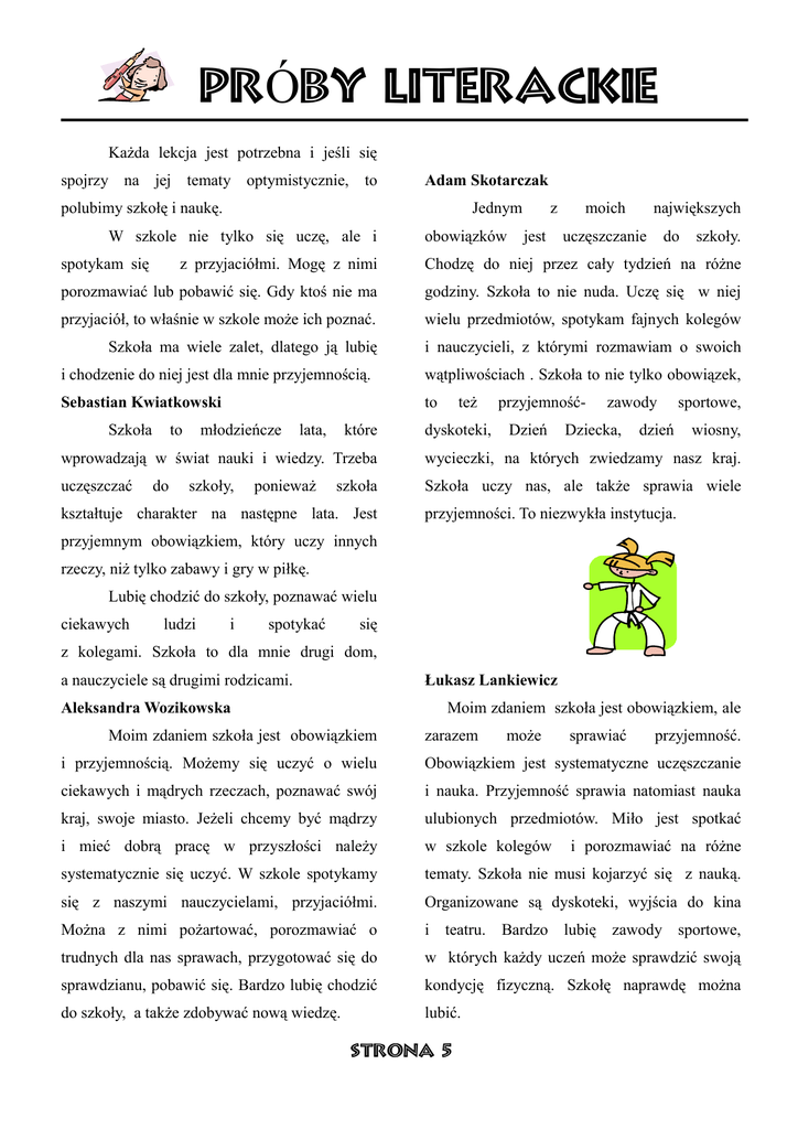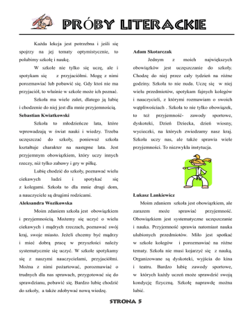 PRÓBY LITERACKIE Każda lekcja jest potrzebna i jeśli się spojrzy na jej tematy optymistycznie, to Adam Skotarczak polubimy szkołę i naukę. Jednym W szkole nie tylko się uczę, ale i spotykam się obowiązków z jest moich największych uczęszczanie do szkoły. z przyjaciółmi. Mogę z nimi Chodzę do niej przez cały tydzień na różne porozmawiać lub pobawić się. Gdy ktoś nie ma godziny. Szkoła to nie nuda. Uczę się w niej przyjaciół, to właśnie w szkole może ich poznać. wielu przedmiotów, spotykam fajnych kolegów Szkoła ma wiele zalet, dlatego ją lubię i nauczycieli, z którymi rozmawiam o swoich i chodzenie do niej jest dla mnie przyjemnością. wątpliwościach . Szkoła to nie tylko obowiązek, Sebastian Kwiatkowski to Szkoła to młodzieńcze lata, które też dyskoteki, przyjemnośćDzień zawody Dziecka, dzień sportowe, wiosny, wprowadzają w świat nauki i wiedzy. Trzeba wycieczki, na których zwiedzamy nasz kraj. uczęszczać Szkoła uczy nas, ale także sprawia wiele do szkoły, ponieważ szkoła kształtuje charakter na następne lata. Jest przyjemności. To niezwykła instytucja. przyjemnym obowiązkiem, który uczy innych rzeczy, niż tylko zabawy i gry w piłkę. Lubię chodzić do szkoły, poznawać wielu ciekawych ludzi i spotykać się z kolegami. Szkoła to dla mnie drugi dom, a nauczyciele są drugimi rodzicami. Łukasz Lankiewicz Aleksandra Wozikowska Moim zdaniem szkoła jest obowiązkiem, ale Moim zdaniem szkoła jest obowiązkiem zarazem może sprawiać przyjemność. i przyjemnością. Możemy się uczyć o wielu Obowiązkiem jest systematyczne uczęszczanie ciekawych i mądrych rzeczach, poznawać swój i nauka. Przyjemność sprawia natomiast nauka kraj, swoje miasto. Jeżeli chcemy być mądrzy ulubionych przedmiotów. Miło jest spotkać i mieć dobrą pracę w przyszłości należy w szkole kolegów systematycznie się uczyć. W szkole spotykamy tematy. Szkoła nie musi kojarzyć się z nauką. się z naszymi nauczycielami, przyjaciółmi. Organizowane są dyskoteki, wyjścia do kina Można z nimi pożartować, porozmawiać o i teatru. Bardzo lubię zawody sportowe, trudnych dla nas sprawach, przygotować się do w których każdy uczeń może sprawdzić swoją sprawdzianu, pobawić się. Bardzo lubię chodzić kondycję fizyczną. Szkołę naprawdę można do szkoły, a także zdobywać nową wiedzę. lubić. STRONA 5 i porozmawiać na różne