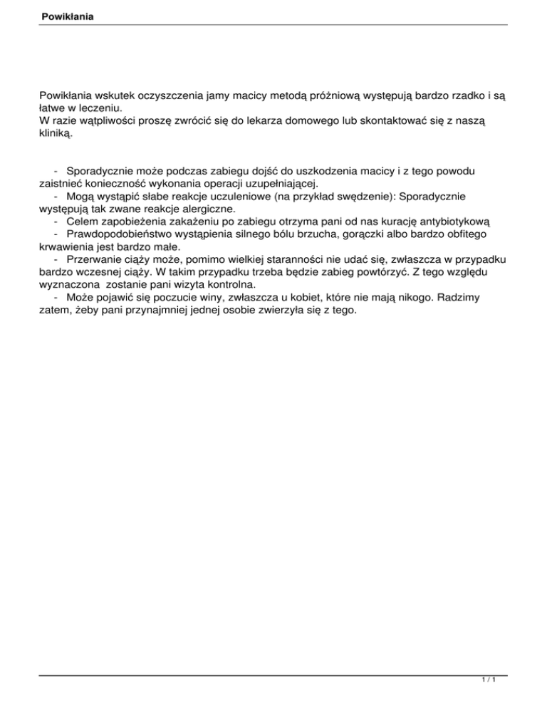 Powikłania Powikłania wskutek oczyszczenia jamy macicy metodą próżniową występują bardzo rzadko i są łatwe w leczeniu. W razie wątpliwości proszę zwrócić się do lekarza domowego lub skontaktować się z naszą kliniką. - Sporadycznie może podczas zabiegu dojść do uszkodzenia macicy i z tego powodu zaistnieć konieczność wykonania operacji uzupełniającej. - Mogą wystąpić słabe reakcje uczuleniowe (na przykład swędzenie): Sporadycznie występują tak zwane reakcje alergiczne. - Celem zapobieżenia zakażeniu po zabiegu otrzyma pani od nas kurację antybiotykową - Prawdopodobieństwo wystąpienia silnego bólu brzucha, gorączki albo bardzo obfitego krwawienia jest bardzo małe. - Przerwanie ciąży może, pomimo wielkiej staranności nie udać się, zwłaszcza w przypadku bardzo wczesnej ciąży. W takim przypadku trzeba będzie zabieg powtórzyć. Z tego względu wyznaczona zostanie pani wizyta kontrolna. - Może pojawić się poczucie winy, zwłaszcza u kobiet, które nie mają nikogo. Radzimy zatem, żeby pani przynajmniej jednej osobie zwierzyła się z tego. 1/1