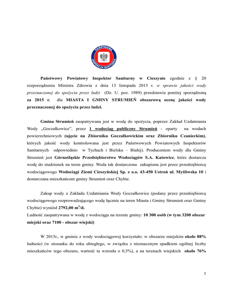 Państwowy Powiatowy Inspektor Sanitarny w Cieszynie zgodnie z § 20 rozporządzenia Ministra Zdrowia z dnia 13 listopada 2015 r. w sprawie jakości wody przeznaczonej do spożycia przez ludzi (Dz. U. poz. 1989) przedstawia poniżej sporządzoną za 2015 r. dla MIASTA I GMINY STRUMIEŃ obszarową ocenę jakości wody przeznaczonej do spożycia przez ludzi. Gmina Strumień zaopatrywana jest w wodę do spożycia, poprzez Zakład Uzdatniania Wody „Goczałkowice”, przez 1 wodociąg publiczny Strumień - oparty na wodach powierzchniowych (ujęcie na Zbiorniku Goczałkowickim oraz Zbiorniku Czanieckim), których jakość wody kontrolowana jest przez Państwowych Powiatowych Inspektorów Sanitarnych odpowiednio w Tychach i Bielsku – Białej). Producentem wody dla Gminy Strumień jest Górnośląskie Przedsiębiorstwo Wodociągów S.A. Katowice, które dostarcza wodę do studzienek na teren gminy. Woda tak dostarczona zakupiona jest przez przedsiębiorcę wodociągowego Wodociągi Ziemi Cieszyńskiej Sp. z o.o. 43-450 Ustroń ul. Myśliwska 10 i dostarczana mieszkańcom gminy Strumień oraz Chybie. Zakup wody z Zakładu Uzdatniania Wody Goczałkowice (podany przez przedsiębiorcę wodociągowego rozprowadzającego wodę łącznie na teren Miasta i Gminy Strumień oraz Gminy Chybie) wyniósł 2792,00 m3/d. Ludność zaopatrywana w wodę z wodociągu na terenie gminy: 10 300 osób (w tym 3200 obszar miejski oraz 7100 - obszar wiejski) W 2015r., w gminie z wody wodociągowej korzystało: w obszarze miejskim około 88% ludności (w stosunku do roku ubiegłego, w związku z nieznacznym spadkiem ogólnej liczby mieszkańców tego obszaru, wartość ta wzrosła o 0,5%), a na terenach wiejskich około 76% 1 ludności (w stosunku do roku ubiegłego, w związku z niewielkim wzrostem ogólnej liczby mieszkańców tego obszaru, wartość ta zmalała o 1%). Badania jakości wody prowadzone były regularnie przez cały 2015 rok przez cały rok zarówno przez Państwową Inspekcję Sanitarną jak i przedsiębiorcę wodociągowego w 7 punktach monitoringowych zlokalizowanych u odbiorców wody, z których 3 zlokalizowane były w mieście, natomiast 4 na obszarze wiejskim. Realizując monitoring kontrolny i przeglądowy pobrano łącznie 42 próbki wody (27 na obszarze miejskim oraz 15 na obszarze miejskim): w tym 40 do badań mikrobiologicznych (13 w ramach urzędowej kontroli PPIS i 27 w ramach kontroli wewnętrznej przedsiębiorcy wodociągowego) i 42 do badań fizykochemicznych (13 w ramach urzędowej kontroli PPIS i 29 w ramach kontroli wewnętrznej przedsiębiorcy wodociągowego). Z 40 pobranych próbek wody do badań mikrobiologicznych kwestionowano dwie próbki pobrane w ramach urzędowej kontroli PPIS (jedną z obszaru miejskiego i jedną z wiejskiego). Jedno z badań wykazało obecność pojedynczych bakterii grupy coli. Przedsiębiorca wodociągowy natychmiast podjął działania naprawcze polegające na płukaniu sieci w rejonie punktu, z którego pobrano próbkę. Obowiązujące rozporządzenie określające wymagania dla wody do spożycia, dopuszcza pojedyncze bakterie grupy coli, wykrywane sporadycznie (do 5% próbek w ciągu roku). Biorąc pod uwagę, że w wodzie wodociągu Strumień nie stwierdzono do września 2015r. obecności tych bakterii oraz po zapoznaniu się z przedstawionymi przez przedsiębiorcę wodociągowego niekwestionowanymi wynikami badań próbek wody pobranych z wodociągu Strumień, po przeprowadzonej urzędowej kontroli, oceniono ryzyko zdrowotne dla konsumentów wody jako niskie oraz wstrzymano wszczęcie postępowania administracyjnego do czasu uzyskania wyników badania powtórnego. W badaniach powtórnych przeprowadzonych przez PPIS oraz przedsiębiorcę wodociągowego nie stwierdzono w wodzie obecności bakterii grupy coli. 2 Drugie z stwierdzonych "przekroczeń mikrobiologicznych" dotyczyło obecności bakterii Clostridium perfringens (w pobranej w ramach urzędowej kontroli próbce wody stwierdzono pojedyncze bakterie). Podjęte przez przedsiębiorcę wodociągowego działania naprawcze były skuteczne, co potwierdził niekwestionowany wynik badania powtórnego. W związku ze stwierdzonymi pojedynczymi bakteriami, mając na uwadze, że bakterie Clostridium perfringens ujęte są w grupie dodatkowych wymagań mikrobiologicznych, jakim powinna odpowiadać woda do spożycia przez ludzi oraz dysponując przedstawionym przez przedsiębiorcę wodociągowego niekwestionowanym wynikiem badania powtórnego, PPIS nie wszczął postępowania administracyjnego w powyższej sprawie. Z 42 pobranych próbek wody do badań fizykochemicznych kwestionowano łącznie 5 - wszystkie z uwagi na niskie stężenie magnezu (3 na obszarze miejskim i 2 na obszarze wiejskim). Niskie wartości magnezu w wodzie wodociągowej na terenie Miasta i Gminy Strumień stwierdzane były już w latach ubiegłych. W związku z powyższym w dalszym ciągu celowym jest stosowanie przez mieszkańców żywności bogatej lub wzbogaconej w przyswajalny magnez. W związku ze stwierdzonymi niskimi stężeniami magnezu, przedsiębiorca wodociągowy nie podejmował działań naprawczych, gdyż obowiązujący akt prawny nie nakłada na niego obowiązku uzupełniania wartości tego parametru do wymagalnej wartości minimalnej. Na podstawie przeprowadzonych badań twardości ogólnej wody można stwierdzić, iż uległa ona nieznacznej zmianie w stosunku do roku poprzedniego, kiedy stwierdzano tylko wodę bardzo miękką. Badania twardości wody przeprowadzone w 2015r. wykazały jej wartości od bardzo miękkiej do miękkiej Wodociąg Twardość wody woda bardzo miękka/ miękka Strumień 3 Po przeanalizowaniu wszystkich wyników badań wody przeznaczonej do spożycia, wykonanych w okresie od 1 stycznia 2015 r. do 31 grudnia 2015 r. PPIS w Cieszynie stwierdził przydatność wody do spożycia dostarczanej przez nadzorowany wodociąg mieszkańcom Miasta i Gminy Strumień. Wodociąg Strumień Jakość wody Sposób uzd