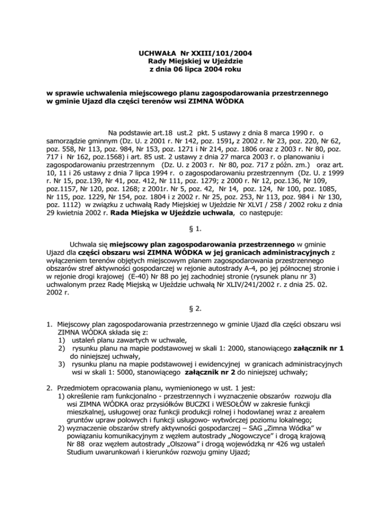 UCHWAŁA Nr XXIII/101/2004 Rady Miejskiej w Ujeździe z dnia 06 lipca 2004 roku w sprawie uchwalenia miejscowego planu zagospodarowania przestrzennego w gminie Ujazd dla części terenów wsi ZIMNA WÓDKA Na podstawie art.18 ust.2 pkt. 5 ustawy z dnia 8 marca 1990 r. o samorządzie gminnym (Dz. U. z 2001 r. Nr 142, poz. 1591, z 2002 r. Nr 23, poz. 220, Nr 62, poz. 558, Nr 113, poz. 984, Nr 153, poz. 1271 i Nr 214, poz. 1806 oraz z 2003 r. Nr 80, poz. 717 i Nr 162, poz.1568) i art. 85 ust. 2 ustawy z dnia 27 marca 2003 r. o planowaniu i zagospodarowaniu przestrzennym (Dz. U. z 2003 r. Nr 80, poz. 717 z późn. zm.) oraz art. 10, 11 i 26 ustawy z dnia 7 lipca 1994 r. o zagospodarowaniu przestrzennym (Dz. U. z 1999 r. Nr 15, poz.139, Nr 41, poz. 412, Nr 111, poz. 1279; z 2000 r. Nr 12, poz.136, Nr 109, poz.1157, Nr 120, poz. 1268; z 2001r. Nr 5, poz. 42, Nr 14, poz. 124, Nr 100, poz. 1085, Nr 115, poz. 1229, Nr 154, poz. 1804 i z 2002 r. Nr 25, poz. 253, Nr 113, poz. 984 i Nr 130, poz. 1112) w związku z uchwałą Rady Miejskiej w Ujeździe Nr XLVI / 258 / 2002 roku z dnia 29 kwietnia 2002 r. Rada Miejska w Ujeździe uchwala, co następuje: § 1. Uchwala się miejscowy plan zagospodarowania przestrzennego w gminie Ujazd dla części obszaru wsi ZIMNA WÓDKA w jej granicach administracyjnych z wyłączeniem terenów objętych miejscowym planem zagospodarowania przestrzennego obszarów stref aktywności gospodarczej w rejonie autostrady A-4, po jej północnej stronie i w rejonie drogi krajowej (E-40) Nr 88 po jej zachodniej stronie (rysunek planu nr 3) uchwalonym przez Radę Miejską w Ujeździe uchwałą Nr XLIV/241/2002 r. z dnia 25. 02. 2002 r. § 2. 1. Miejscowy plan zagospodarowania przestrzennego w gminie Ujazd dla części obszaru wsi ZIMNA WÓDKA składa się z: 1) ustaleń planu zawartych w uchwale, 2) rysunku planu na mapie podstawowej w skali 1: 2000, stanowiącego załącznik nr 1 do niniejszej uchwały, 3) rysunku planu na mapie podstawowej i ewidencyjnej w granicach administracyjnych wsi w skali 1: 5000, stanowiącego załącznik nr 2 do niniejszej uchwały; 2. Przedmiotem opracowania planu, wymienionego w ust. 1 jest: 1) określenie ram funkcjonalno - przestrzennych i wyznaczenie obszarów rozwoju dla wsi ZIMNA WÓDKA oraz przysiółków BUCZKI i WESOŁÓW w zakresie funkcji mieszkalnej, usługowej oraz funkcji produkcji rolnej i hodowlanej wraz z areałem gruntów upraw polowych i funkcji usługowo- wytwórczej poziomu lokalnego; 2) wyznaczenie obszarów strefy aktywności gospodarczej – SAG „Zimna Wódka” w powiązaniu komunikacyjnym z węzłem autostrady „Nogowczyce” i drogą krajową Nr 88 oraz węzłem autostrady „Olszowa” i drogą wojewódzką nr 426 wg ustaleń Studium uwarunkowań i kierunków rozwoju gminy Ujazd; 2 3) utrzymanie obszarów upraw leśnych PGL „ Lasy Państwowe” wraz terenami w obszarze otuliny Parku Krajobrazowego „Góra Św. Anny” , wyznaczenie terenów pod dolesienia oraz określenie warunków ochrony lasów i zadrzewień; 4) ustalenie zasad uŜytkowania terenów osiedleńczych, produkcyjnych, rolnych i leśnych, warunków ochrony środowiska, ochrony i korzystania z walorów krajobrazowych i kulturowych środowiska na terenach objętych planem ze szczególnym uwzględnieniem wymogów Planu Ochrony Parku Krajobrazowego „Góra Św. Anny”. 5) przeznaczenie na cele nierolnicze i nieleśne terenów planowanych pod tereny rozwojowe oraz zainwestowanie nierolnicze i nieleśne, w tym pod planowane tereny komunikacyjne dróg i ulic. 3. Zakres planu obejmuje ustalenia dotyczące przeznaczenia terenów, sposobu i standardów ich zagospodarowania wraz z zasadami prowadzenia infrastruktury technicznej, określone w art. 10 ust. 1 w punktach 1-10 ustawy, w zakresie wynikającym z określonych planem rodzajów funkcji terenu oraz określenie stawki procentowej, o której mowa w art. 36 ust. 3 ustawy o zagospodarowaniu przestrzennym. § 3. Ilekroć w dalszych przepisach niniejszej uchwały jest mowa o: 1) planie – naleŜy przez to rozumieć ustalenia dla terenów, o których mowa w § 1 uchwały; 2) uchwale – naleŜy przez to rozumieć niniejszą Uchwałę Rady Miejskiej; 3) rysunku planu – naleŜy przez to rozumieć rysunki planu na mapie w skali 1:2000 i 1:5000 stanowiące odpowiednio załączniki nr 1 i nr 2 do niniejszej uchwały; 4) przepisach szczególnych – naleŜy przez to rozumieć aktualne w momencie realizacji niniejszej uchwały przepisy ustaw wraz z aktami wykonawczymi, normy branŜowe oraz ograniczenia w dysponowaniu terenami wynikające z prawomocnych decyzji administracyjnych; 5) przeznaczeniu podstawowym – naleŜy przez to rozumieć rodzaj przeznaczenia lub funkcji terenu, które powinno przewaŜać na danym terenie lub działce, określony symbolem literowym i wyznaczony obowiązującymi lub orientacyjnymi liniami rozgraniczającymi na rysunku planu; 6) przeznaczeniu towarzyszącym - naleŜy przez to rozumieć rodzaj przeznaczenia terenu innego niŜ podstawowe, które uzupełnia i wzbogaca funkcję podstawową danego terenu lub obiektu i moŜe być określone symbolem literowym w nawiasach lub liniami rozgraniczającymi wewnętrznego podziału; 7) urządzeniach budowlanych – naleŜy przez to rozumieć urządzenia techniczne zapewniające moŜliwość uŜytkowania obiektu zgodnie z jego przeznaczeniem jak przyłącza i urządzenia instalacyjne, w tym oczyszczania i gromadzenia ścieków, przejazdy, ogrodzenia, parkingi i place postojowe, place pod śmietniki; 8) obiektach towarzyszących – naleŜy przez to rozumieć budynki pomocnicze, inwentarskie, gospodarcze, garaŜe, obiekty małej architektury i oraz inne obiekty pełniące słuŜebną rolę wobec funkcji podstawowych terenu lub budynku, a takŜe lokale uŜytkowe; 9) przestrzeni publicznej - naleŜy przez to rozumieć tereny w obrębie linii rozgraniczających ulicy, placu z zawrotnicą, parkingu publicznego, wydzielonego ciągu pieszego, ciągu pieszo-je