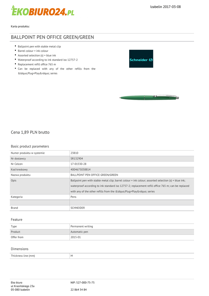 Izabelin 2017-03-08 Karta produktu: BALLPOINT PEN OFFICE GREEN/GREEN Ballpoint pen with stable metal clip Barrel colour = ink colour Assorted selection (s) = blue ink Waterproof according to ink standard iso 12757-2 Replacement refill office 765 m Can be replaced with any of the other refills from the “Plug+Play” series Cena 1,89 PLN brutto Basic product parameters Numer produktu w systemie 23810 Nr dostawcy SR132904 Nr Celcen 17-01530-28 Kod kreskowy 4004675038814 Nazwa produktu BALLPOINT PEN OFFICE GREEN/GREEN Opis Ballpoint pen with stable metal clip; barrel colour = ink colour; assorted selection (s) = blue ink; waterproof according to ink standard iso 12757-2; replacement refill office 765 m; can be replaced with any of the other refills from the “Plug+Play” series Kategoria Pens Brand SCHNEIDER Feature Type Permanent writing Product Automatic pen Offer from 2015-01 Dimensions Thickness line (mm) M Eko biuro ul Krasińskiego 23a 05-080 Izabelin NIP: 527-000-75-75 22 864 54 84 Izabelin 2017-03-08 Karta katalogowa produktu cd. BALLPOINT PEN OFFICE GREEN/GREEN Procurement vocabulary CPV 30192121-5 Długopisy kulkowe Certifications New product Standard Hit Standard Colour Colour Green Serdecznie zapraszamy do współpracy Eko biuro zespół. Eko biuro ul Krasińskiego 23a 05-080 Izabelin NIP: 527-000-75-75 22 864 54 84